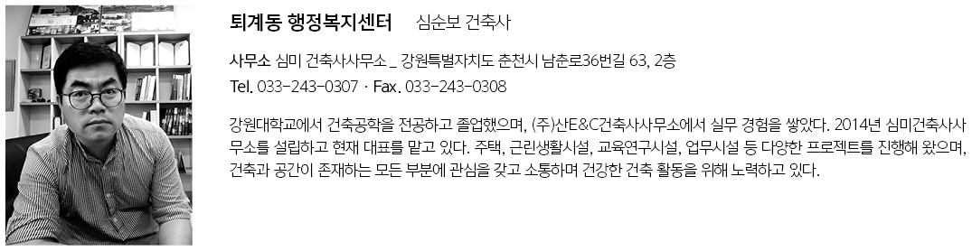 | 퇴계동 행정복지센터 설계자 | 장인수 _ 장인수 건축사사무소, 심순보 _ 심미 건축사사무소 건축주 | 춘천시 감리자 | (주)건축사사무소 유덕건축 시공사 | 더원종합건설 설계팀 | 이재용 설계의도 구현 | 장인수 건축사사무소 대지위치 | 강원특별자치도 춘천시 남춘로 주요용도 | 공공업무시설 대지면적 | 3,341.11㎡ 건축면적 | 1,604.32㎡ 연면적 | 4,988.53㎡ 건폐율 | 48.02% 용적률 | 80.48% 규모 | B1F - 4F 구조 | 철근콘크리트구조+철골구조+철골철근콘크리트구조 외부마감재 | 로이유리, M-Bar 내부마감재 | 석고보드 위 도장 설계기간 | 2020. 06 - 2021. 05 공사기간 | 2021. 06 - 2024. 07 사진 | 박우진 구조분야 | 원구조 기계설비·전기·소방분야 | 오성이앤씨 |