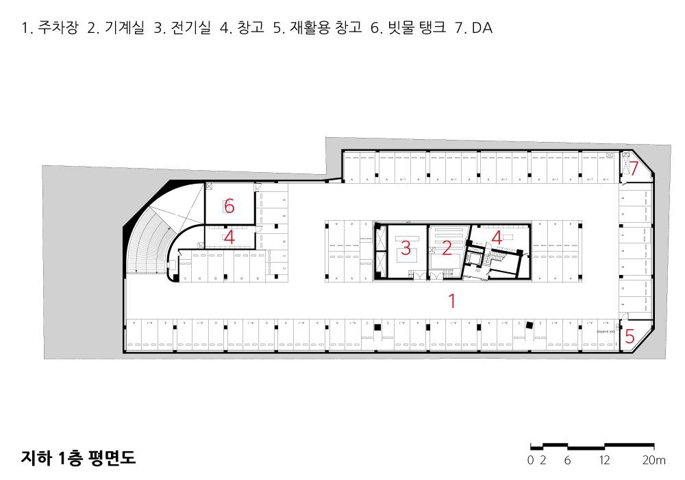 The site is divided into two areas by a road connecting the main road (Namchun-ro) and the commercial area road (Namchun-ro 5beon-gil). Each faces a different surrounding, one facing the city and the other facing the park. In order to form an open relationship with the surroundings, the part facing the city functions as a plaza(an extension of the city) that can accommodate various local events, and the part facing the park functions as a green space(an extension of the park) for the rest of nearby residents. The community center, located in between, mediates the dialogue between the two(the plaza and the green space) by minimizing the area of the building occupying the ground with a lever-like geometric composition. The cantilever overhangs the plaza and green space, providing attractive views towards the city and park, and is supported by steel trusses to allow free lower space uninterrupted by columns. The southeastern side facing the Gyeongchun Line is a huge reflector finished with reflective glass, which acts as a canvas to capture the exterior scenery(the panoramic view of the city) during the day, and as a screen to reveal the interior scenery(various cultural activities) to passers-by in the city at night. The external ramp connected to the green space, the penetrating staircase connected to the plaza, and the internal ramp crossing the atrium provide independent circulation to the resident space and the opportunity to experience the surroundings and the city from a new perspective.