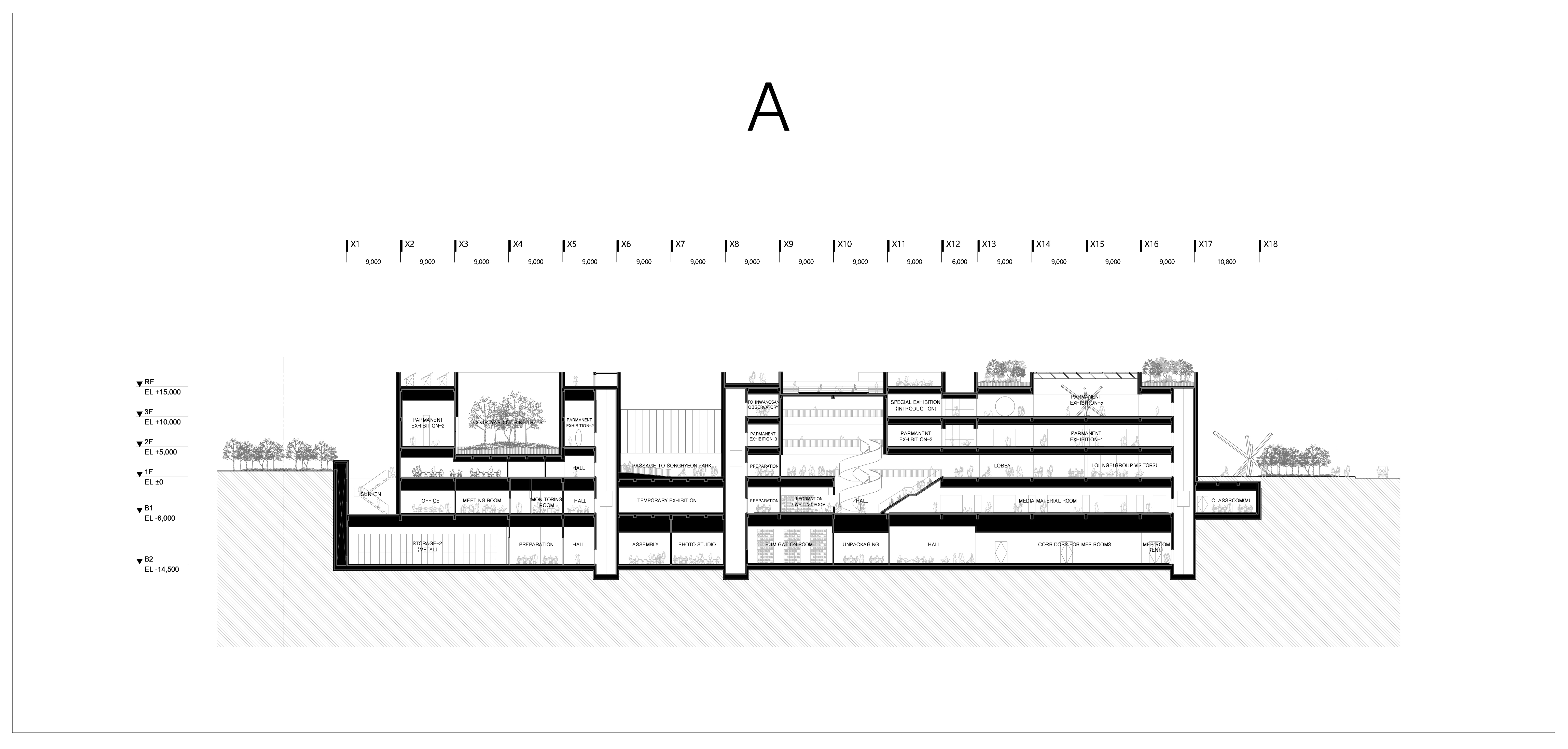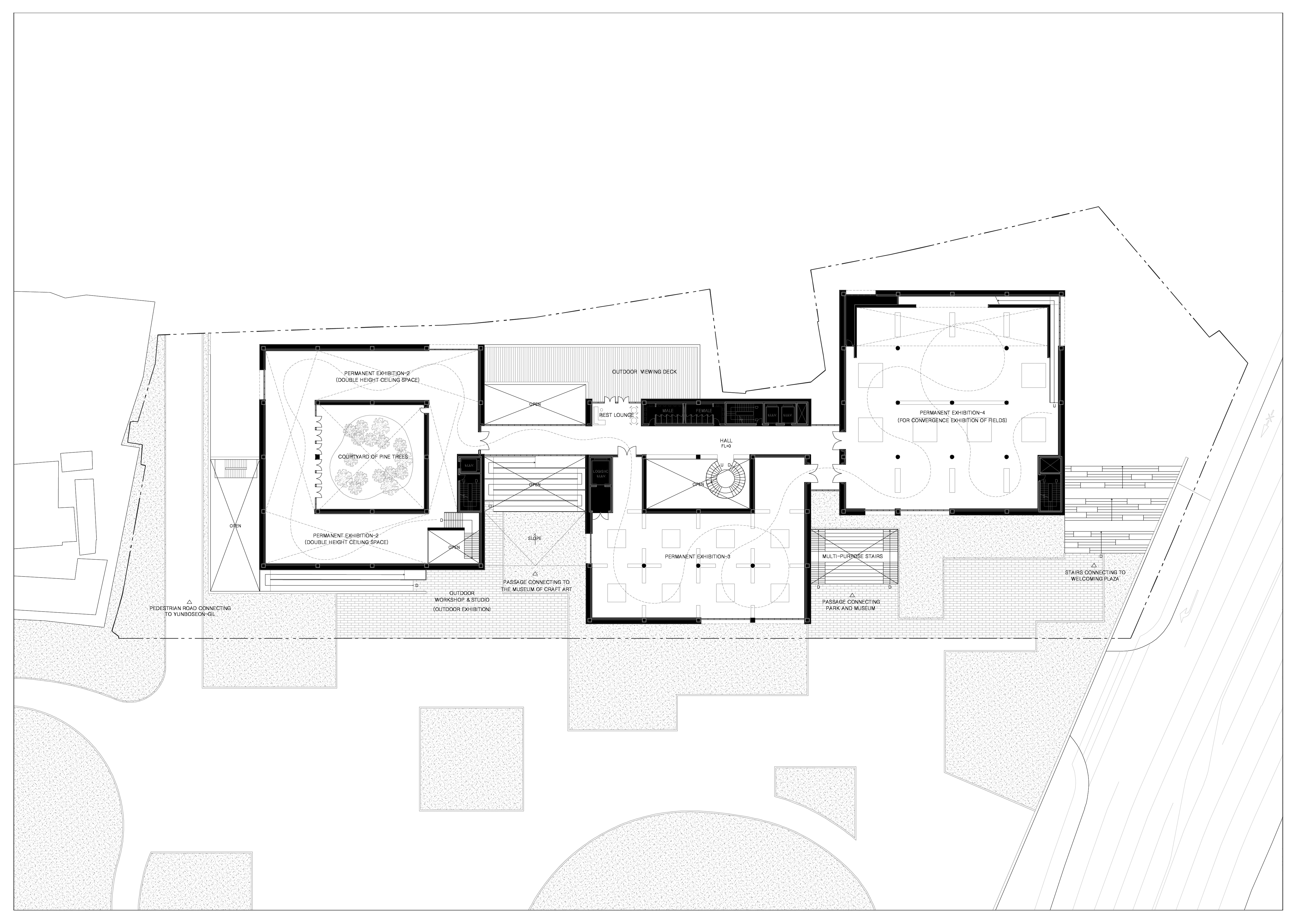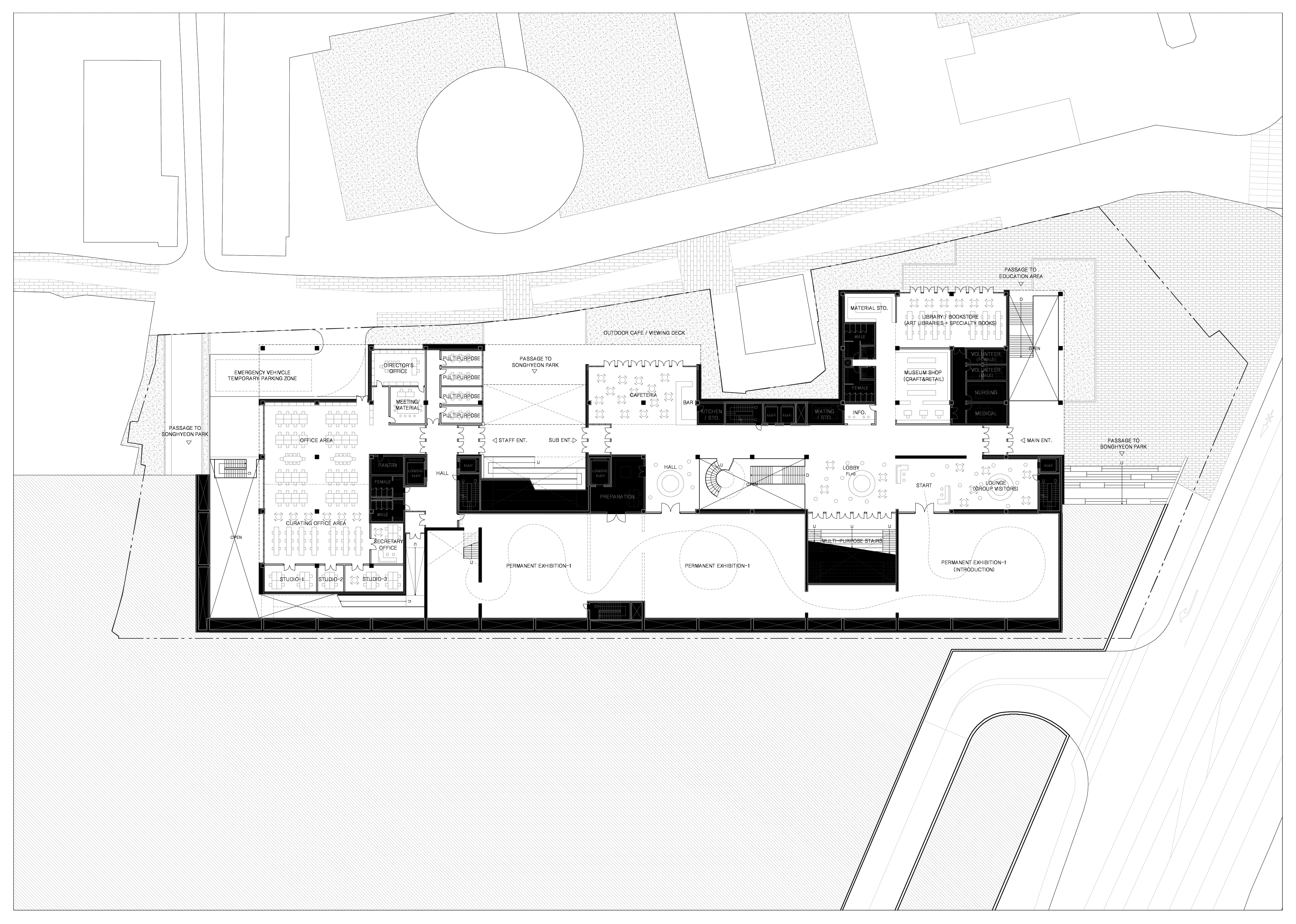 | 시간의 회복 _ 송현동 국립문화시설 건립사업 _ 2024. 10. 발주자 | 문화체육관광부 당선일자 | 2024년 10월 설계팀 | 김진화, 박종대 대지위치 | 서울특별시 종로구 송현동 48-24번지 일대 주요용도 | 문화 및 집회시설 대지면적 | 9,787㎡ 건축면적 | 5,808㎡ 연면적 | 25,071㎡ 건폐율 | 59% 용적률 | 121% 규모 | B2F - 3F 구조 | 철근콘크리트 구조 마감 | 탄화목, 노출콘크리트, 로이복층유리 |
