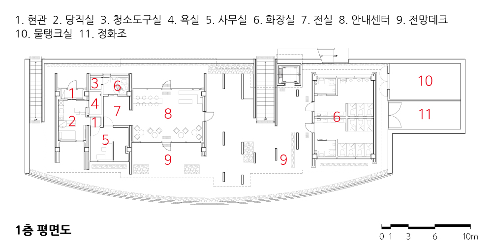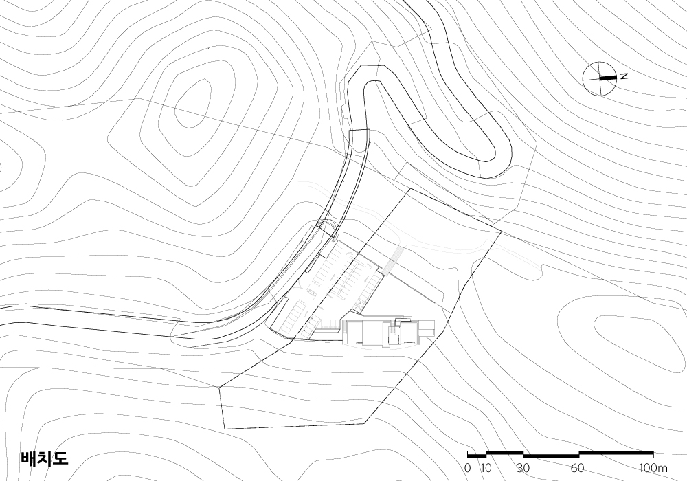 건축물은 방문객들을 위한 화장실과 휴게소 및 관리사무소의 역할을 한다. 여러 개로 나뉜 매스와 지붕들은 마치 바람에 밀린 듯 자연스레 앉아 있다. 각각의 다양한 프로그램을 담은 독립적인 매스들은 수평으로 이어지며 전개되고, 그 틀 안에서 자유롭게 배치되며 다채로운 외부 공간을 만들어 낸다. 매스들은 각 용도에 따라 다양한 높이를 갖는데, 레벨이 다양한 여러 개의 지붕들도 서로 엮이는 듯 중첩되면서 수평선을 이루고 있다. 이러한 지붕들은 겹겹이 쌓인 산의 모습과 마주하며, 자연물과 건조물 간 대조가 되는 듯하면서도 조화롭게 자리한다. 또한 빗물과 건물을 분리시키고 싶지 않았기에 각 지붕 슬래브 사이에 좁은 보이드를 주었다. 그 개구부를 통해 빗물은 바닥으로 그대로 떨어져 내리게 된다. 비가 내리는 날, 작은 폭포수를 볼 수 있도록.