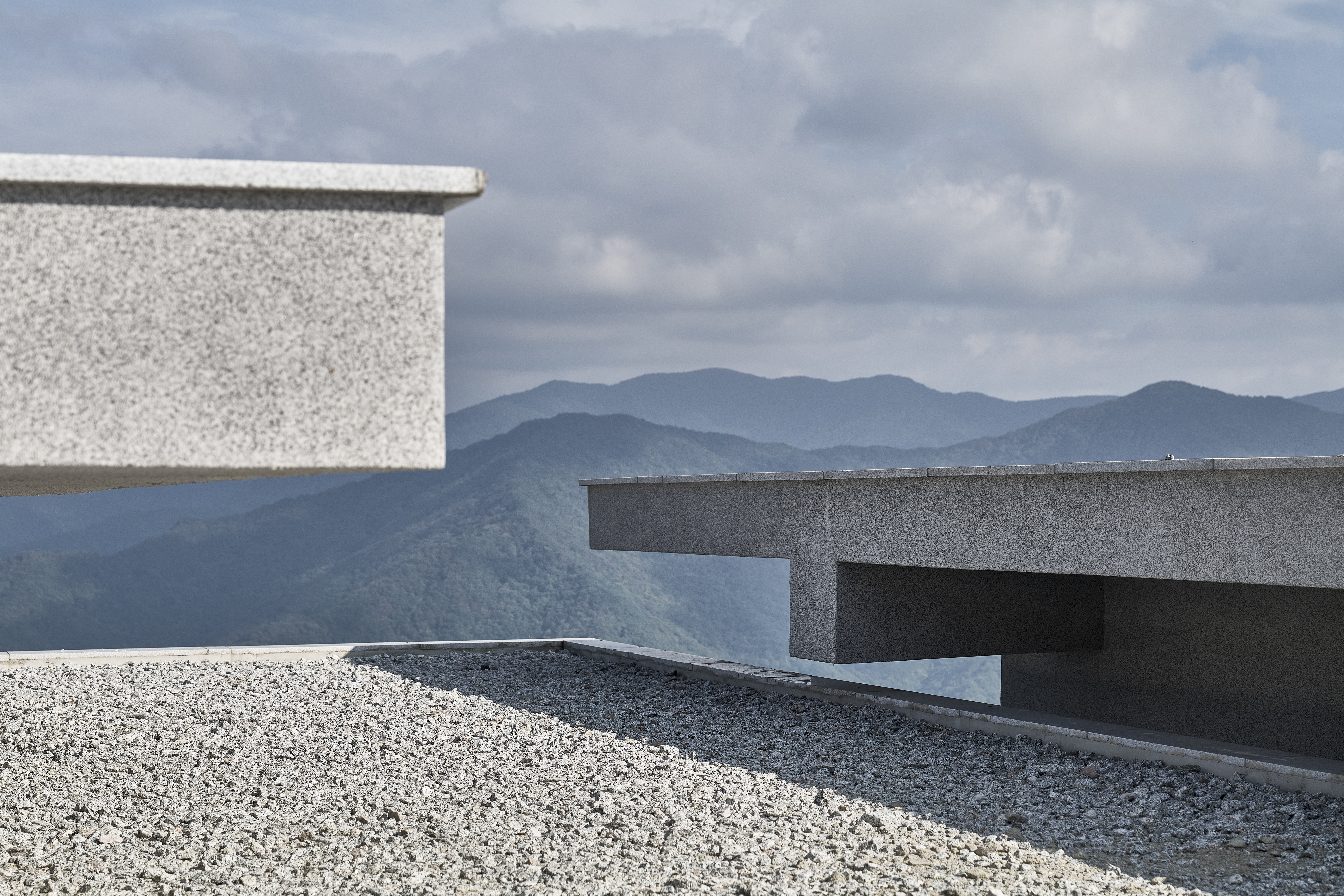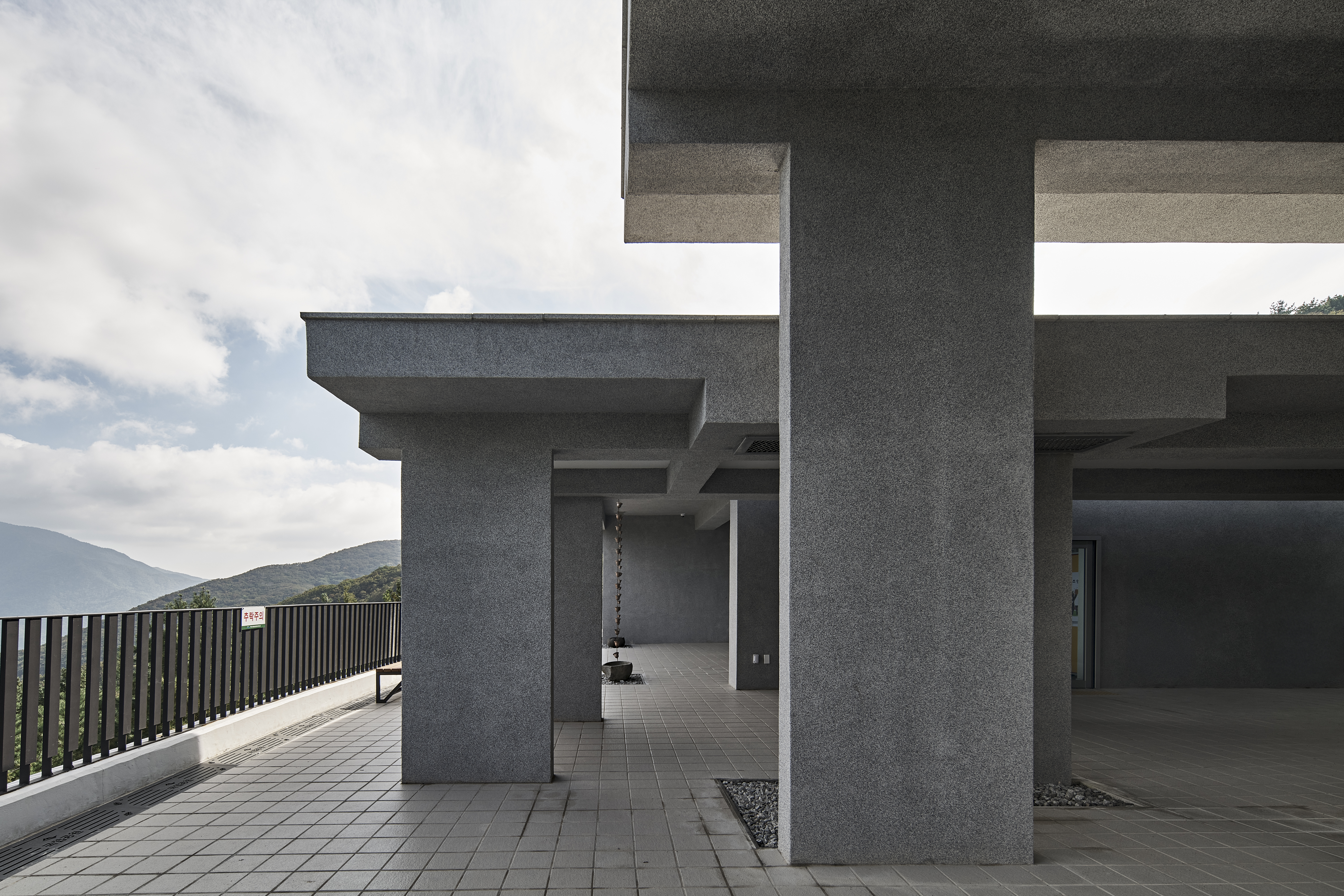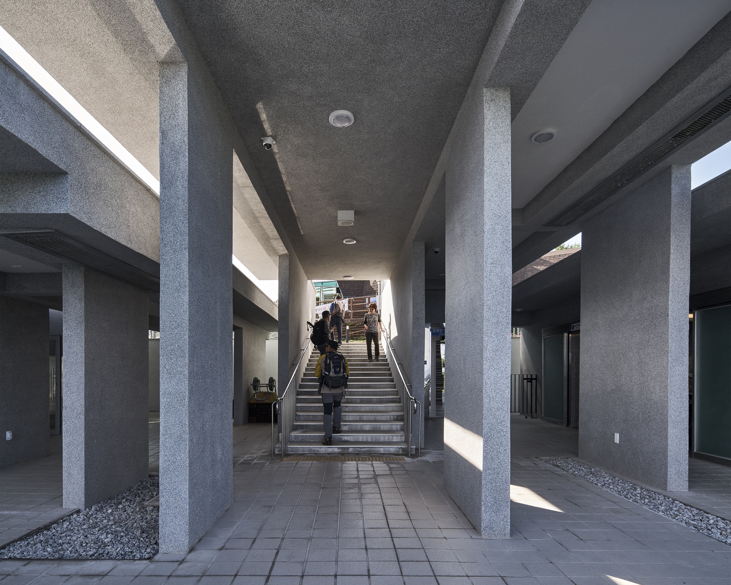 To make the building less conspicuous, a subdued grey tone was applied throughout. Stone-textured plaster was used to evoke a monolithic presence, minimizing joint lines. The unpolished elevations—featuring exposed beams of varying depths based on structural needs—evoke the feel of a modern-day mountain temple, or even a wind-shaped pine bent by years of enduring Jirisan’s harsh elements.