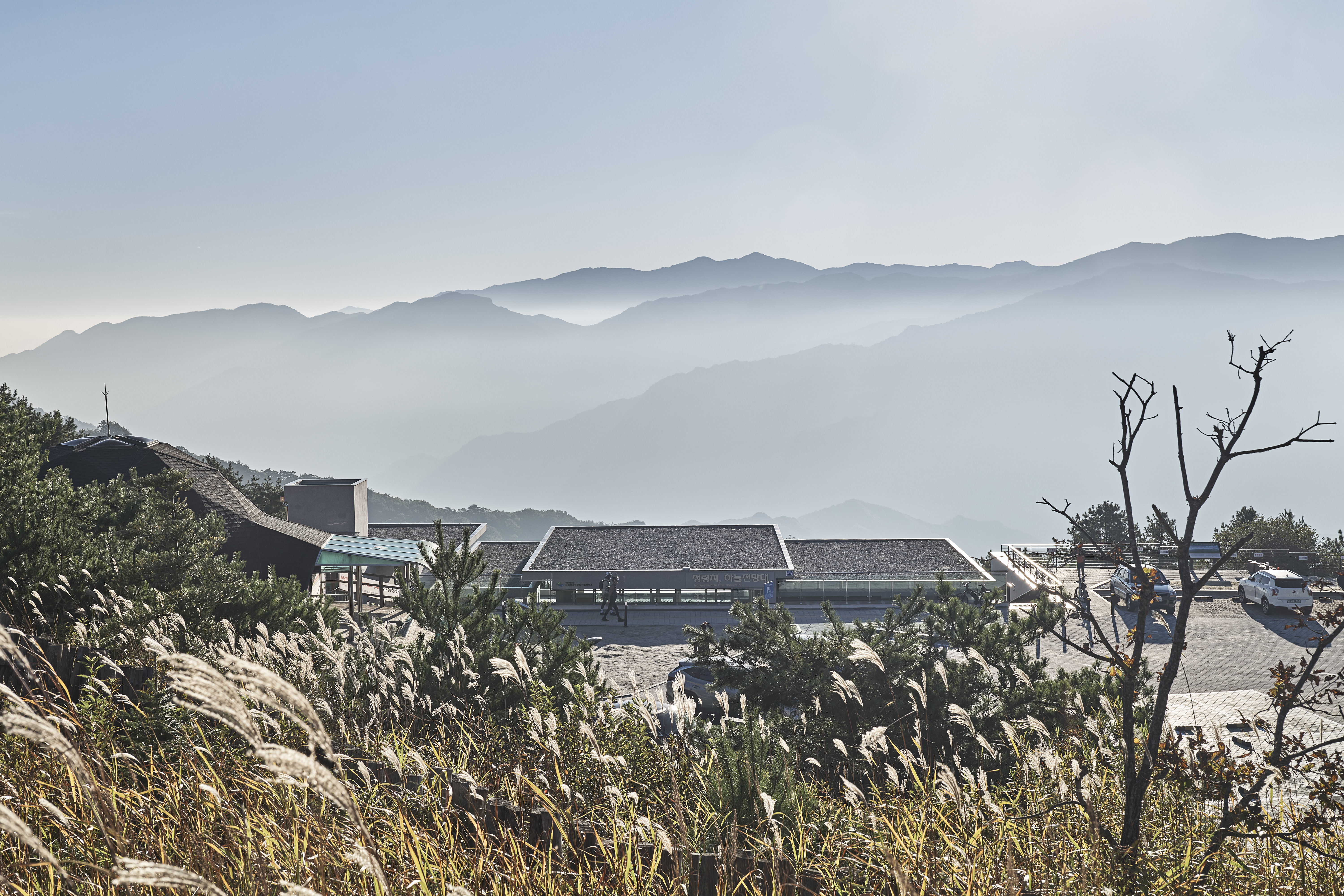 The structure does not rise proudly from the earth; instead, it adopts a posture of quiet descent into the slope. Upon arrival, visitors are first met with the roofline, not the mountain itself. Only by descending the stairs do they gradually come face to face with the vast landscape. This descent was designed to bring the mountain closer—physically and emotionally—than it seemed from the approach. While unsure whether such a concept would be accepted in the public sector, the Jirisan National Park Office in Jeonbuk welcomed and supported the idea wholeheartedly. Without the client’s architectural understanding, the usual challenges of public projects might have prevented this outcome.