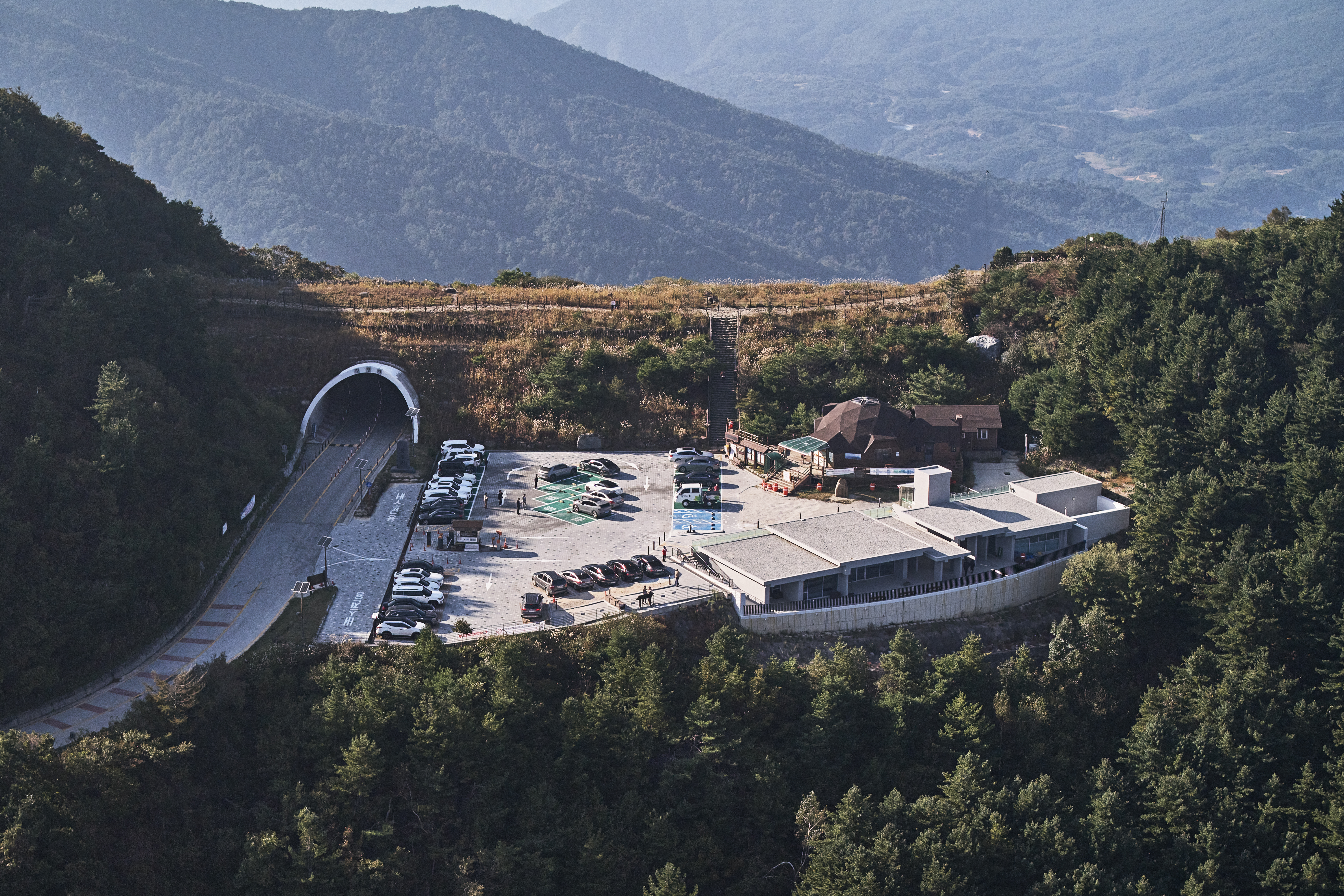 The current observatory site was established in the 1990s, using soil and rock excavated during the construction of the Seongsamjae parking lot to the south. The first Jeongryeongchi rest stop was completed in 1995-Korea’s first such facility within a national park. Lacking domestic precedents, the design was likely influenced by rest facilities in overseas national parks, resulting in a dome-shaped timber structure.