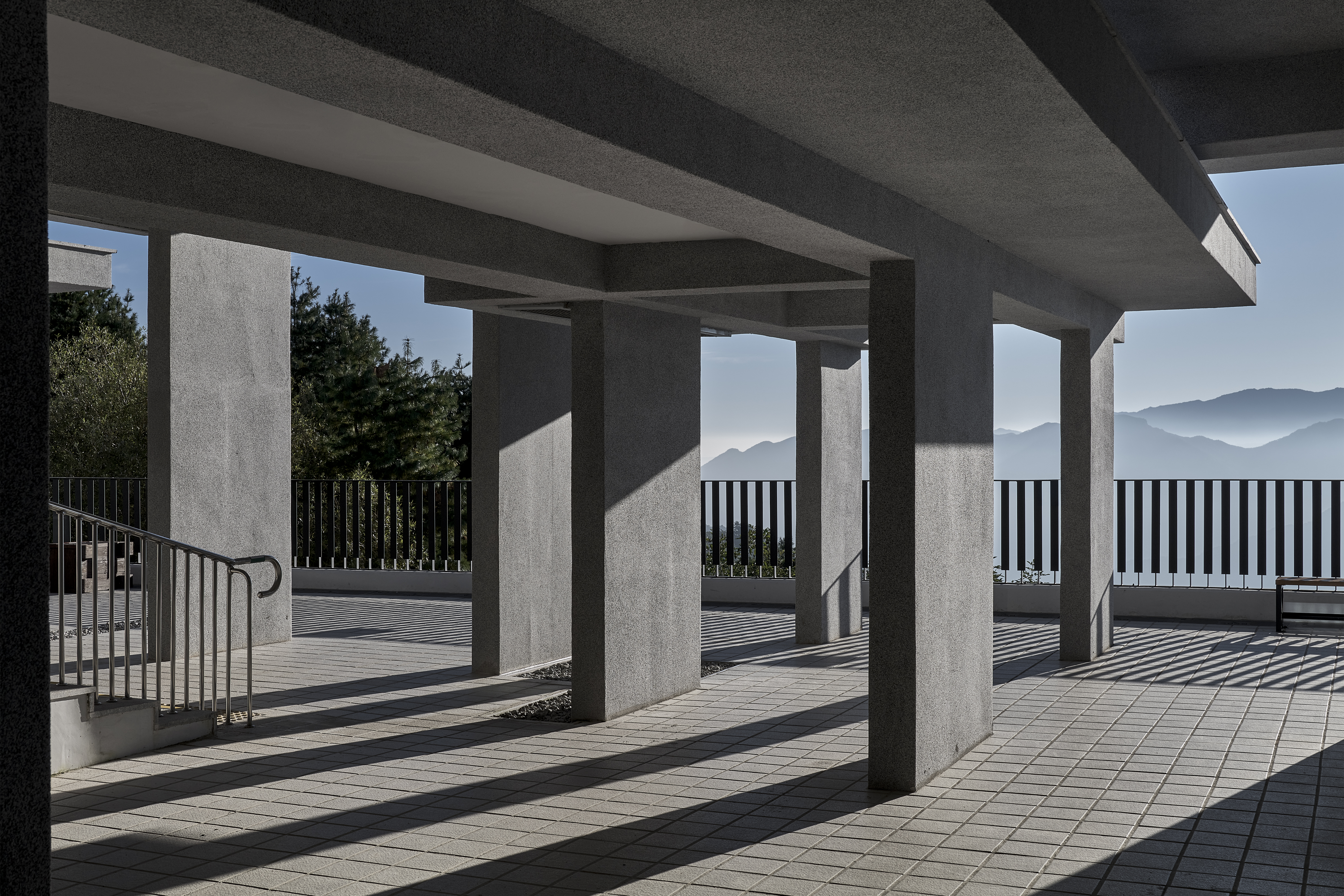 To integrate rain into the architectural experience rather than repel it, narrow voids were inserted between roof slabs, allowing rainwater to fall freely to the ground—creating small, waterfall-like moments on rainy days.