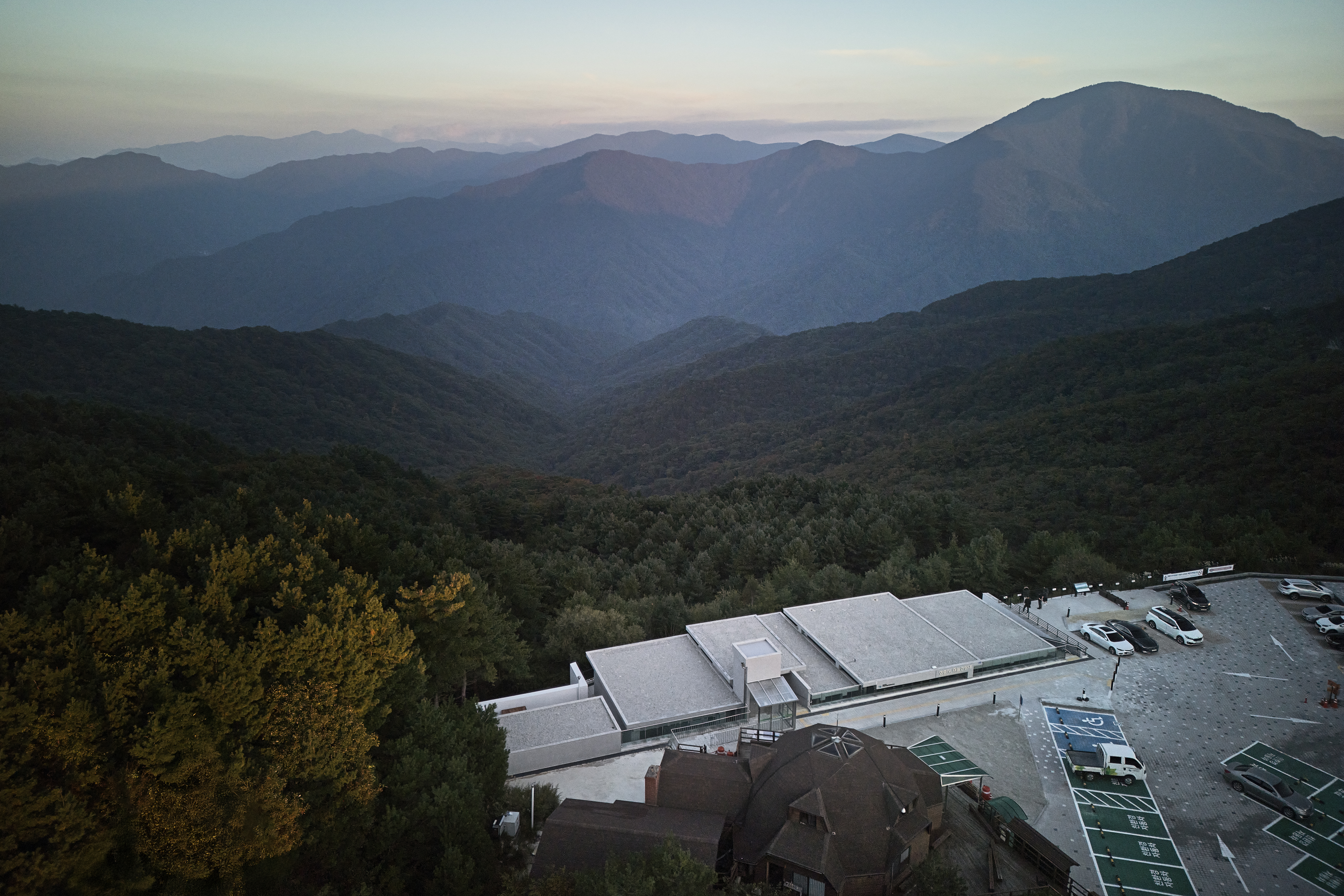 The structure does not rise proudly from the earth; instead, it adopts a posture of quiet descent into the slope. Upon arrival, visitors are first met with the roofline, not the mountain itself. Only by descending the stairs do they gradually come face to face with the vast landscape. This descent was designed to bring the mountain closer—physically and emotionally—than it seemed from the approach. While unsure whether such a concept would be accepted in the public sector, the Jirisan National Park Office in Jeonbuk welcomed and supported the idea wholeheartedly. Without the client’s architectural understanding, the usual challenges of public projects might have prevented this outcome.