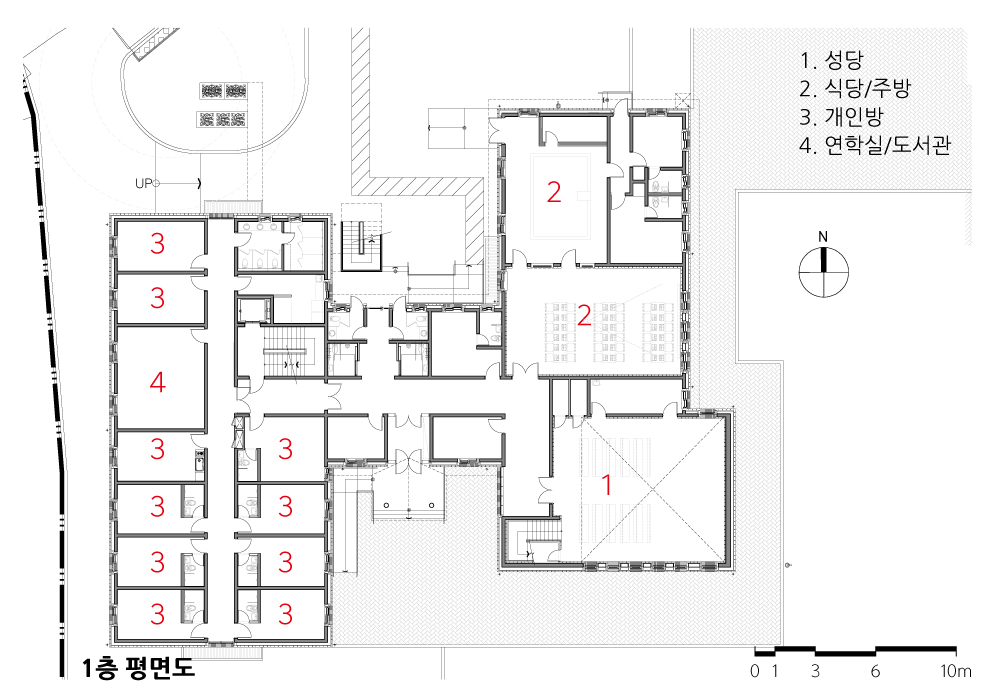 대지에 있던 찜질방 구조물을 철거하고 수도원을 계획하면서 기존 건축물의 지하에 있던 기계실과 일부 시설은 재활용하여 수도원의 기계실과 다목적실로 사용을 고려하면서 배치계획을 진행했다.