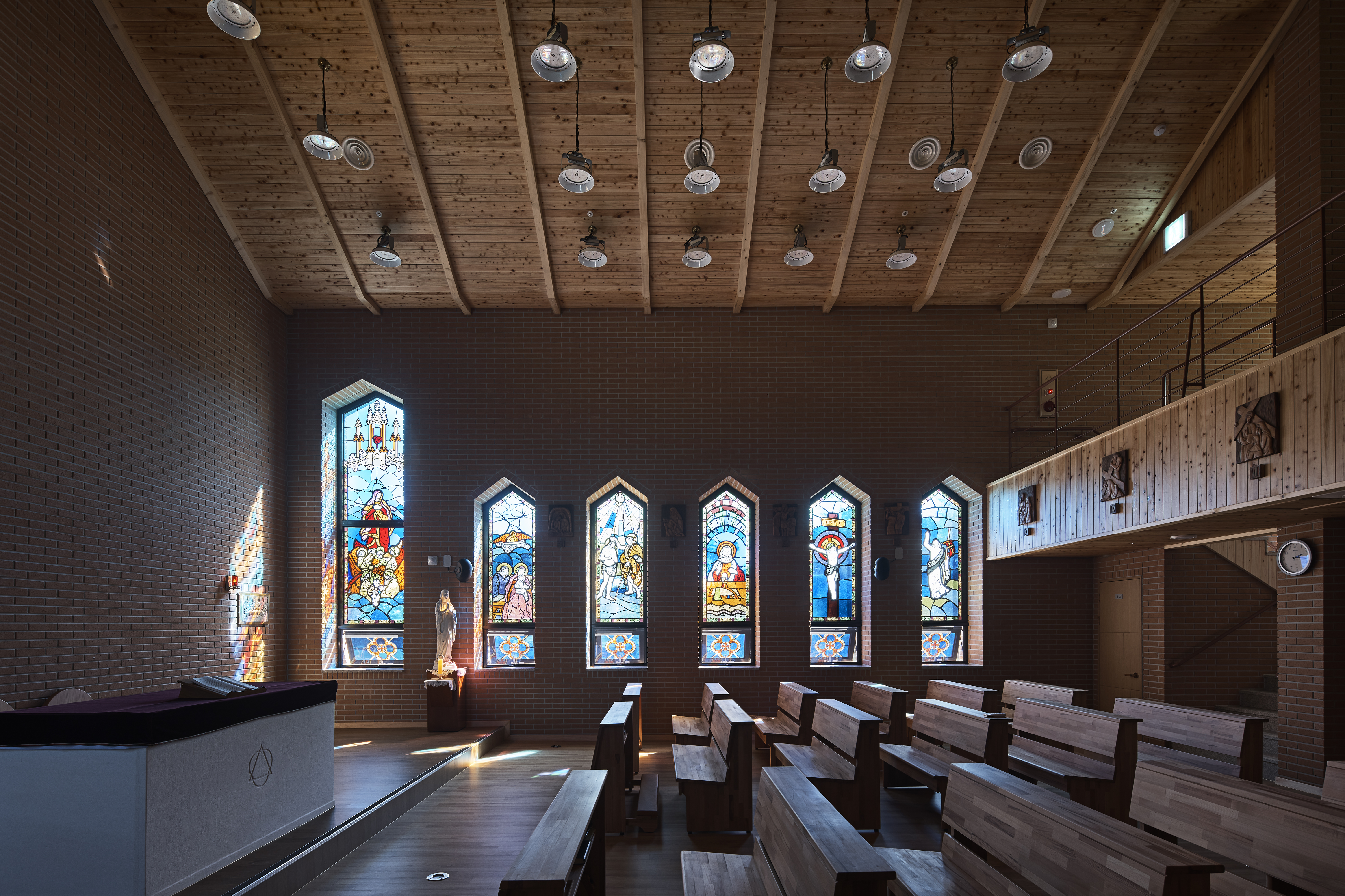 주요 외장재로 벽체는 점토벽돌, 지붕에는 동판을 사용하여 종교시설 사용자의 요구사항이 만족되도록 입면계획을 했다. 하지만 사용자의 요구에 맞춰 단순히 외장재로 벽돌을 사용하는 것이 아니라 외부에서 보이는 벽돌 모듈과 내부 공간에도 벽돌을 사용하는 것을 제안했다.