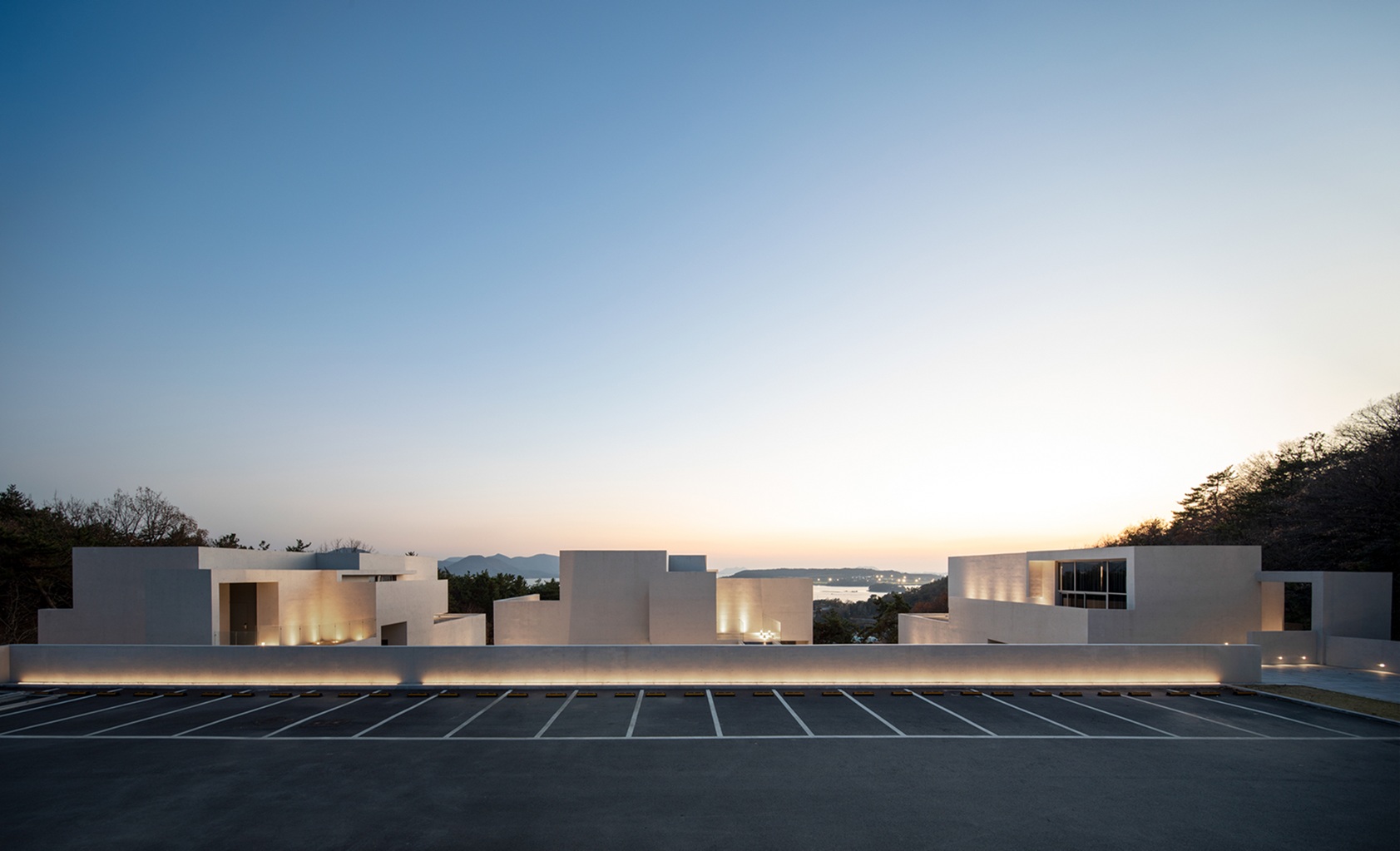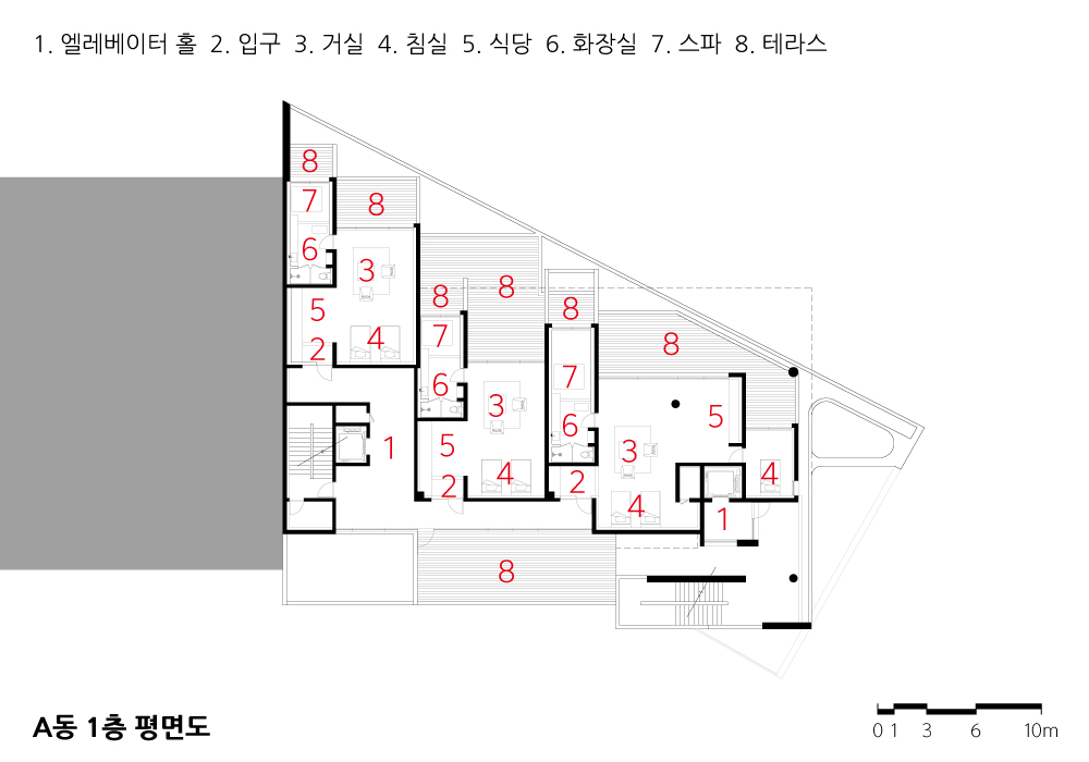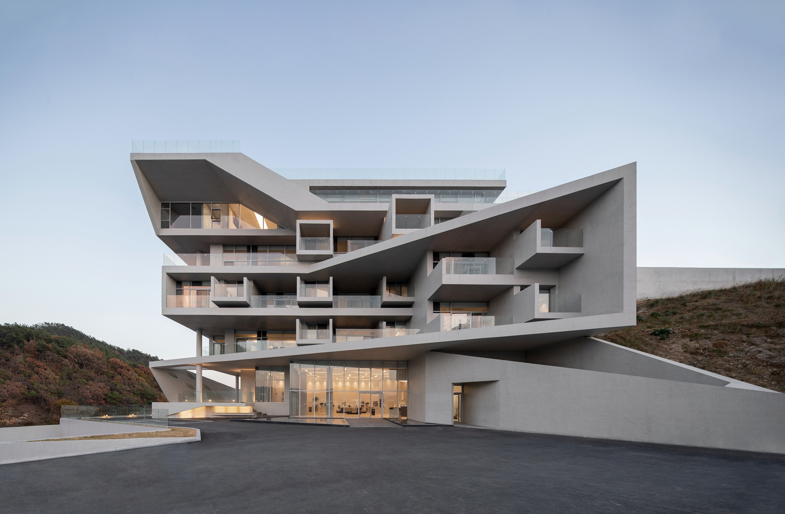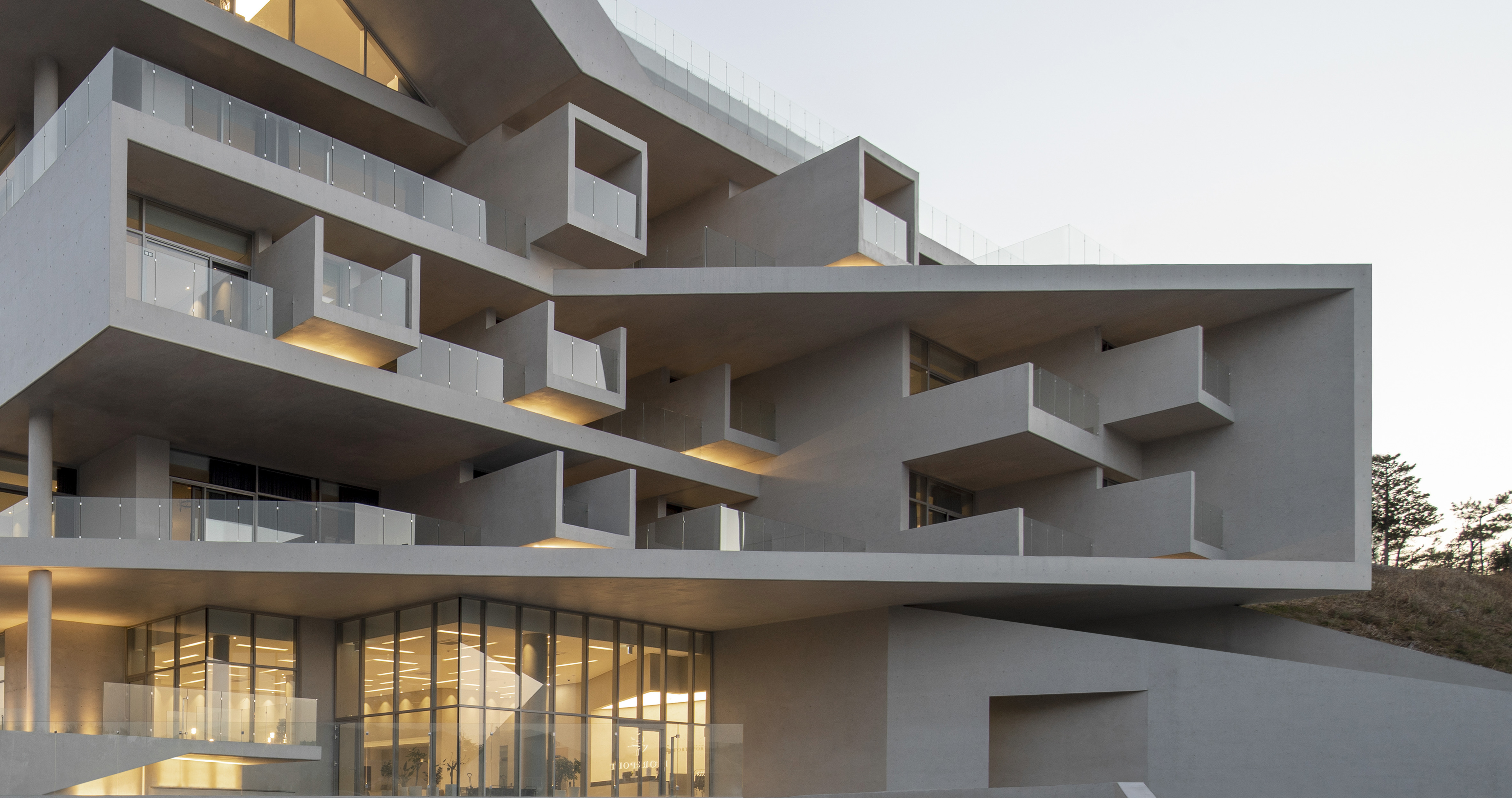 단지 배치는 도시 스카이라인을 한눈에 조감할 수 있는 타워형 A존(zone)과 자연 속 휴양을 위한 단독 숙박형 B존으로 구성되어 있다. A존의 1층은 카페 이용객과 숙박객들을 위한 리셉션 룸과 주야(晝夜)로 도시 전망을 즐기기 위한 숙박시설로 구분된다. 각각의 단위 유닛은 다이닝 룸과 연계하여 야외 식사, 파티를 위한 테라스로 기능한다. 테라스와 접한 스파 외부 매스는 세대 간 프라이버시를 확보하고 특별한 파사드를 보여준다. 큰 프레임 안에서 퇴창처럼 돌출한 개별유닛의 집합적 구성은 계절과 시간에 따라 변화하는 자연과 건축의 협주와 같다.