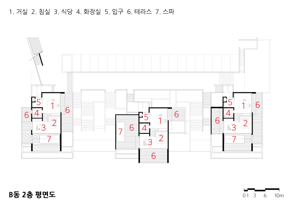단독 숙박형 B존은 경사 지형을 이용한 설계다. 3개 동으로 분리된 각 동의 사이 공간은 각 세대와 인접한 커뮤니티 공간이다. 이 공간의 주요한 목적은 각 세대에 채광과 환기를 원활하게 하여 내부 환경을 지상 조건과 유사하게 조성하기 위함이다. 각 동 사이에 만들어진 외부 공간은 숙박객들을 환대하기 위한 건축적 장치다. 넓게 펼쳐진 데크는 바람과 숲의 고요한 움직임, 먼바다의 광활함을 경험하는 외부 휴양공간이다.