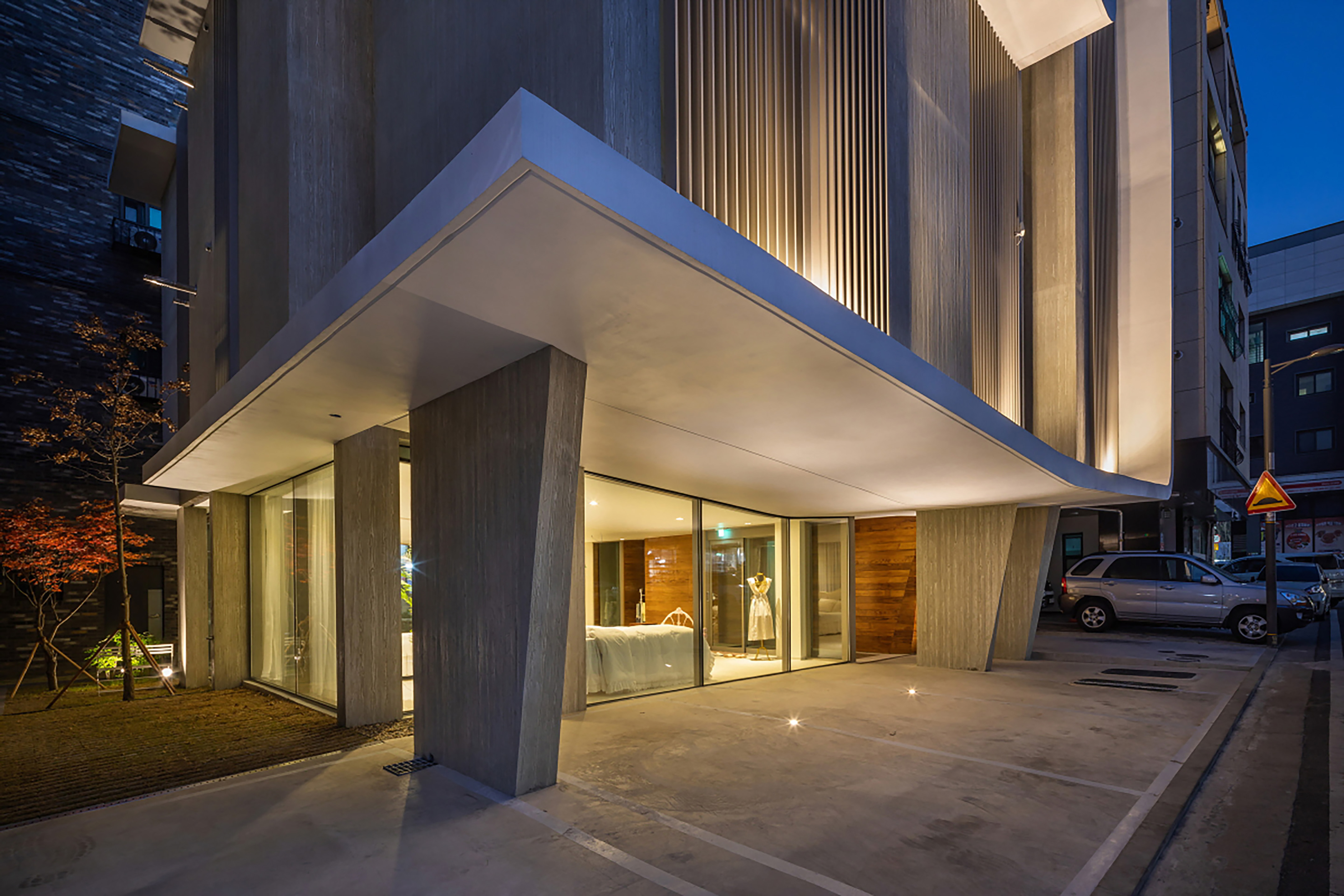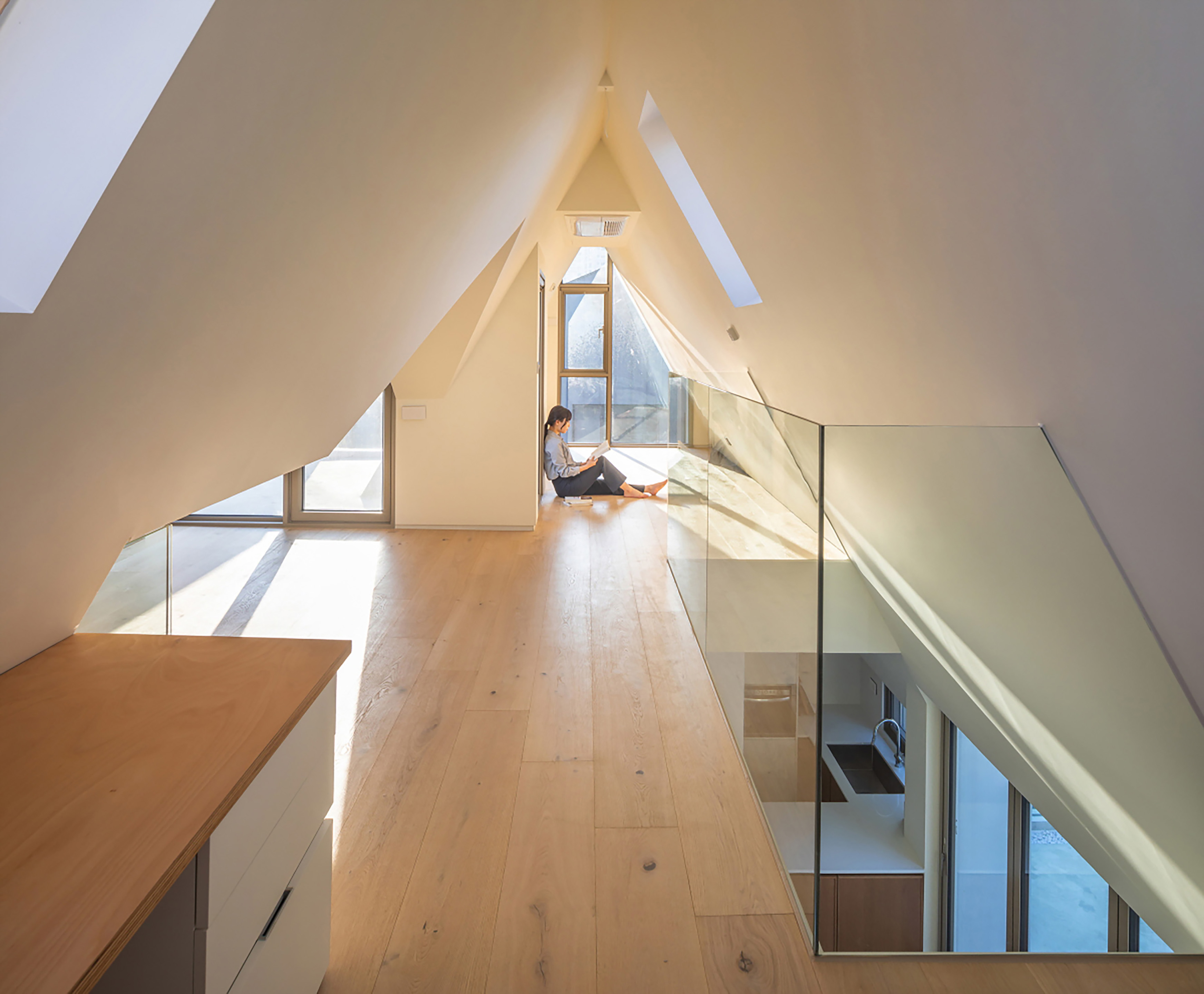 The building serves both as a residence and a showroom for the home fashion brand With Home, operated by the client. To resolve the constraints of a sloped façade required by the daylight setback regulation the design employed an iconic pentagon-shaped gabled form, universally associated with the symbol of a home. This formal gesture was not merely a response to regulation but an intentional architectural branding strategy.