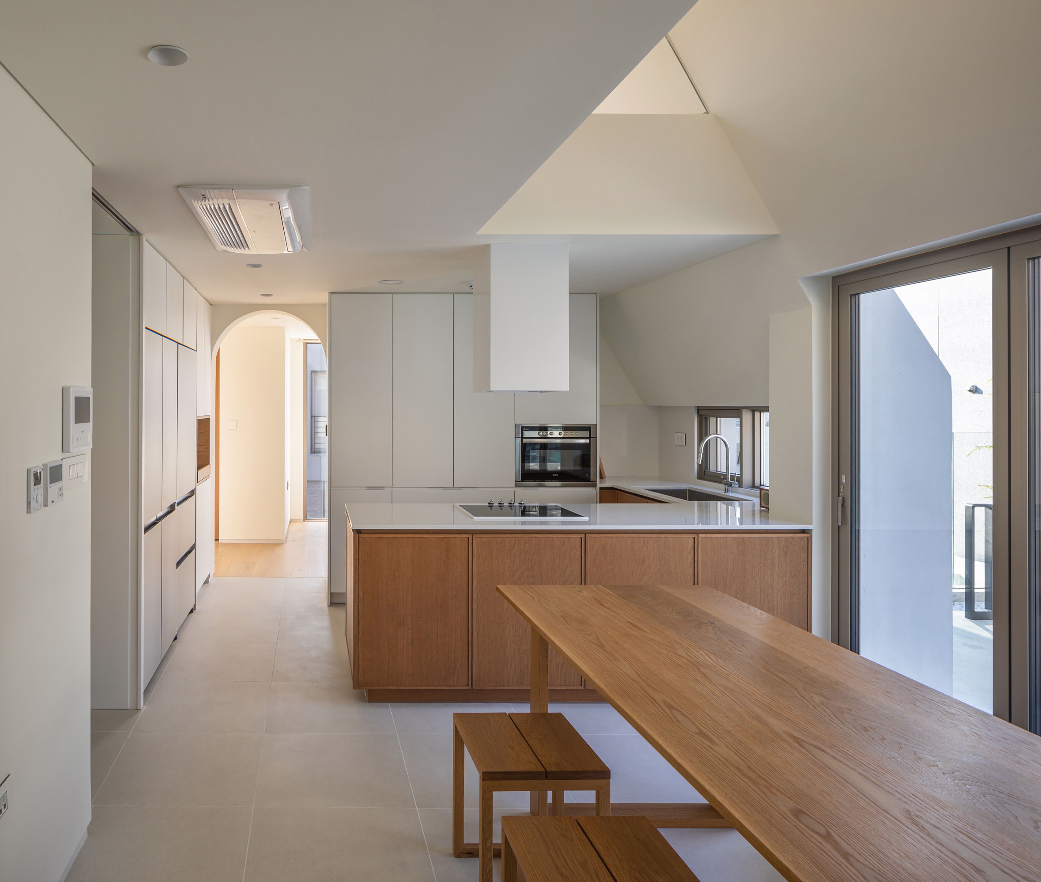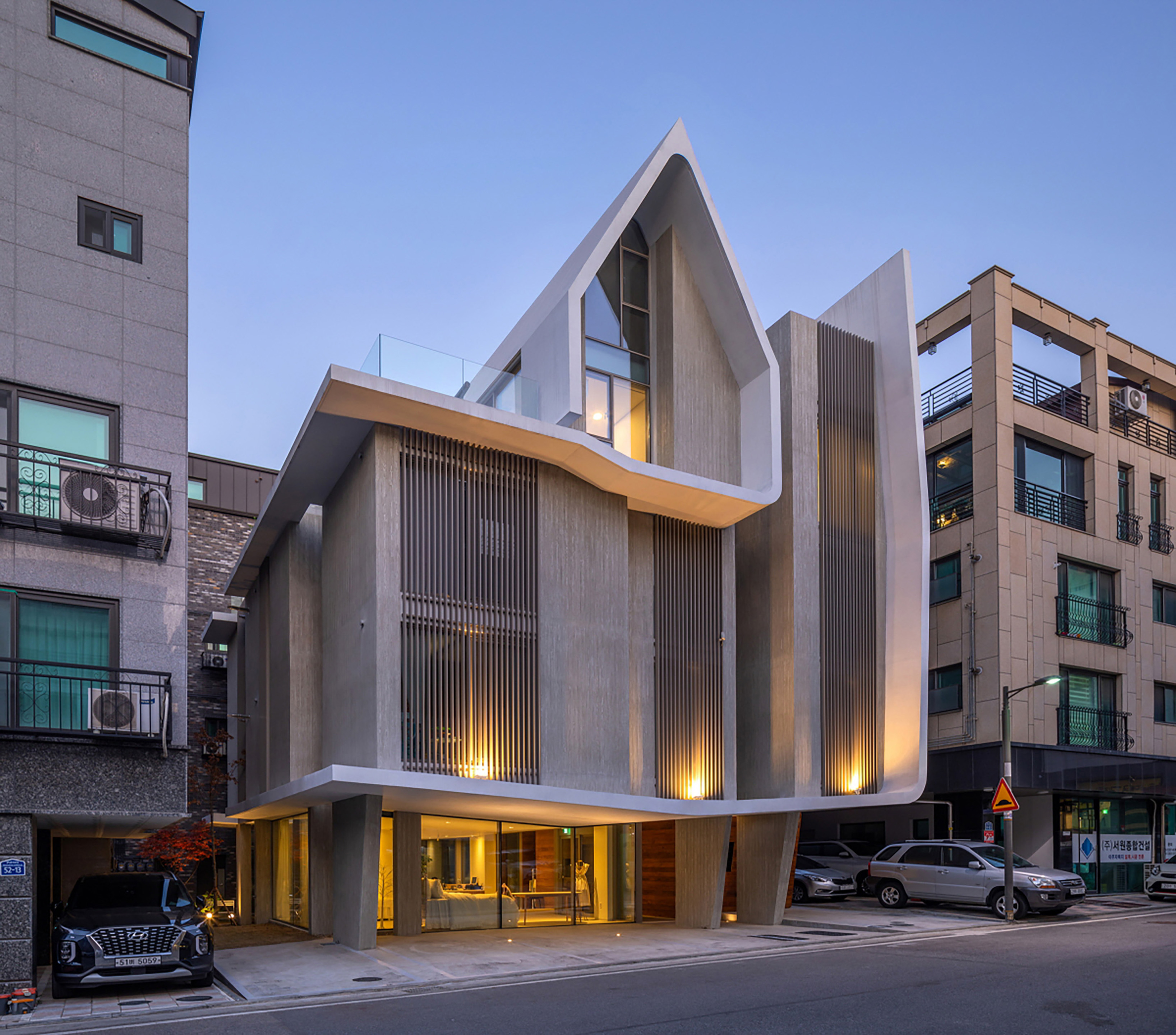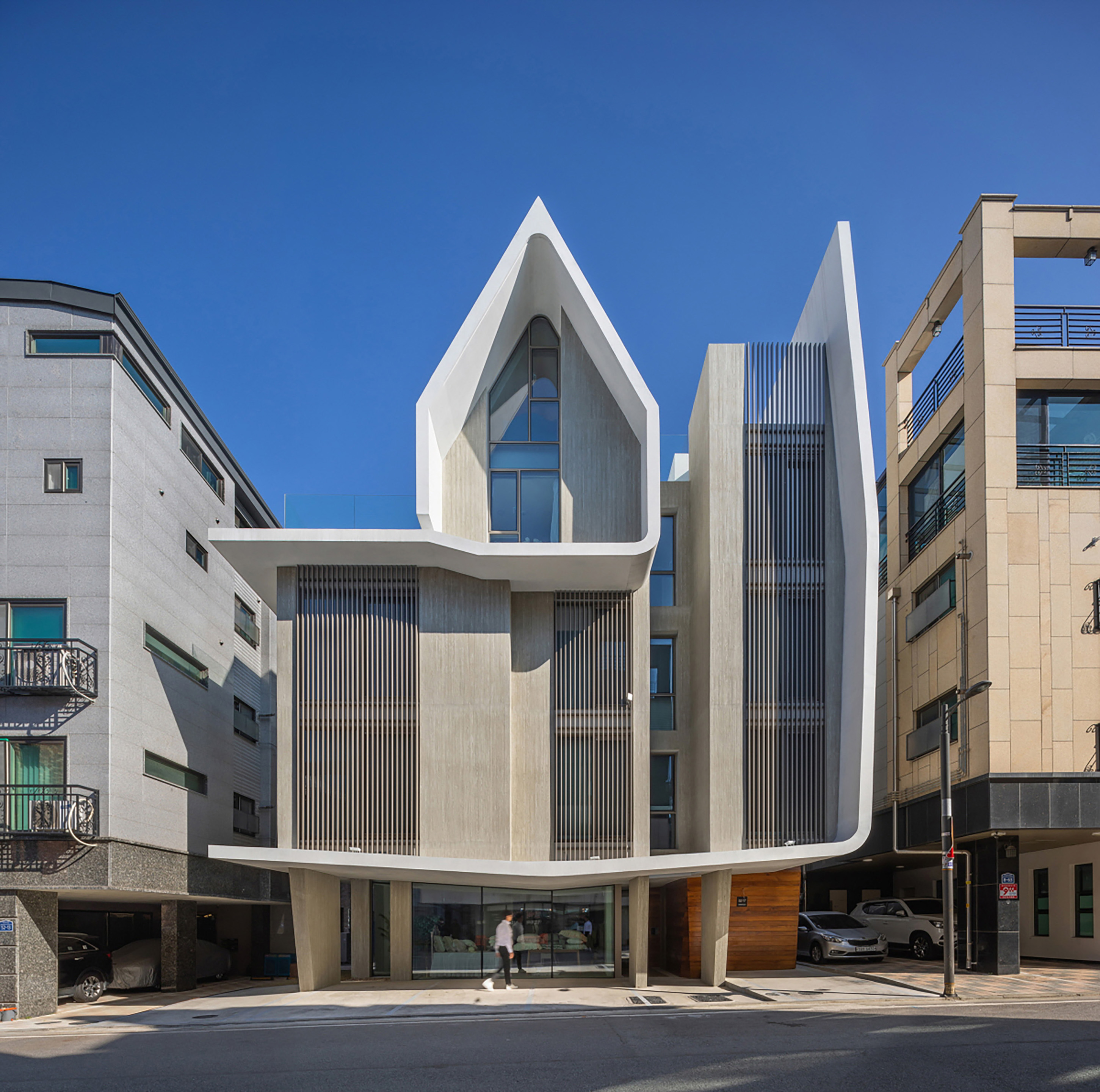 The building serves both as a residence and a showroom for the home fashion brand With Home, operated by the client. To resolve the constraints of a sloped façade required by the daylight setback regulation the design employed an iconic pentagon-shaped gabled form, universally associated with the symbol of a home. This formal gesture was not merely a response to regulation but an intentional architectural branding strategy.