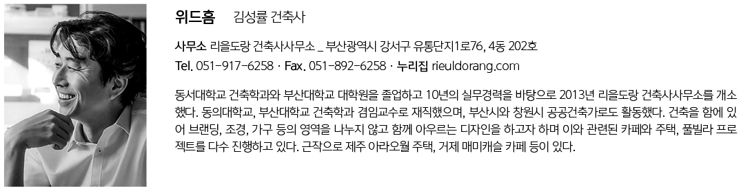 | 위드홈 설계자 | 김성률 _ 리을도랑 건축사사무소 건축주 | 문혜영 감리자 | 리을도랑 건축사사무소 시공사 | (주)콘크리트 공작소 대지위치 | 경기도 구리시 갈매동 주요용도 | 단독주택, 제1종근린생활시설 대지면적 | 252.00㎡ 건축면적 | 149.42㎡ 연면적 | 490.48㎡ 건폐율 | 59.29% 용적률 | 194.63% 규모 | 4F 구조 | 철근콘크리트구조 외부마감재 | 송판노출콘크리트 내부마감재 | V.P 페인트 설계기간 | 2019. 09 - 2018. 02 공사기간 | 2018. 08 - 2020. 09 사진 | 윤준환 구조분야 | SDM구조기술사사무소 기계설비·전기·소방분야 | JS ENG |