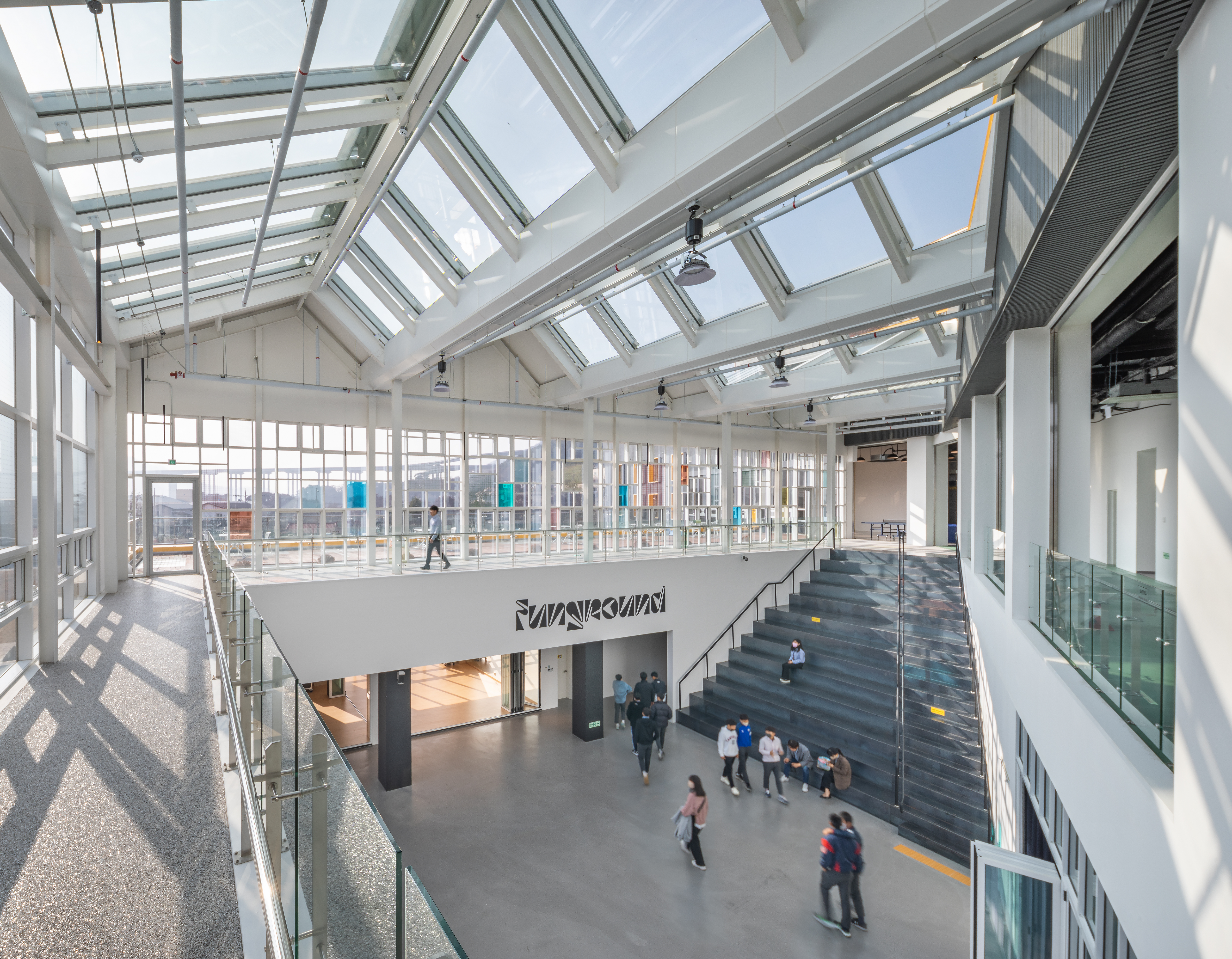 The atrium moderates sunlight and wind, positively influencing the adjacent interior spaces and creating an optimal environment for youth activities.