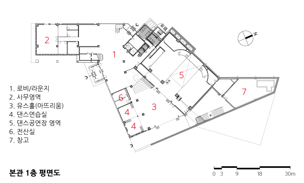 댄스, 놀이공간, 사무공간, 식당카페, 숙소공간 4개의 영역을 명쾌하게 조닝하여 프로그램이 원활히 작동되도록 했다.