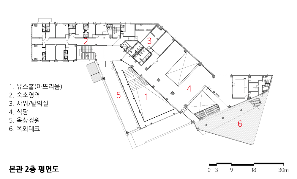 외부 확장 증축 없이 기존 전시관을 활용해 댄스 공연장과 프로그램실, 숙소를 배치하기에 어려움이 있었고, 본관동과 별관동 건물이 두 동으로 나뉘어 있어 프로그램 연계가 쉽지 않았다. 그런 단점을 극복하기 위해 본관동에 유스호스텔의 프로그램을 모두 담고 별관동은 세미나, 연수 기능으로 활용했다.