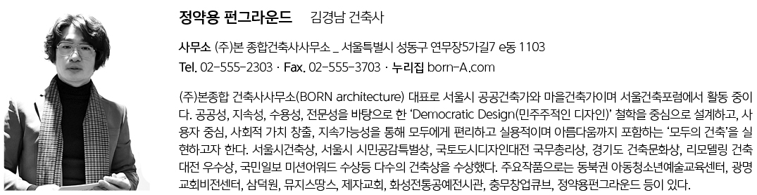 | 정약용 펀그라운드 세계최초 댄스특화 유스센터 설계자 | 김경남 _ (주)본 종합건축사사무소 건축주 | 남양주시 청년정책과 감리자 | 남양주도시공사 시공사 | (주)성공토건 설계팀 | 김경남, 조성현, 이유숙, 정하라, 전은지 대지위치 | 경기도 남양주시 조안면 삼봉리 주요용도 | 수련시설, 문화 및 집회시설 대지면적 | 34,680.00㎡ 건축면적 | 3,306.95㎡ 연면적 | 5,573.47㎡ 건폐율 | 11.81% 용적률 | 15.94% 규모 | B1 - 3F 구조 | 철근콘크리트구조 / 철골구조 외부마감재 | 칼라강판(1.0T LUXTEEL PANEL) 내부마감재 | EX메탈, 칼라몰탈, 목재흡음패널, 친환경수성페인트 설계기간 | 2019. 12 - 2020. 08 공사기간 | 2020. 10 - 2022. 10 사진 | 윤준환 구조분야 | (주)세영건설구조 기계설비·전기·소방분야 | (주)태영이엠씨 |