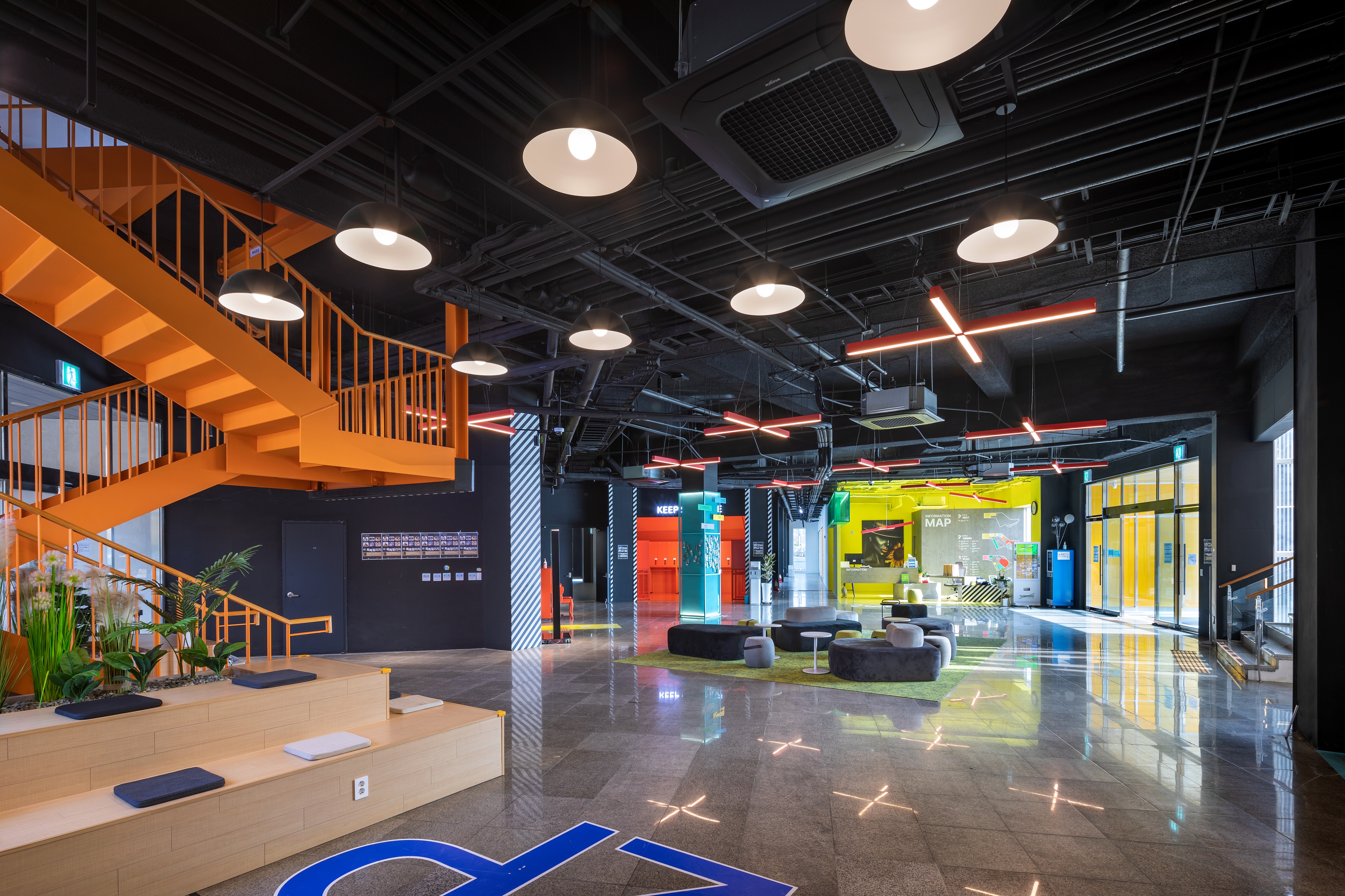 유스홀 내부 플레이스텝과 가변적인 외벽을 통해 지상 2층과 외부 객석, 야외마당이 공간적으로 연계되고, 내부에서는 공연장과 놀이시설이 하나로 연결되어 대공간으로 확장해 사용하며 필요시 개별적으로 사용이 가능하도록 가변성을 극대화했다.