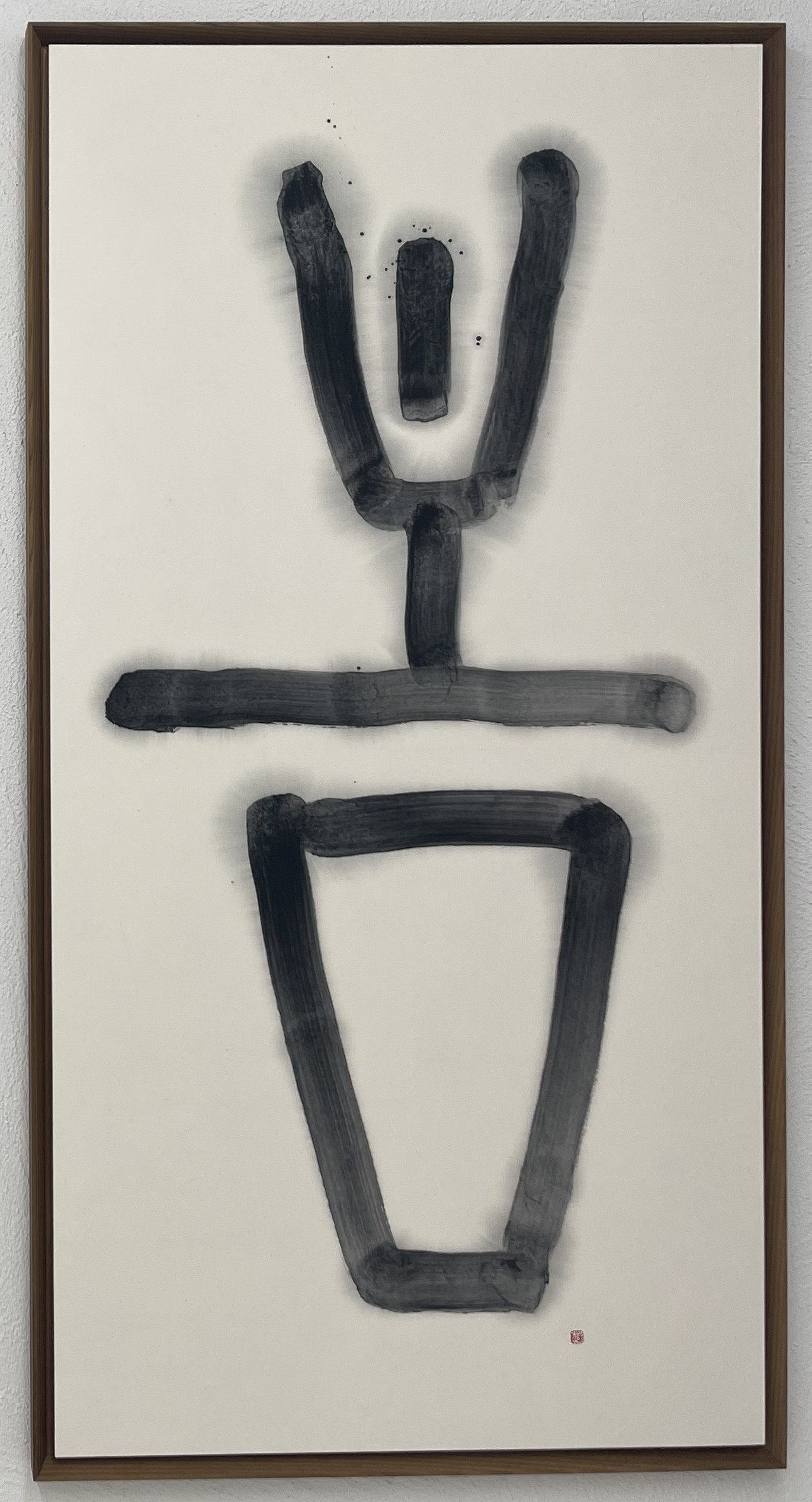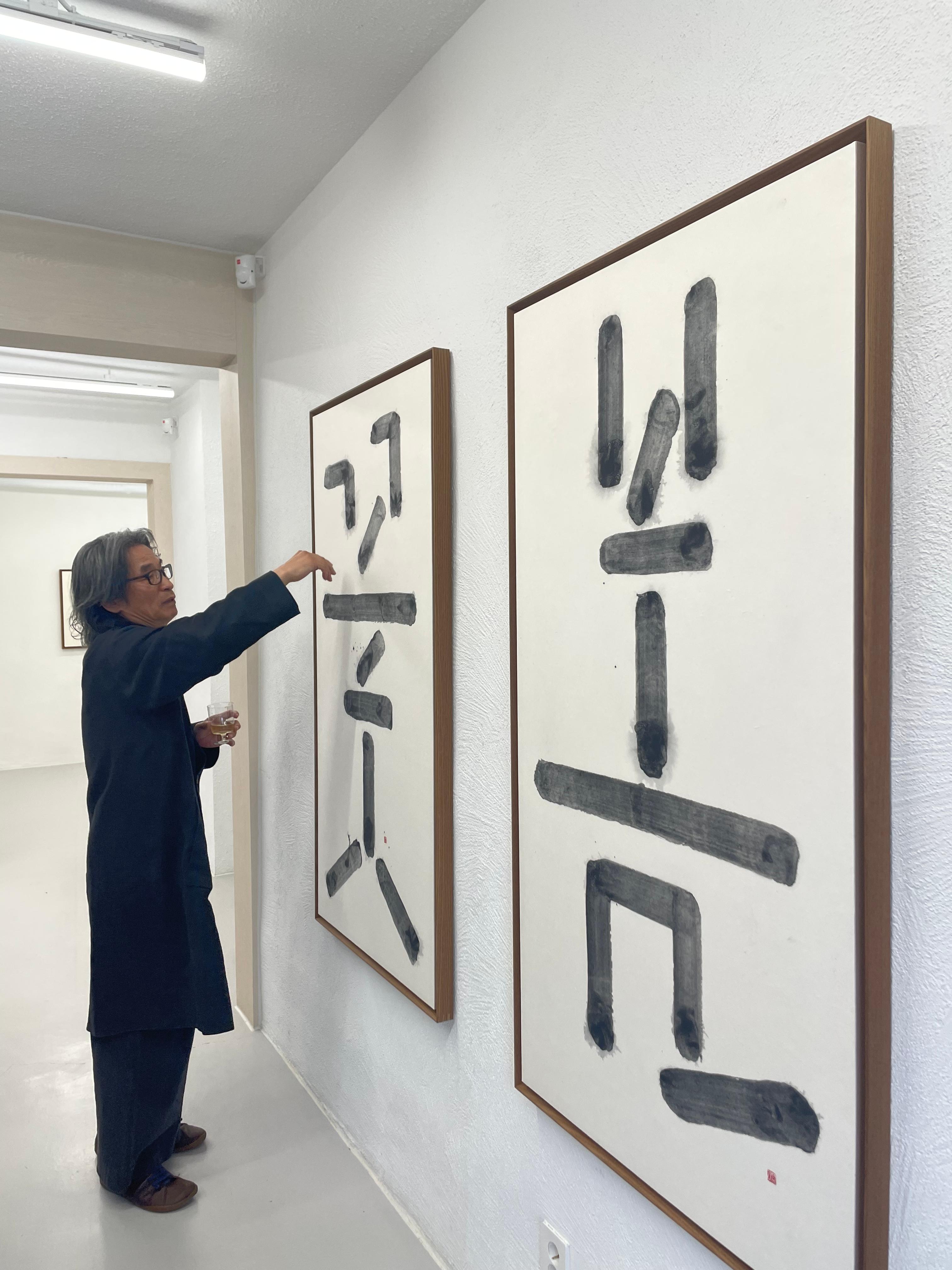 이번 전시회의 제목이 ‘획의 변주, 해체로부터’인 이유는 글자를 이루는 획이 기호를 이루는 단위 요소에서 탈피해, 즉 기호를 해체해 그 자체가 예술적 표현물이 되겠다는 의지를 보여준 것이 아닌가 싶다. 이 작품의 제목은 <하늘 사람 땅>이다. 이것은 한글의 창제 원리를 표현한 것이지만, 또한 그 하나하나가 문자의 기호라기보다 비구상의 그림에 더 가깝다. 나는 이 작품에서 뜻을 읽어내기보다 먹의 농담에 더욱 집착하게 된다.<사진 9> 즉 지시의 기표가 아닌 표현의 기표를 더욱 읽고 있는 것이다.