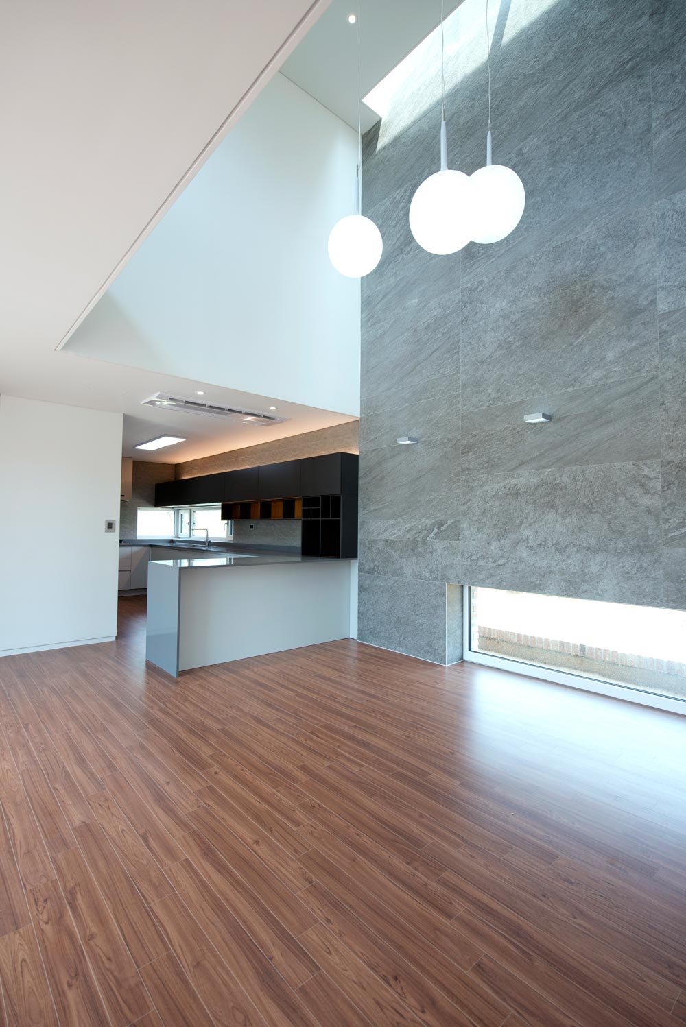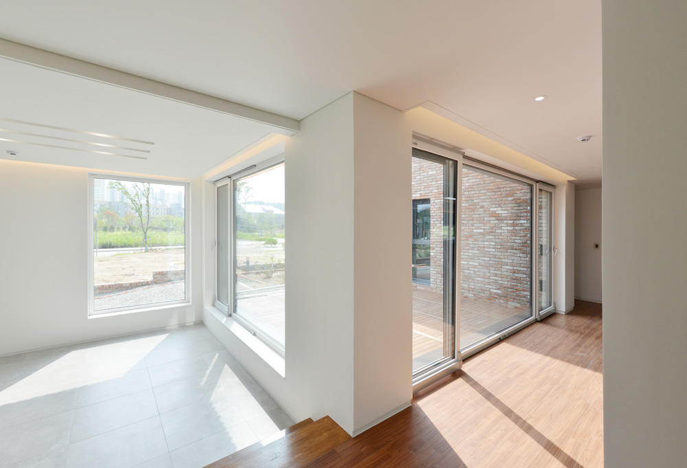 The internal private region was protected by deploying the surround rooms to the perimeter of the site. Also, a living room, which was a concept taken form that of a traditional detached house, was located at the boundary between the interior and exterior areas. This space was planned to be a room for an elderly parent. It is expanded horizontally by connecting the external courtroom and the dining room where the family spends the most time. Inside, we created a central space allowing the light through an open void up to the second floor.