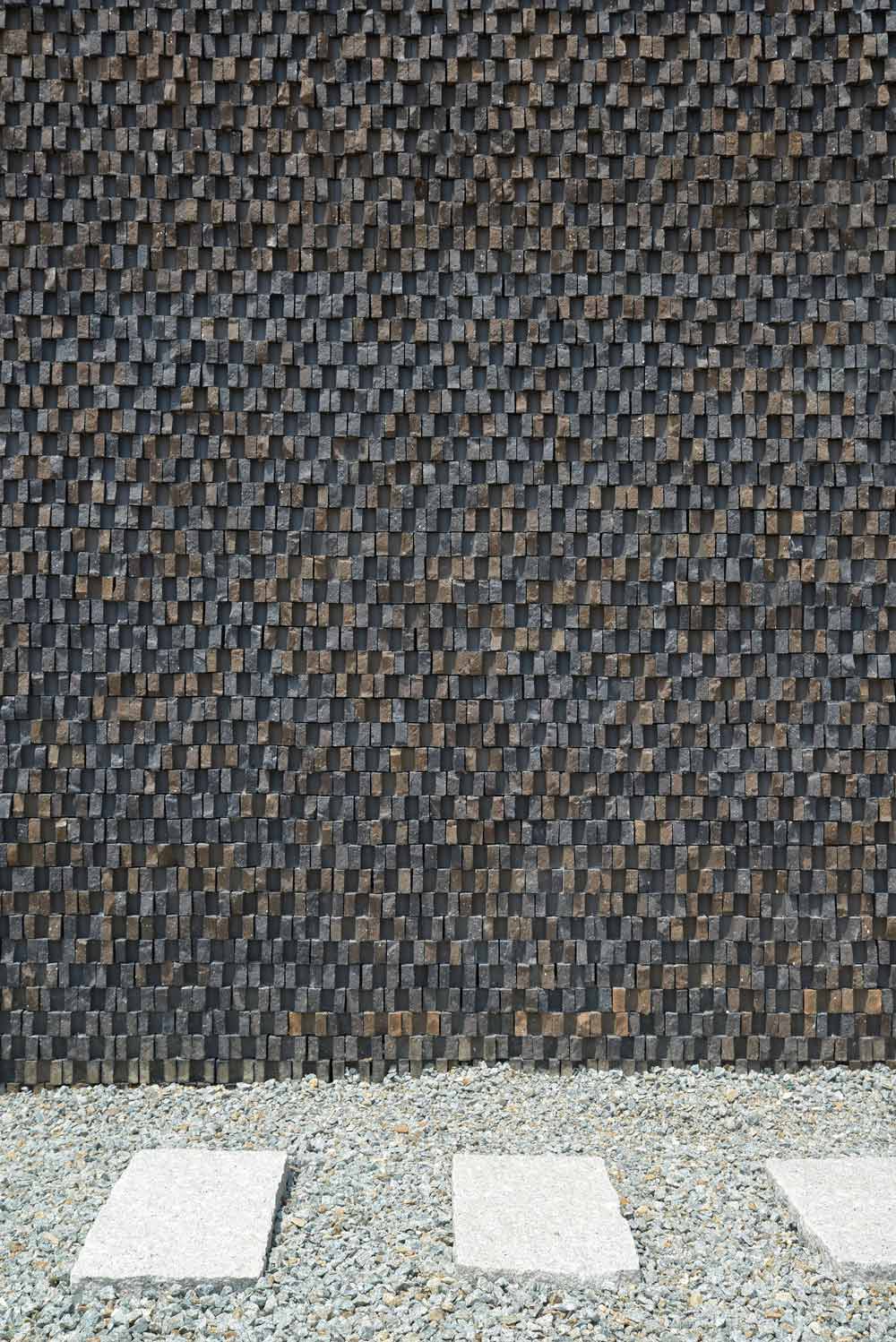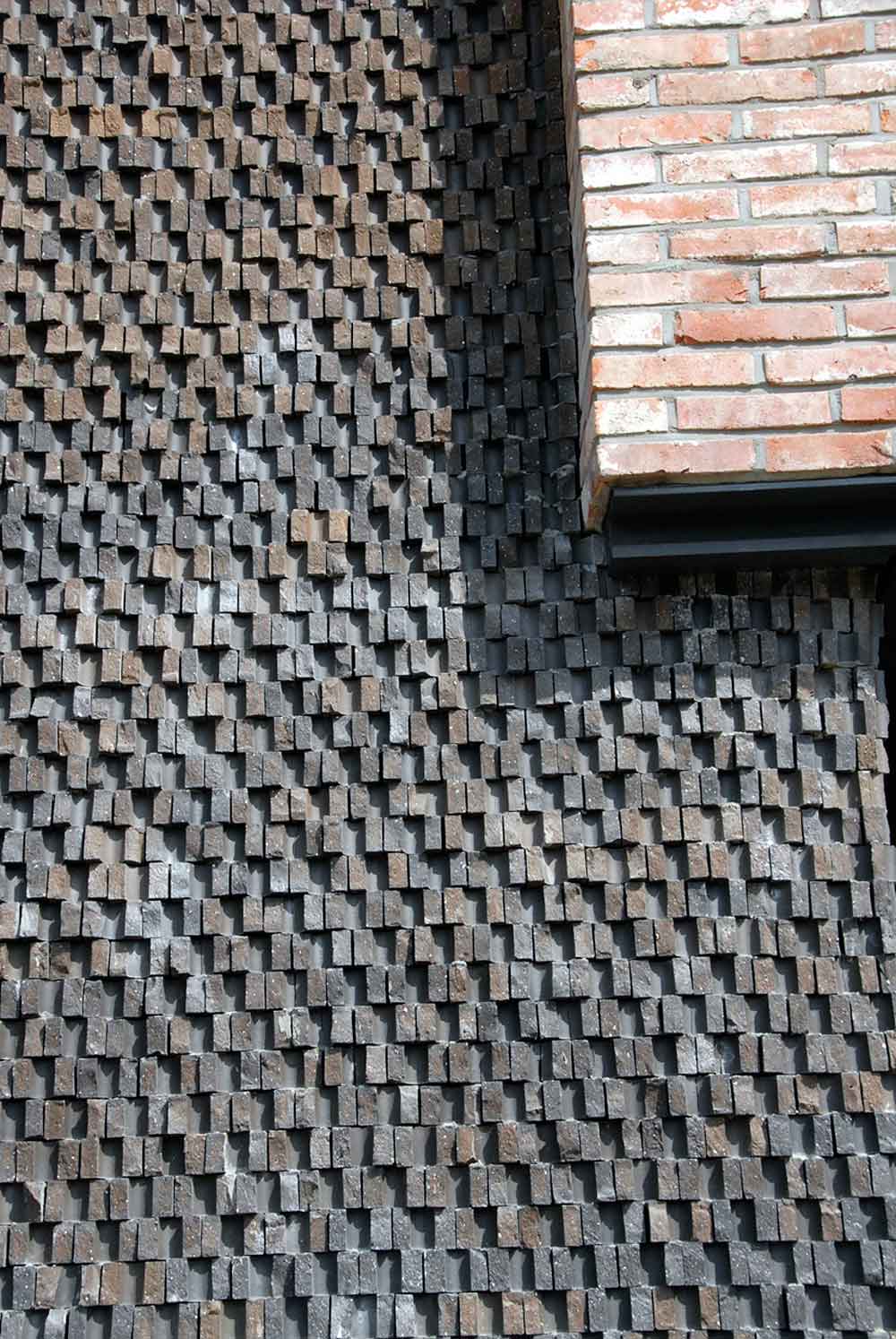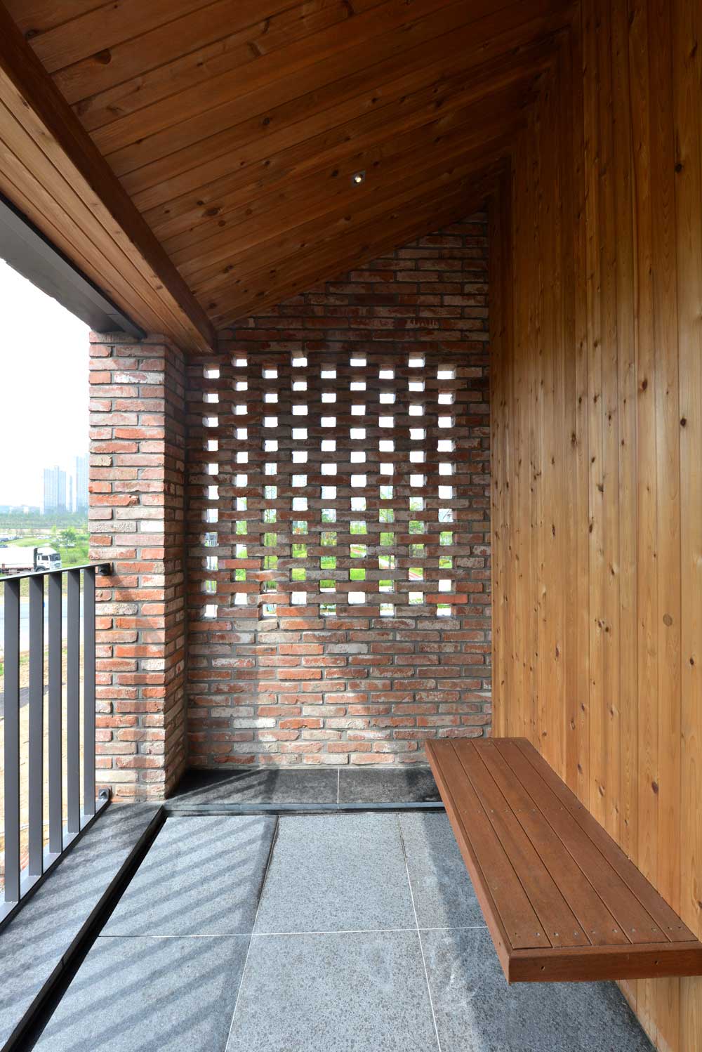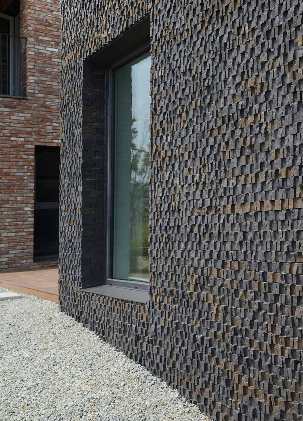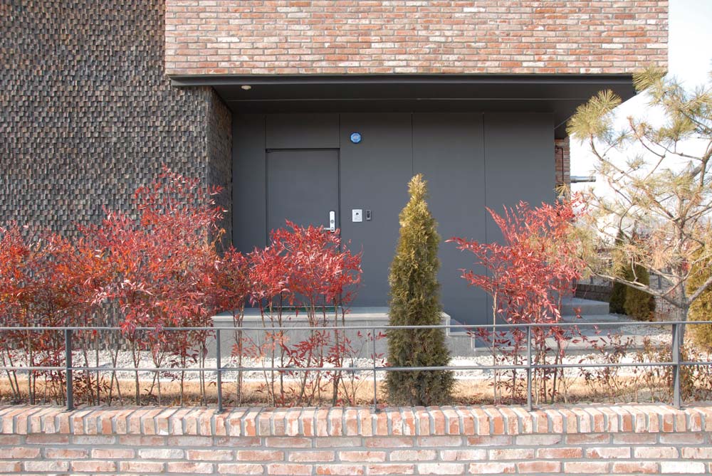 Windows were installed for every area where the line of the corridor was changed angle. Although it is an internal area, it does not feel stuffy and in each room, it is possible to access a balcony so that one can feel the wind and sunshine. Red brick was used as the main material interspersed with black and earth tone bricks. This was particularly evident with the bricklaying in the living room. This was achieved by constructing the brick work, not using the usual bricks but by cracking and attaching bricks to make a rough texture and protrudent appearance.