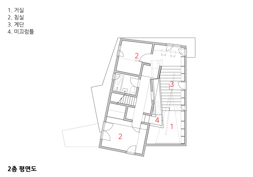 이 집을 본 사람들은 저마다 다른 이미지를 떠올린다. 토네이도, 무한궤도, 혹은 이중 나선. 하지만 실제로 이 집은 그 어떤 명칭보다도, 아이들의 웃음소리로 정의된다. 동네 아이들이 자연스럽게 모여드는 구조. 집 안을 휘감는 듯한 동선은 단순한 거주 공간을 넘어 하나의 놀이터로 기능한다. 2층 단독주택이지만, 단일한 평면이 아닌 지형에 따라 비틀어진 입면을 가지고 있다. 경사진 대지 조건과 동서남북의 방향성을 반영해, 마치 뱀이 몸을 틀 듯 입구에서부터 다락까지 긴 흐름으로 이어진다. 1층에는 마당과 연결된 주방, 놀이방, 거실이 배치되어 있고, 2층에는 두 개의 침실과 다락이 있다. 이 모든 공간을 연결하는 중심축은 계단이다. 이 계단은 단순한 수직 연결 통로가 아니다. 그 위로 미끄럼틀이 교차하며, 때로는 도서관이 되고, 때로는 영화관이 되며, 집 전체를 하나의 순환 구조로 엮어낸다. 이 집은 단순히 기능을 담는 그릇이 아니라, 가족의 일상이 순환하는 구조 그 자체이다.