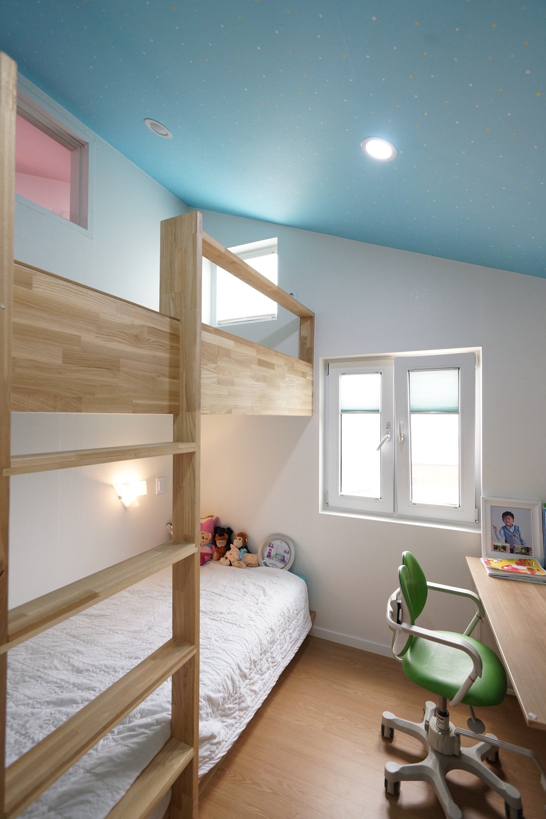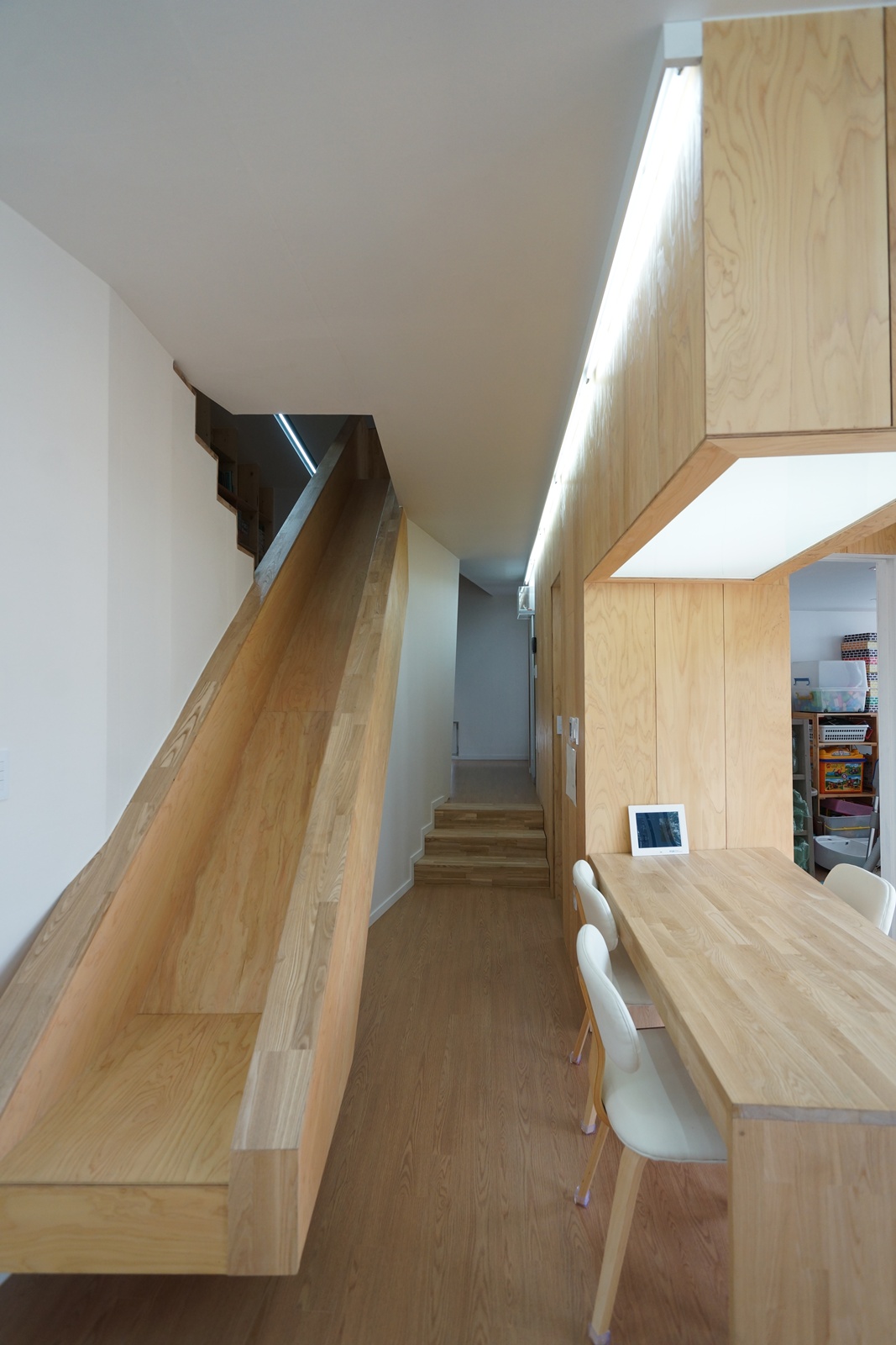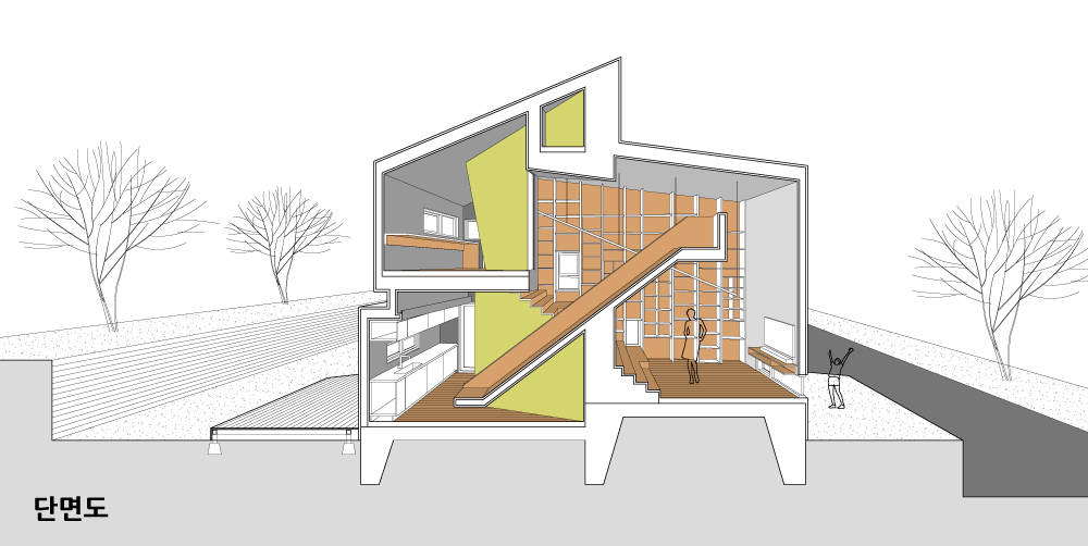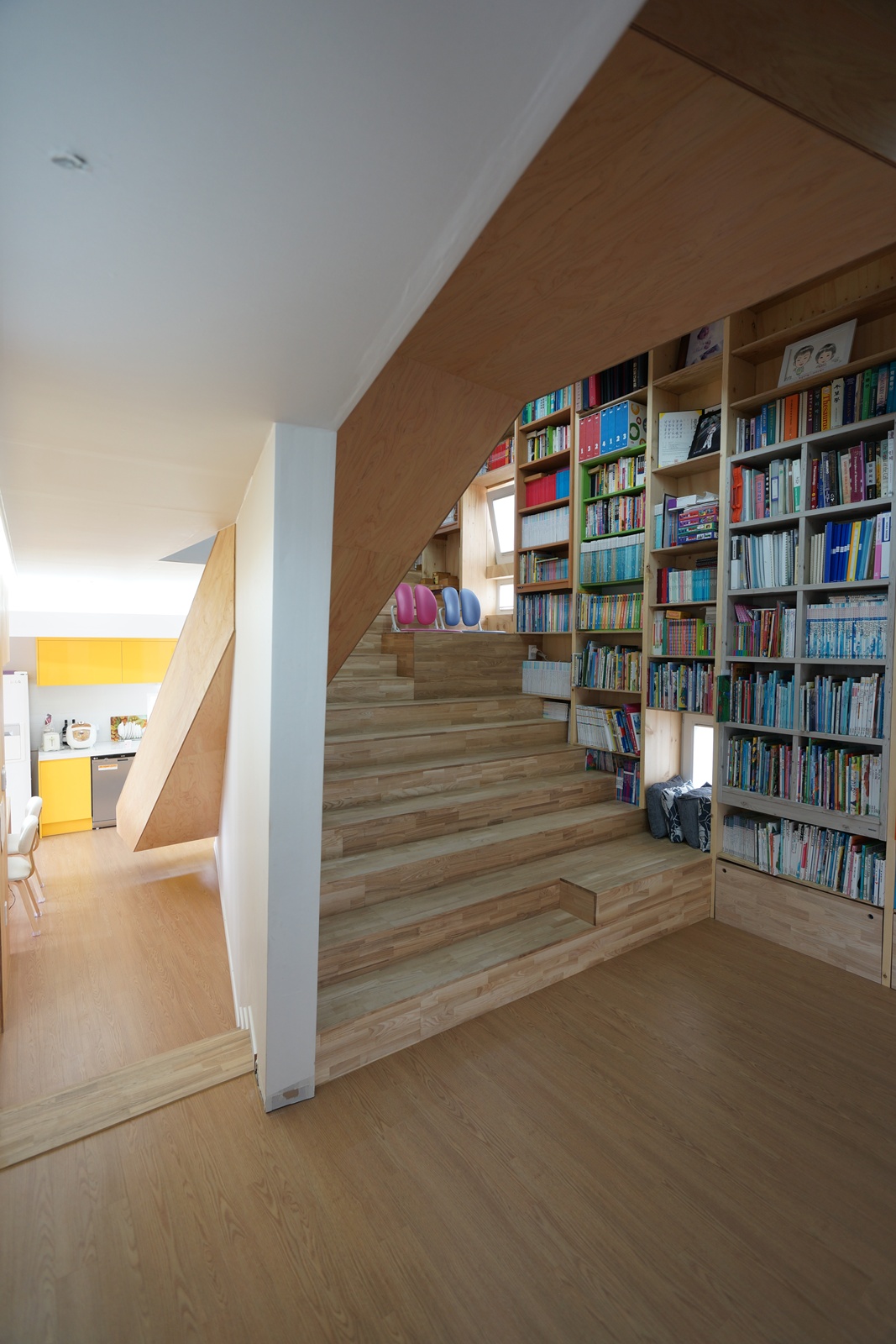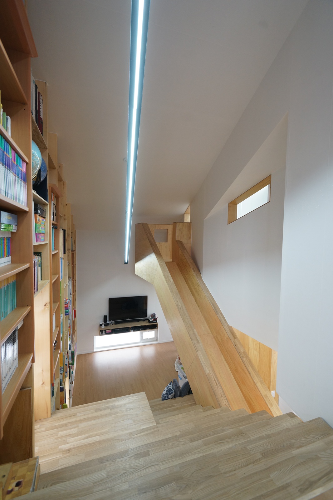 이 집은 건축주의 요청에서 출발했다. ①아빠는 영화를 볼 수 있는 넓은 계단을 원했고, ② 엄마는 주방과 연결된 놀이방과 피크닉 데크를, ③딸은 지붕 밑 아지트 같은 다락방을, ④아들은 신나는 미끄럼틀을 원했다. 이 단순한 네 개의 요구는 하나의 선으로 엮였다. 계단, 다락, 미끄럼틀, 놀이방이 유기적으로 연결되며 연속적인 공간의 띠를 만들었다. 이 띠는 집의 외부에서도 명확히 읽히는 건축적 언어가 되었다. 2층과 다락의 방들은 방향을 틀어 최대한 남향을 확보했고, 1층은 주방, 놀이방, 데크, 마당이 자연스럽게 연결되어 가족의 중심이 된다. 이 집에서 가장 독특한 공간은 계단을 관통하는 미끄럼틀이다. 영화 감상이나 독서를 위한 도서관 역할을 하는 계단을 2층에서 출발한 미끄럼틀이 주방까지 가로지르며 지나가고, 이를 통해 건물 전체가 유기적으로 연결된다. 또한 높은 층고를 이용해 계단에 책꽂이 벽을 만들고, 그 사이사이에 이미 사용 중인 책꽂이들을 끼워 넣어 가족의 기억이 담긴 가족서가(家族書架)를 만들었다. 미끄럼틀이 관통하는 계단은 기능과 상징성을 동시에 지니며, 집 전체를 하나의 거대한 롤러코스터로 변모시킨다.