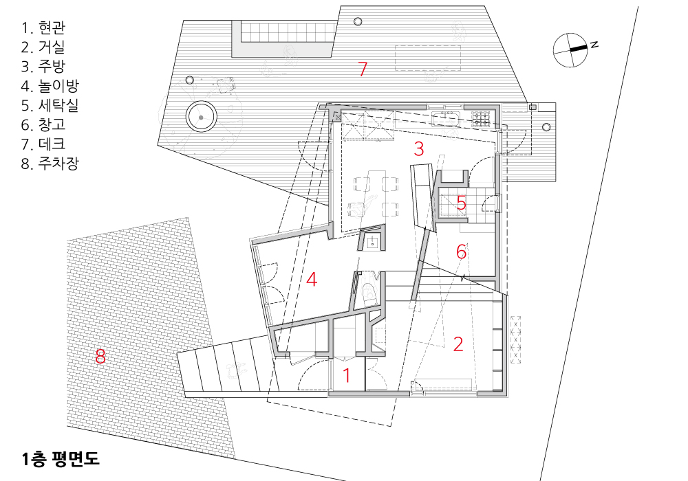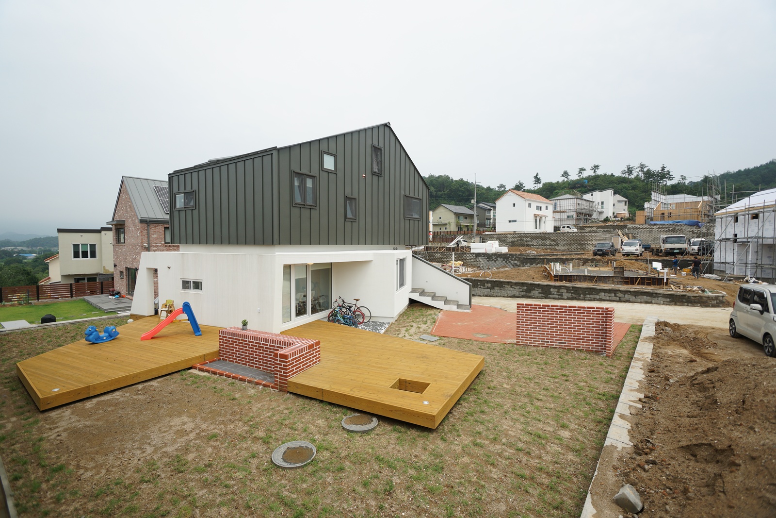 대지는 동쪽 도로에 접하고, 남쪽은 앞집의 후면을 향한다. 서쪽에는 1층 높이의 보강토 옹벽이, 북쪽에는 1.5미터 낮은 뒷집 마당이 자리한다. 가장 풍경이 좋은 곳은 북서쪽으로, 마을 입구를 조망할 수 있는 위치다. 건물은 이 같은 대지의 특성과 시선의 방향을 고려해 정교하게 배치되었다. 주차장, 데크, 마당 역시 기능에 따라 분명히 구분하되, 전체적으로 유기적으로 엮이도록 계획했다. 특히 외부에서 바라볼 때도 이 집의 ‘무한궤도’ 구조는 그대로 드러난다.