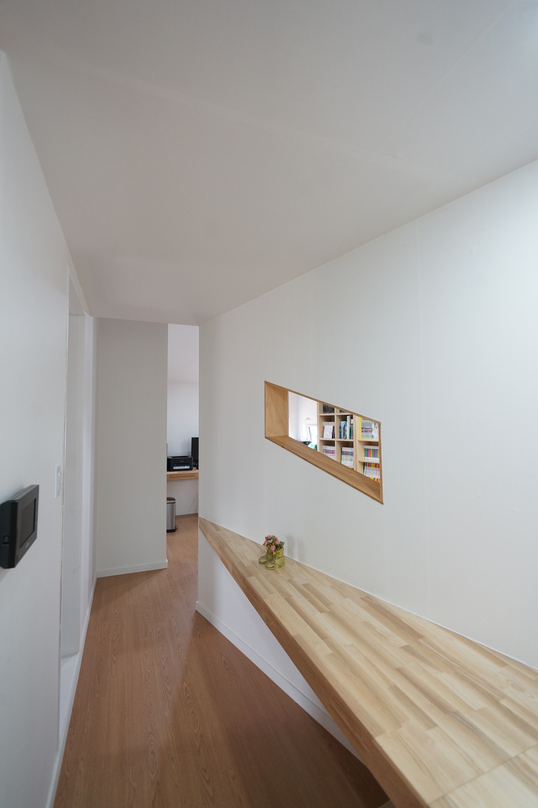 이 집은 건축주의 요청에서 출발했다. ①아빠는 영화를 볼 수 있는 넓은 계단을 원했고, ② 엄마는 주방과 연결된 놀이방과 피크닉 데크를, ③딸은 지붕 밑 아지트 같은 다락방을, ④아들은 신나는 미끄럼틀을 원했다. 이 단순한 네 개의 요구는 하나의 선으로 엮였다. 계단, 다락, 미끄럼틀, 놀이방이 유기적으로 연결되며 연속적인 공간의 띠를 만들었다. 이 띠는 집의 외부에서도 명확히 읽히는 건축적 언어가 되었다. 2층과 다락의 방들은 방향을 틀어 최대한 남향을 확보했고, 1층은 주방, 놀이방, 데크, 마당이 자연스럽게 연결되어 가족의 중심이 된다. 이 집에서 가장 독특한 공간은 계단을 관통하는 미끄럼틀이다. 영화 감상이나 독서를 위한 도서관 역할을 하는 계단을 2층에서 출발한 미끄럼틀이 주방까지 가로지르며 지나가고, 이를 통해 건물 전체가 유기적으로 연결된다. 또한 높은 층고를 이용해 계단에 책꽂이 벽을 만들고, 그 사이사이에 이미 사용 중인 책꽂이들을 끼워 넣어 가족의 기억이 담긴 가족서가(家族書架)를 만들었다. 미끄럼틀이 관통하는 계단은 기능과 상징성을 동시에 지니며, 집 전체를 하나의 거대한 롤러코스터로 변모시킨다.