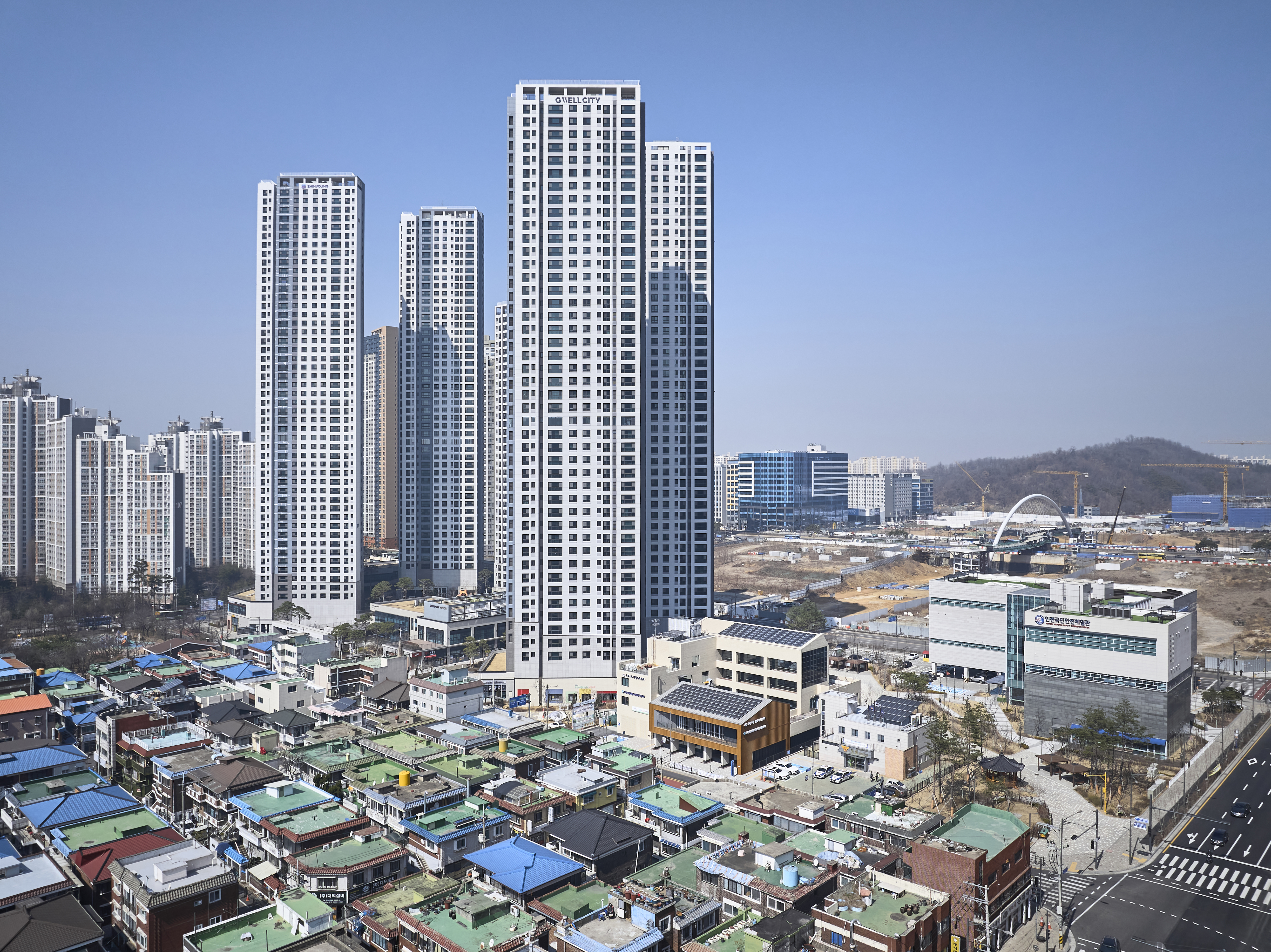 The site is located at the intersection of two contrasting urban conditions situated between existing residential neighborhoods and large-scale redevelopment. To the north, cleared land formerly occupied by low-rise homes is being transformed into a new urban core with 50-story residential towers and a large neighborhood park. To the south, the existing Gajeong Central Market remains largely intact, characterized by 2–3 story single and multi-family homes.