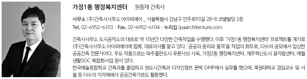 | 가정1동 행정복지센터 설계자 | 원흥재 _ 건축사사무소 도시공작소 · (주)건축사사무소 아이피에이 건축주 | 인천광역시 서구청 감리자 | 서진 건축사사무소 시공사 | 리더종합건설(주) 설계팀 | 김덕화, 김현, 김재훈, 신유림, 하주영 설계의도 구현 | 건축사사무소 도시공작소 대지위치 | 인천광역시 서구 가정동 주요용도 | 공공업무시설 대지면적 | 1,900.00㎡ 건축면적 | 1,129.56㎡ 연면적 | 4,597.89㎡ 건폐율 | 59.45% 용적률 | 158.07% 규모 | B1 - 4F 구조 | 철근콘크리트구조 외부마감재 | 벽돌치장쌓기, 로이복층유리, 시스템창호, 칼라강판 내부마감재 | 비닐타일, 수성페인트, 흡음텍스 설계기간 | 2020. 04 - 2021. 09 공사기간 | 2021. 11 - 2023. 04 사진 | 최진보 구조분야 | (주)윤구조파트너스 기계설비·전기·소방분야 | (주)덕수이앤지 |