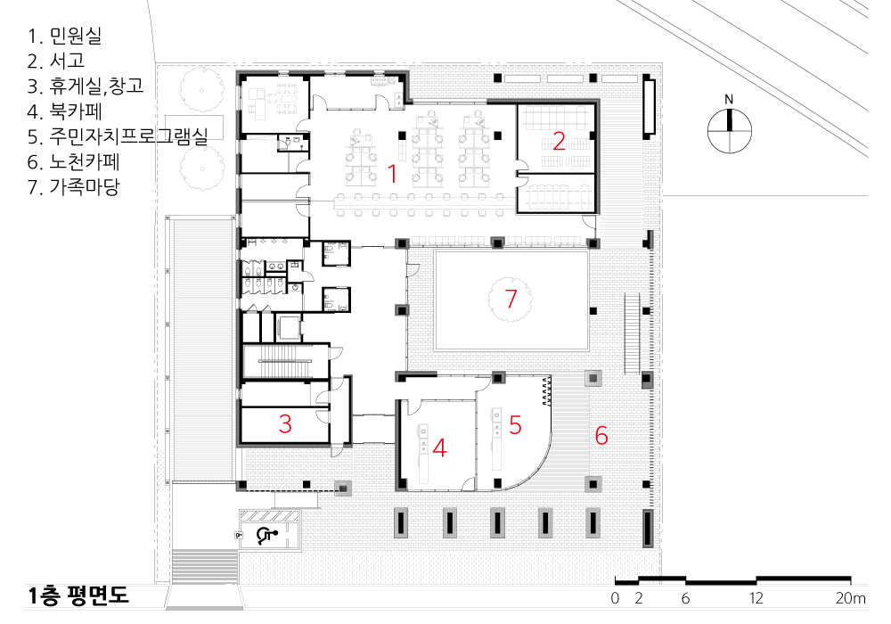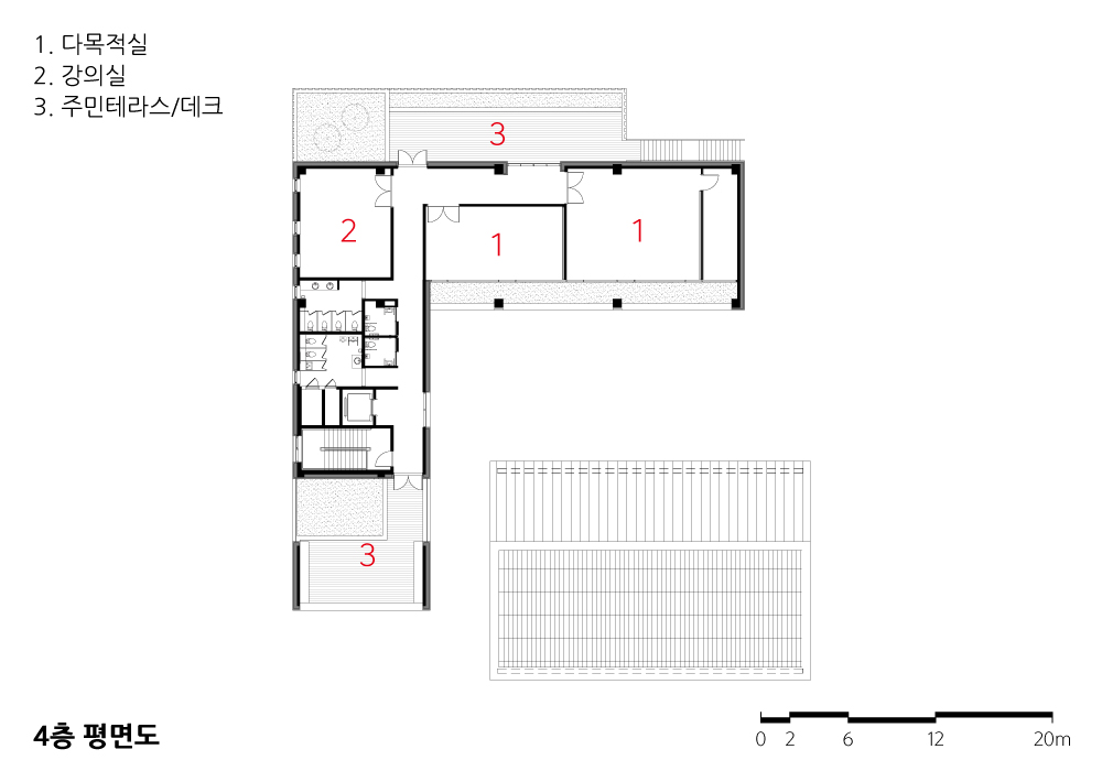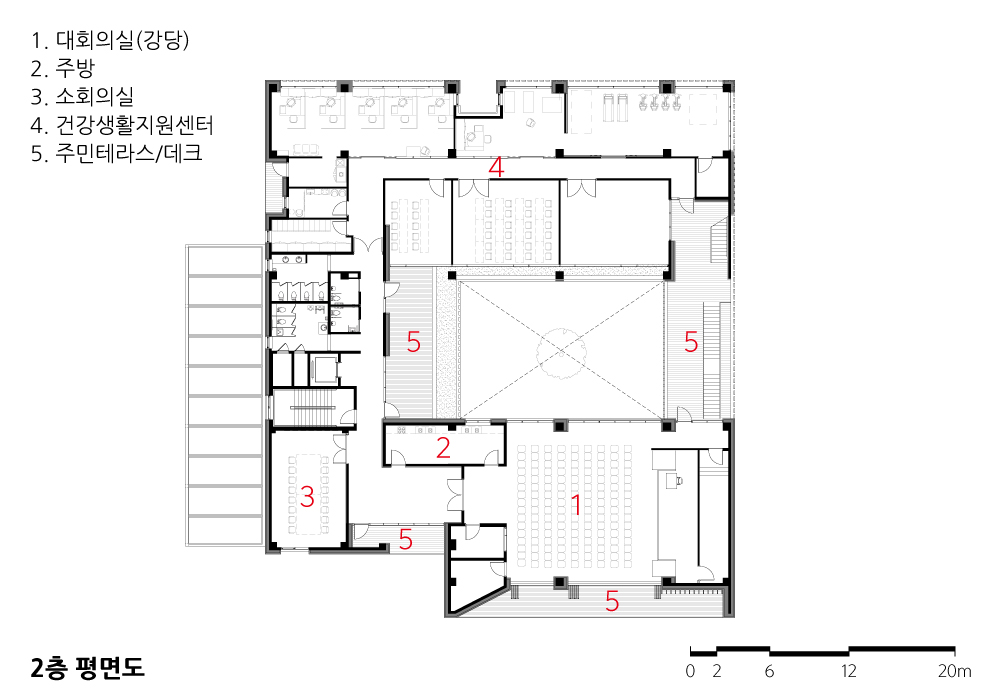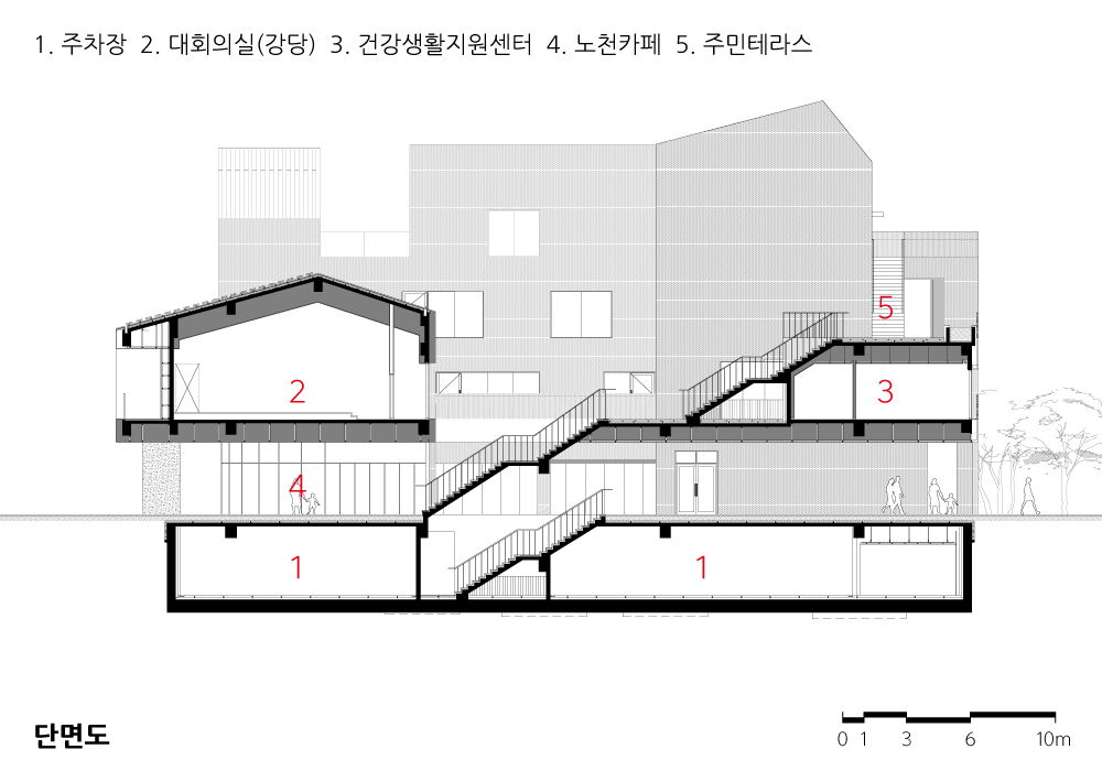 테라스와 휴게 데크는 각 층의 용도적 특성, 그리고 공원의 풍경 사이에서 연관성을 더욱 강화시켜주는 확장적 프로그램이 되길 의도했으며, 저층부의 노천카페, 옥상녹화 등 특성에 적합한 조경공간을 통해 근린공원의 일부로서 인식될 행정복지센터의 이용성을 입체적으로 끌어올렸다.