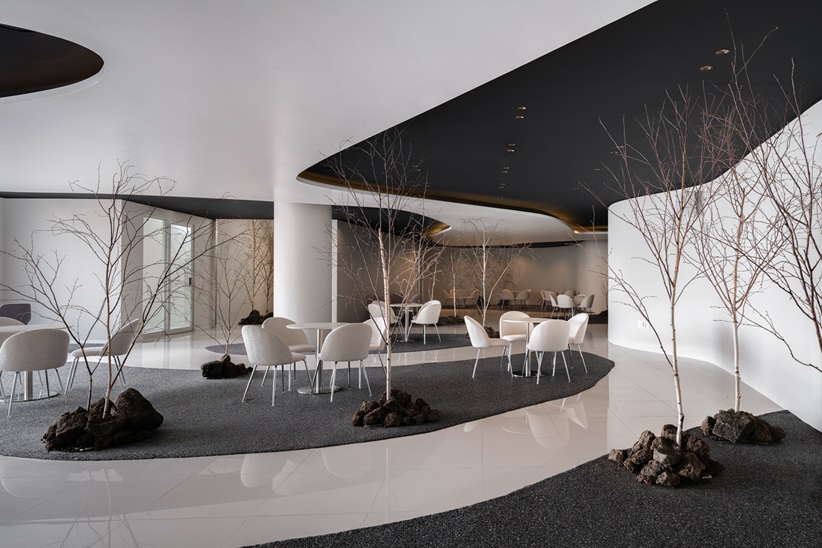 The interior space continues the openness of the exterior, extending the architectural vision inward. When the same design logic applies to both inside and out, users receive a clear and unified spatial experience. Upon entering the first floor lobby, visitors are greeted by a large open atrium above the counter and an iconic chandelier. A wide staircase leads up to the second floor, reinforcing a continuous spatial rhythm.