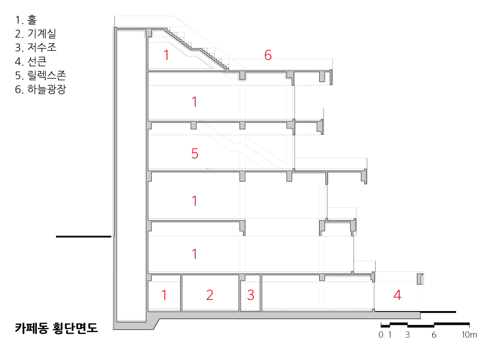 건축주가 설계안에 요청한 중요 사항은 바다풍경 감상을 위한 건축 디자인과 최대한의 주차 대수 확보였다. 기존의 경사도가 높은 지형은 주변 산세와 연속성을 가지며, 안정적으로 수년간 유지되어 왔으므로, 새로운 카페의 설계는 기존 리조트가 철거된 후에도 기존의 지형을 최대한 보전하는 방향으로 계획했다.