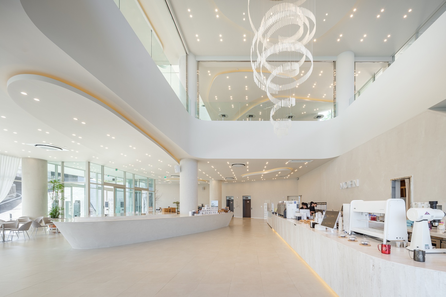The interior space continues the openness of the exterior, extending the architectural vision inward. When the same design logic applies to both inside and out, users receive a clear and unified spatial experience. Upon entering the first floor lobby, visitors are greeted by a large open atrium above the counter and an iconic chandelier. A wide staircase leads up to the second floor, reinforcing a continuous spatial rhythm.