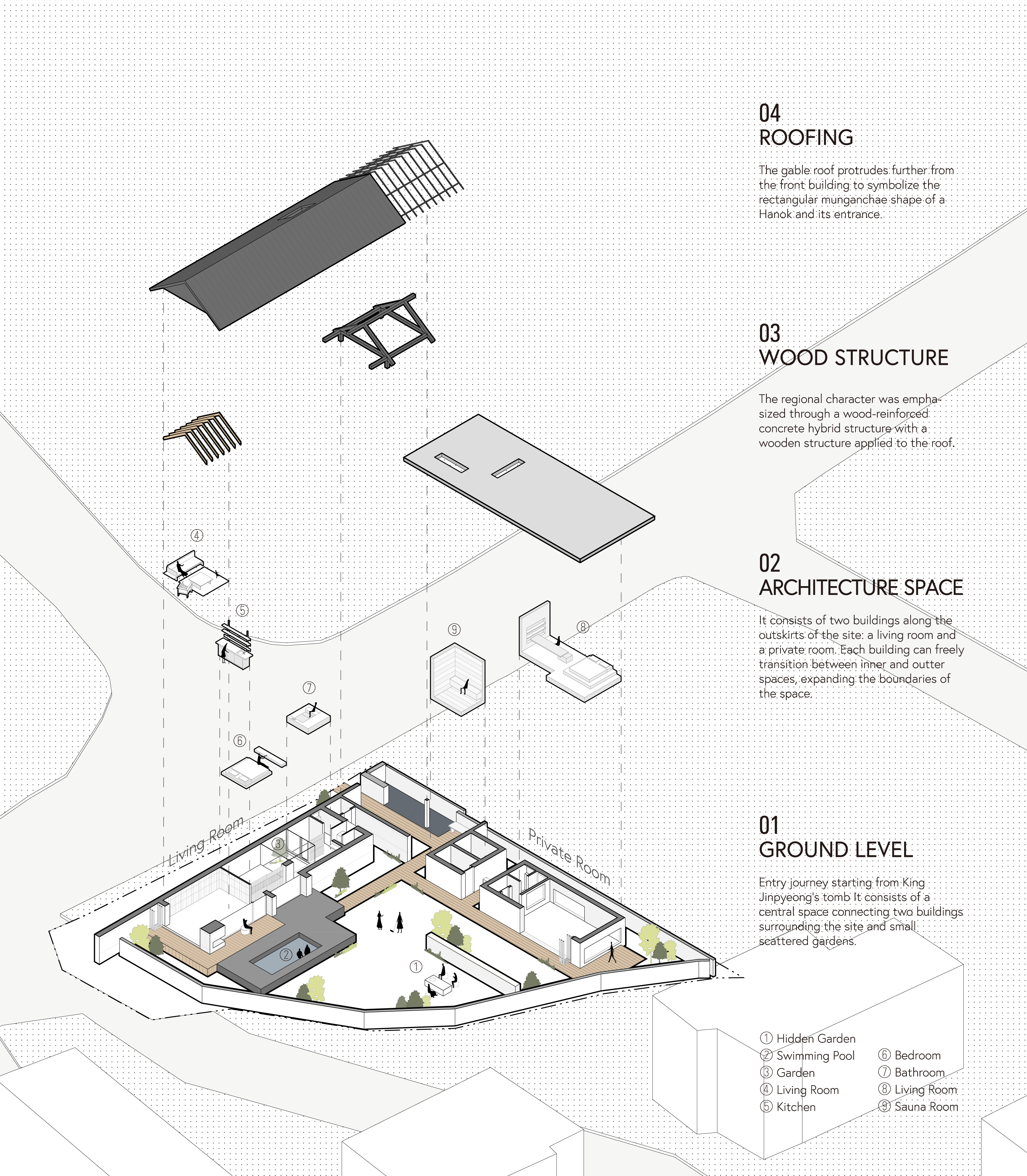 전통성과 현대성이 조화를 이루는 복합적인 풍경을 만들기 위해 박공지붕과 평지붕, 그리고 철근콘크리트구조와 목구조를 혼합 사용했다. 대지로 들어서기 전에 마주하는 본채는 육중한 노출콘크리트조의 몸체와 목구조 지붕으로 전통적인 모습을 자아내지만, 평지붕으로 이루어진 별채와 어우러져 현대적으로 해석된다.