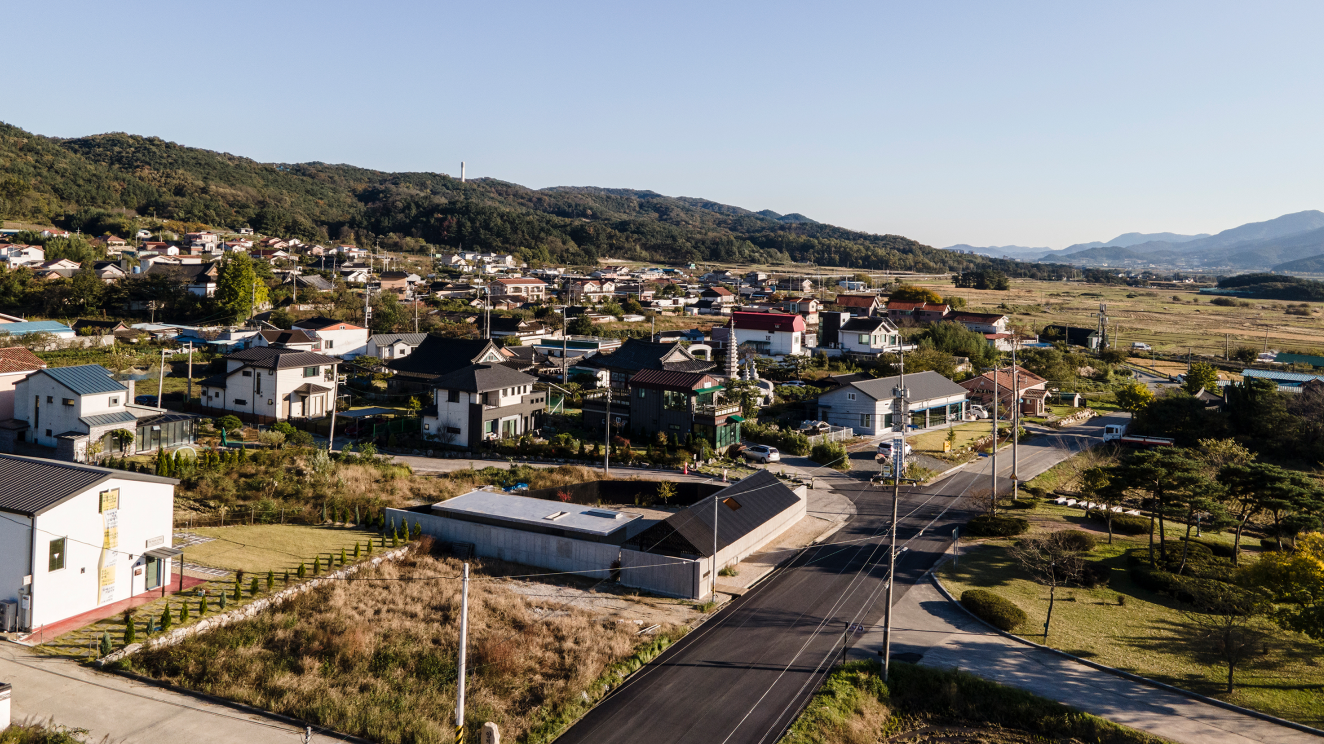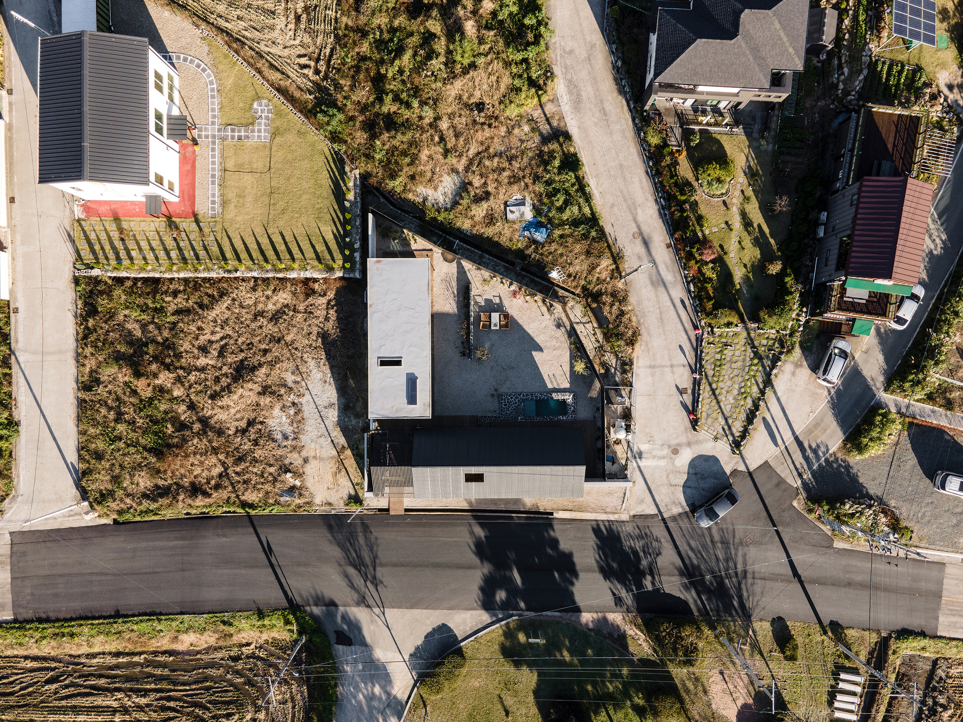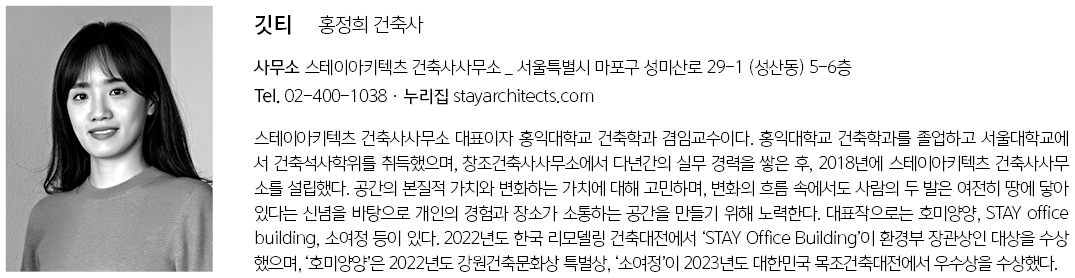 ‘Gitti’ is a dialect word from the Gyeongsangnamdo region of Korea, meaning corner. True to its name, the site sits at a corner where three roads meet, forming an irregular shape rather than a neatly defined plot. It occupies the final lot of farmland descending from the surrounding hills, which makes it prone to water flow even on dry days. Moreover, as the land is designated as a conservation green area, the building coverage ratio was restricted to just 20%, limiting the scale of development.