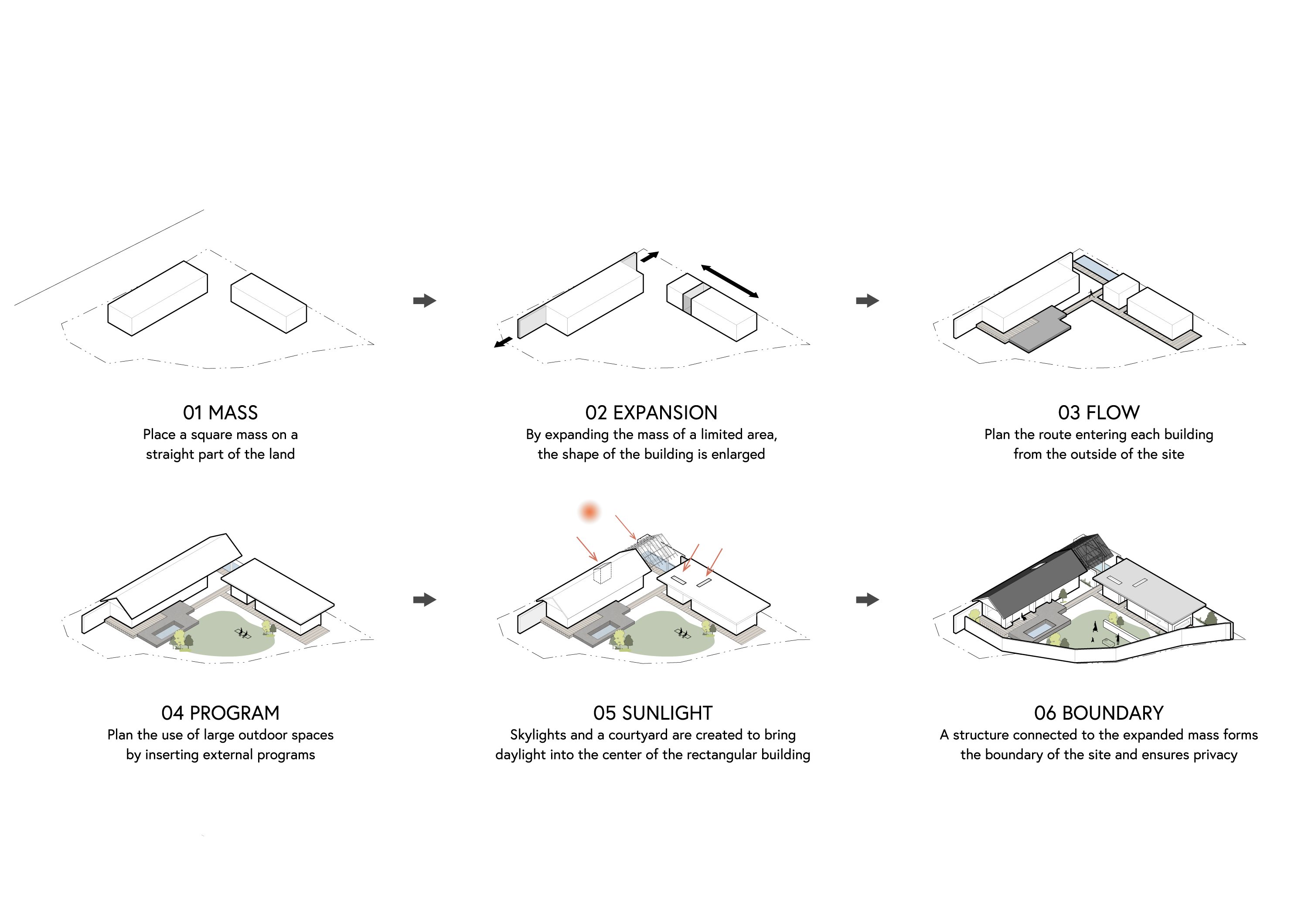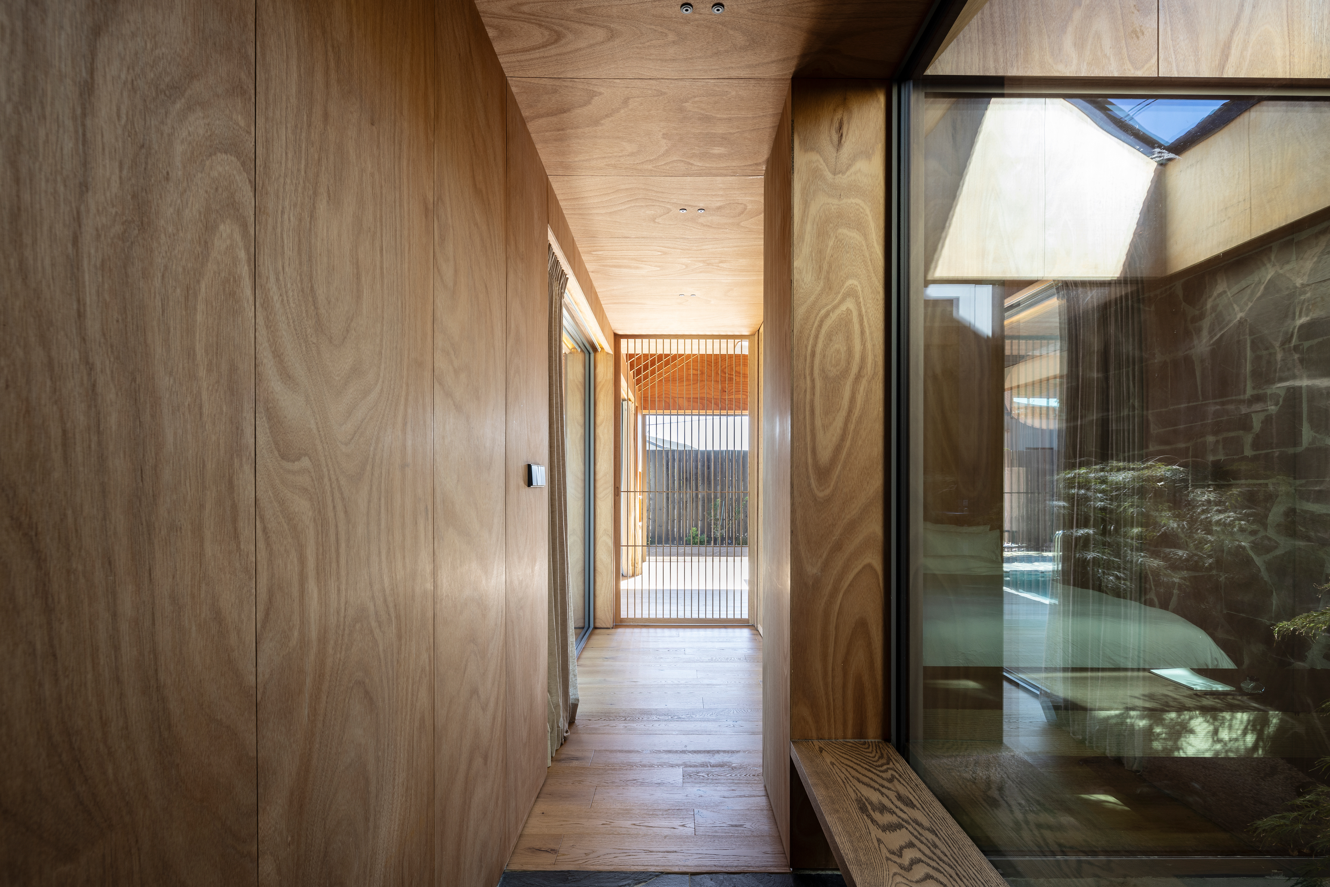 중앙정원을 바라보는 본채(living room)와 별채(private room)는 면적은 작지만 다채로운 공간 경험을 준다. 본채는 긴 장방형 매스의 공간적 한계를 극복하기 위해 가운데 중정을 두어 모든 지점에서 외부와 접하고 자연채광이 될 수 있도록 계획했다. 별채는 마당을 향하고 있어 전면 폴딩도어를 개폐할 수 있고, 곳곳에 시선이 닿는 곳에 낮은 창을 두어 시선이 벽에 부딪히지 않도록 했다.