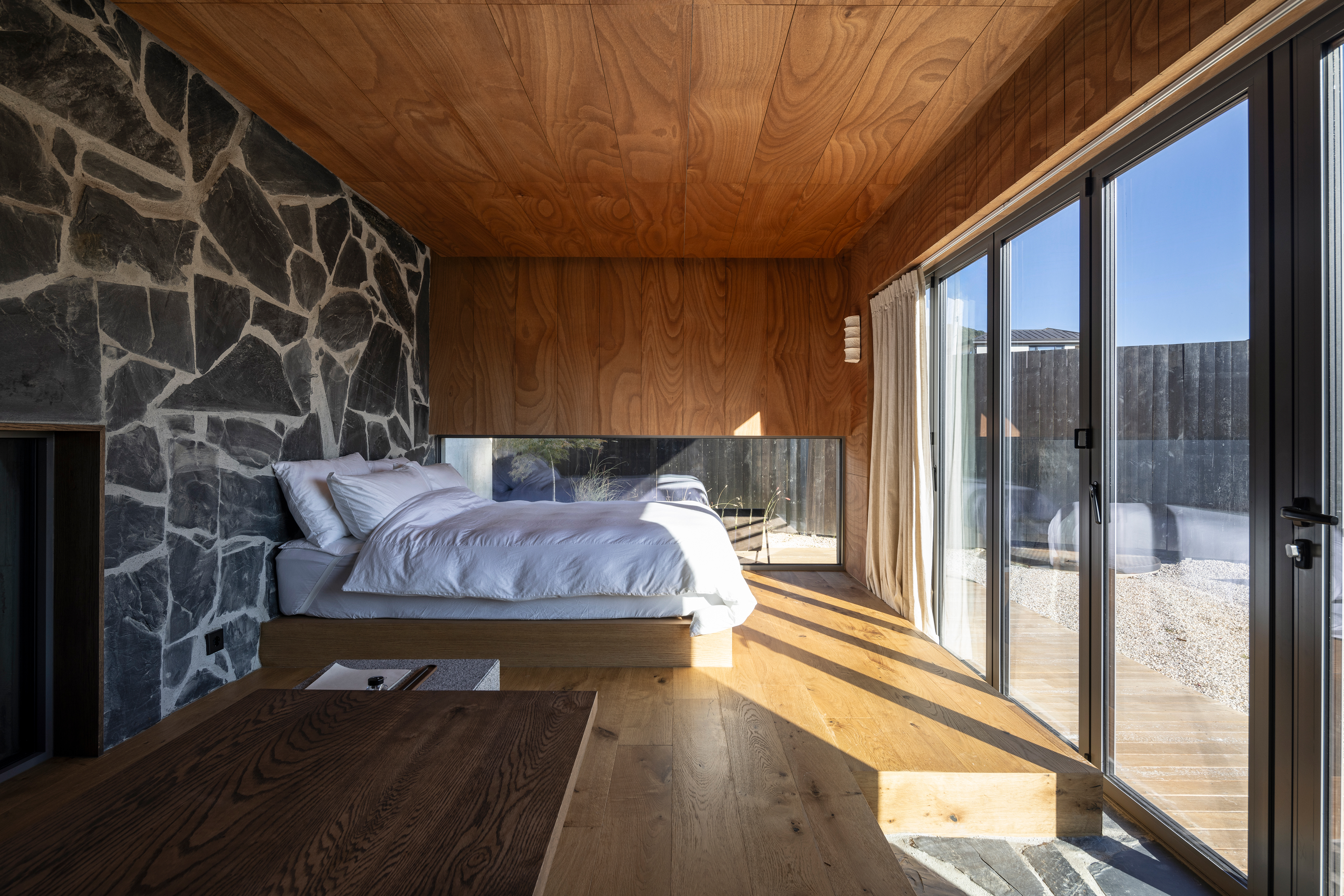 Inside, natural materials enrich the sensory experience. Floors, walls, and ceilings in the living and sleeping areas are finished entirely in wood. Wet areas are finished with roughly textured slate. Notably, the walls and ceilings use timber planks with emphasized wood grain, arranged by grain direction to express the bold presence of the material. For lighting, we collaborated with artist Kosomi, who reinterprets traditional Korean techniques in modern form, producing custom floor and wall lamps made of hanji (traditional Korean paper) that complete the atmosphere unique to Gitti.