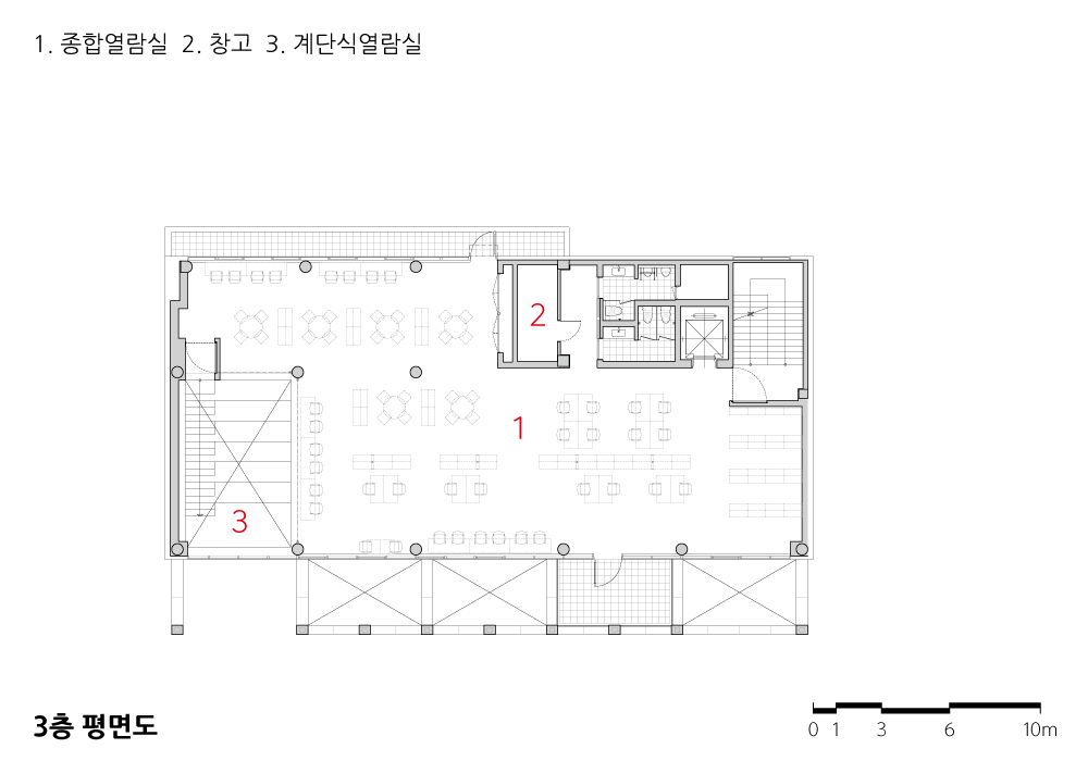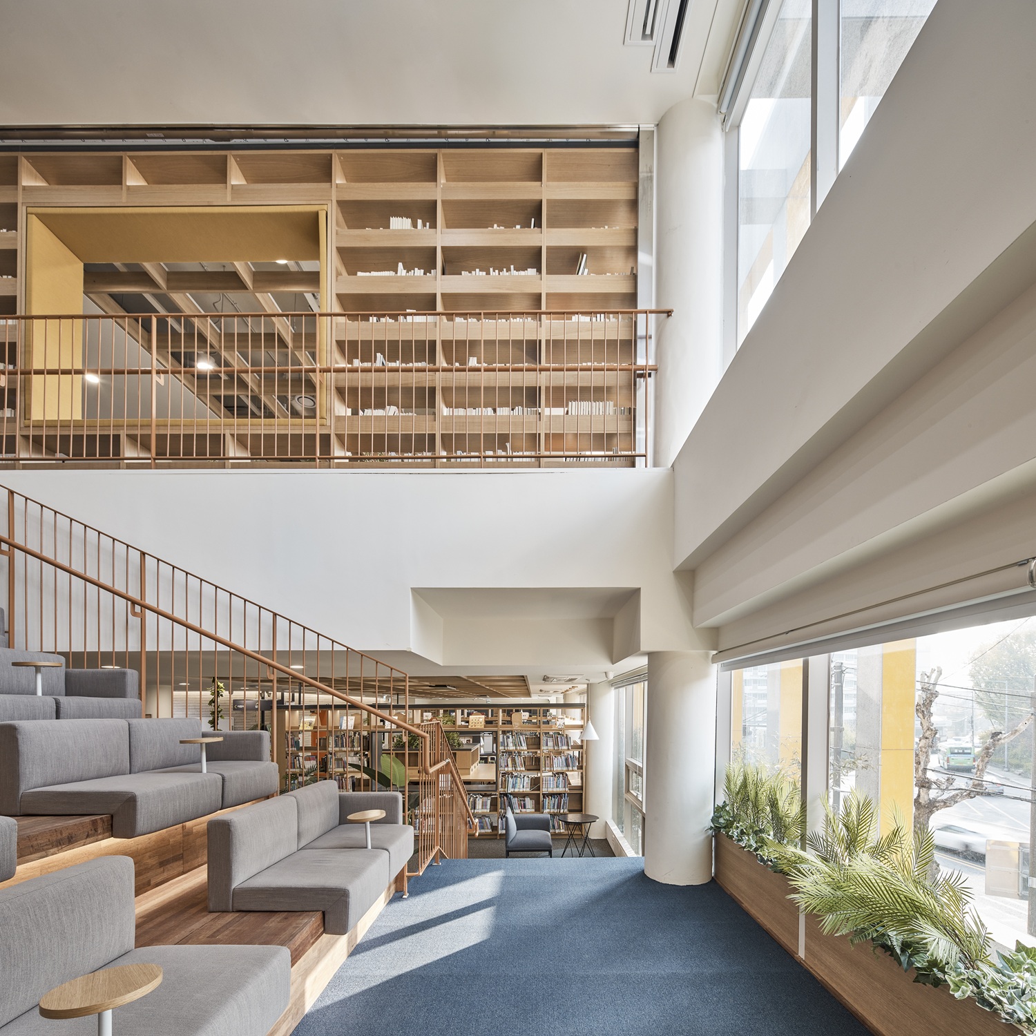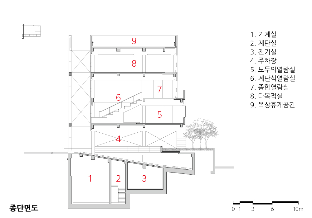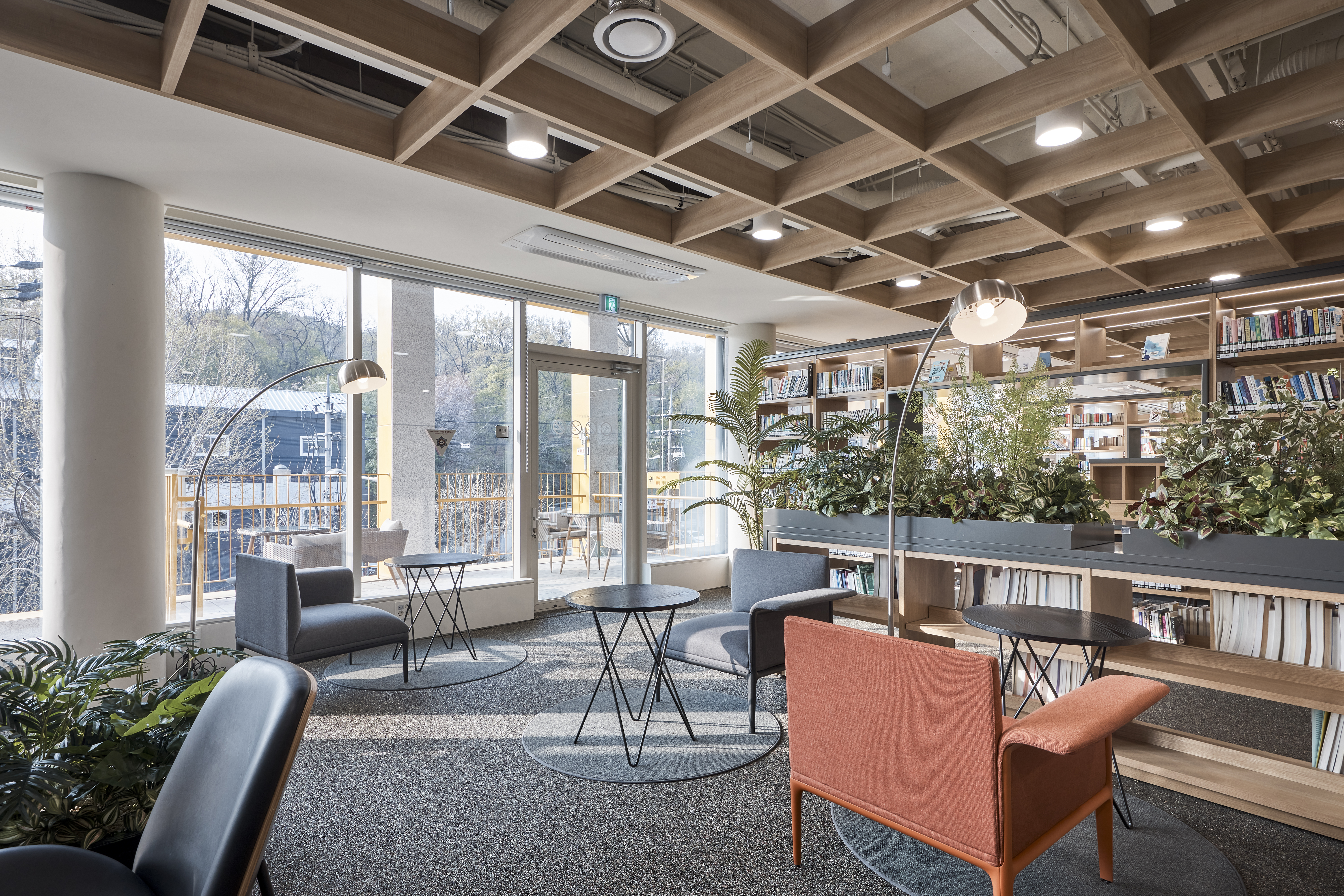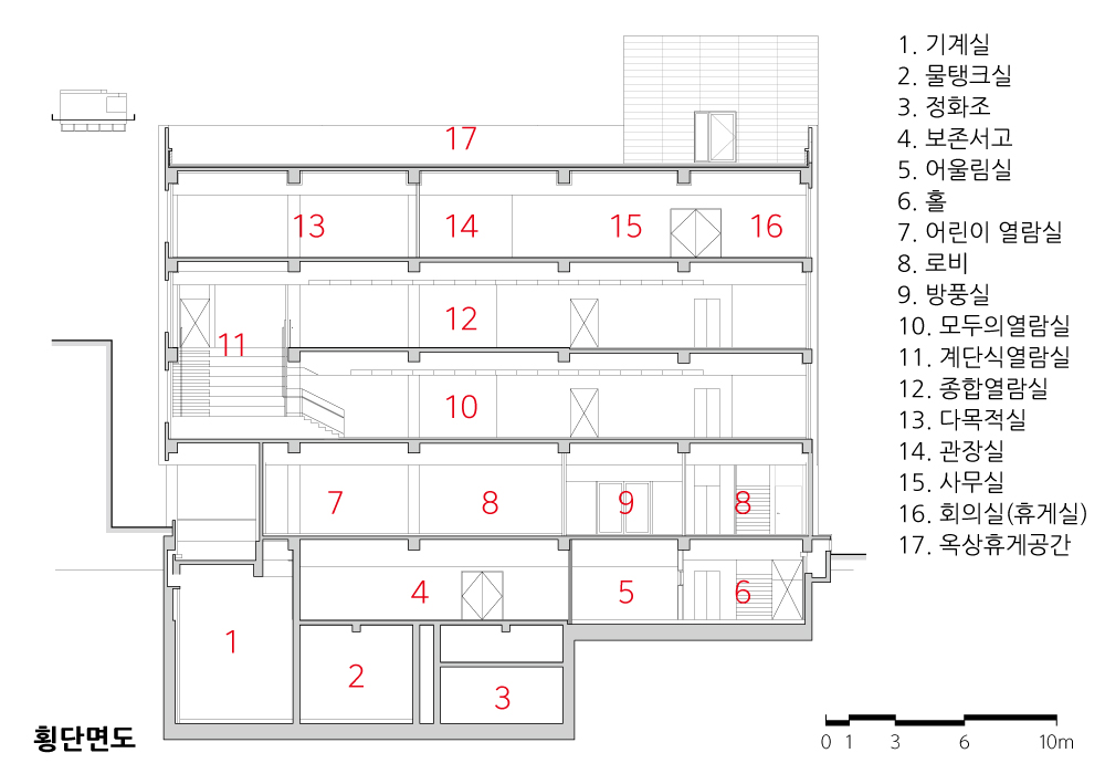 전면 파사드와 매스 사이에 새롭게 조성된 틈을 따라, 방문객은 건물의 내부와 외부를 드나들며 위치에 따라 달라지는 주변 풍경과 건물 내부를 경험할 수 있다. 정적인 분위기에서 책을 읽는 기존 도서관의 방식에서 한발 나아가, 책을 발견하고 읽고 사색하는 일련의 과정을 걷고, 앉고, 머물다가 떠돌아다니는 산책의 과정과 통합함으로써 지식과 정보의 공간을 독서와 사색을 하는 진화된 경험의 공간으로 바꾸고자 했다.