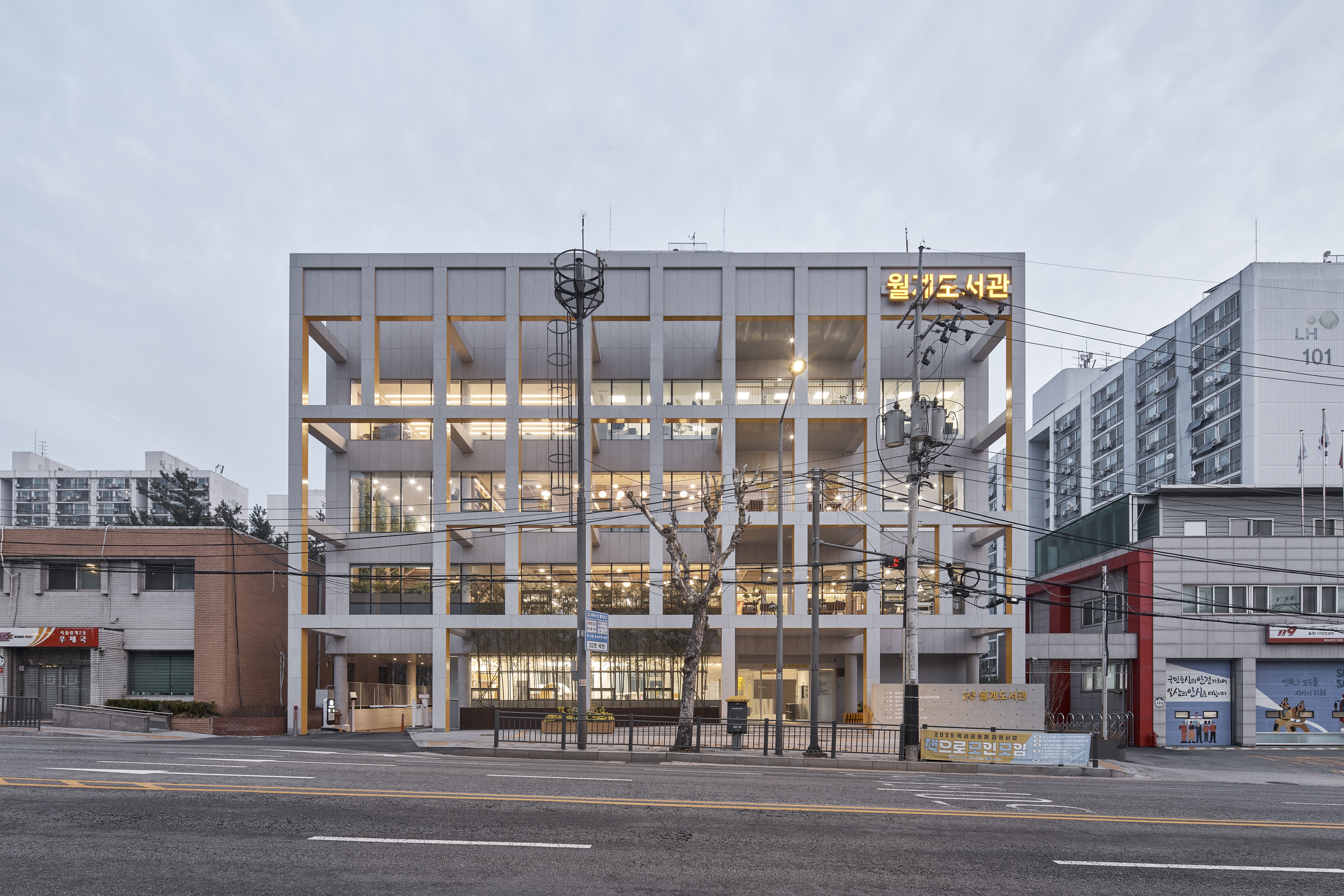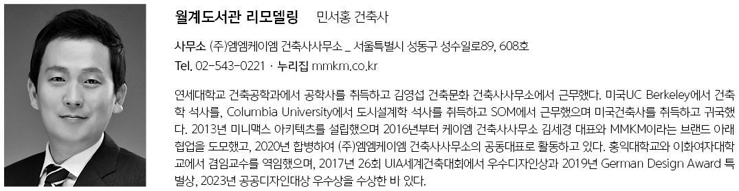| 월계도서관 리모델링 설계자 | 김세경·민서홍 _ (주)엠엠케이엠 건축사사무소 건축주 | 노원구청 감리자 | 김대영 _ (주)종합건축사사무소 구일 시공사 | (주)원진건설산업 설계팀 | 임홍량 설계의도 구현 | 민서홍_ (주)엠엠케이엠 건축사사무소 대지위치 | 서울특별시 노원구 월계동 주요용도 | 교육연구시설(도서관) 대지면적 | 701.10㎡ 건축면적 | 401.59㎡ 연면적 | 1,980.01㎡ 건폐율 | 57.28% 용적률 | 199.41% 규모 | B1 - 4F 구조 | 철근콘크리트구조, 증축부 철골구조 외부마감재 | 투명로이복층유리 창호, 화강석, 칼라강판 내부마감재 | 포세린타일, 시멘트타일, 화강석, 강화마루 설계기간 | 2022. 07 - 2023. 04 공사기간 | 2023. 08 - 2025. 02 사진 | 이남선 구조분야 | SDM구조기술사사무소 기계설비·전기·소방분야 | (주)진원엔지니어링 |