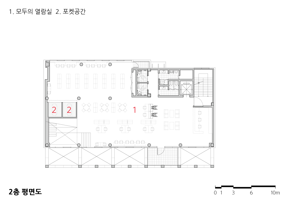 그러나 월계도서관은 건폐율과 용적률 및 일조사선제한의 틀 안에서 최대한의 면적과 기준층 3.9미터의 낮은 층고를 가지며, 지하 1층부터 지상 4층으로 단순히 쌓아 올린 전형적인 공공건축물의 형태를 취하고 있었다. 흔한 관공서를 연상케 하는 외관, 법적으로 요구되는 엘리베이터와 직통계단으로만 연결되는 건조한 동선 체계, 낮은 천장고에 답답하게 들어찬 서가로 숨 쉴 틈이라곤 조금도 찾아볼 수 없는 내부 공간은 15년밖에 되지 않은 도서관을 리모델링하는 원인이 되었다.