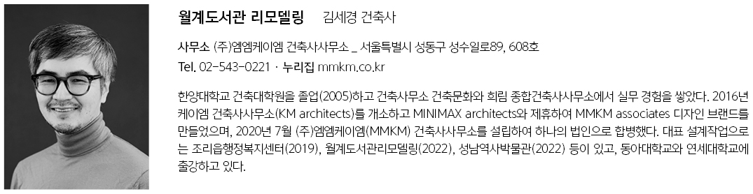 | 월계도서관 리모델링 설계자 | 김세경·민서홍 _ (주)엠엠케이엠 건축사사무소 건축주 | 노원구청 감리자 | 김대영 _ (주)종합건축사사무소 구일 시공사 | (주)원진건설산업 설계팀 | 임홍량 설계의도 구현 | 민서홍_ (주)엠엠케이엠 건축사사무소 대지위치 | 서울특별시 노원구 월계동 주요용도 | 교육연구시설(도서관) 대지면적 | 701.10㎡ 건축면적 | 401.59㎡ 연면적 | 1,980.01㎡ 건폐율 | 57.28% 용적률 | 199.41% 규모 | B1 - 4F 구조 | 철근콘크리트구조, 증축부 철골구조 외부마감재 | 투명로이복층유리 창호, 화강석, 칼라강판 내부마감재 | 포세린타일, 시멘트타일, 화강석, 강화마루 설계기간 | 2022. 07 - 2023. 04 공사기간 | 2023. 08 - 2025. 02 사진 | 이남선 구조분야 | SDM구조기술사사무소 기계설비·전기·소방분야 | (주)진원엔지니어링 |