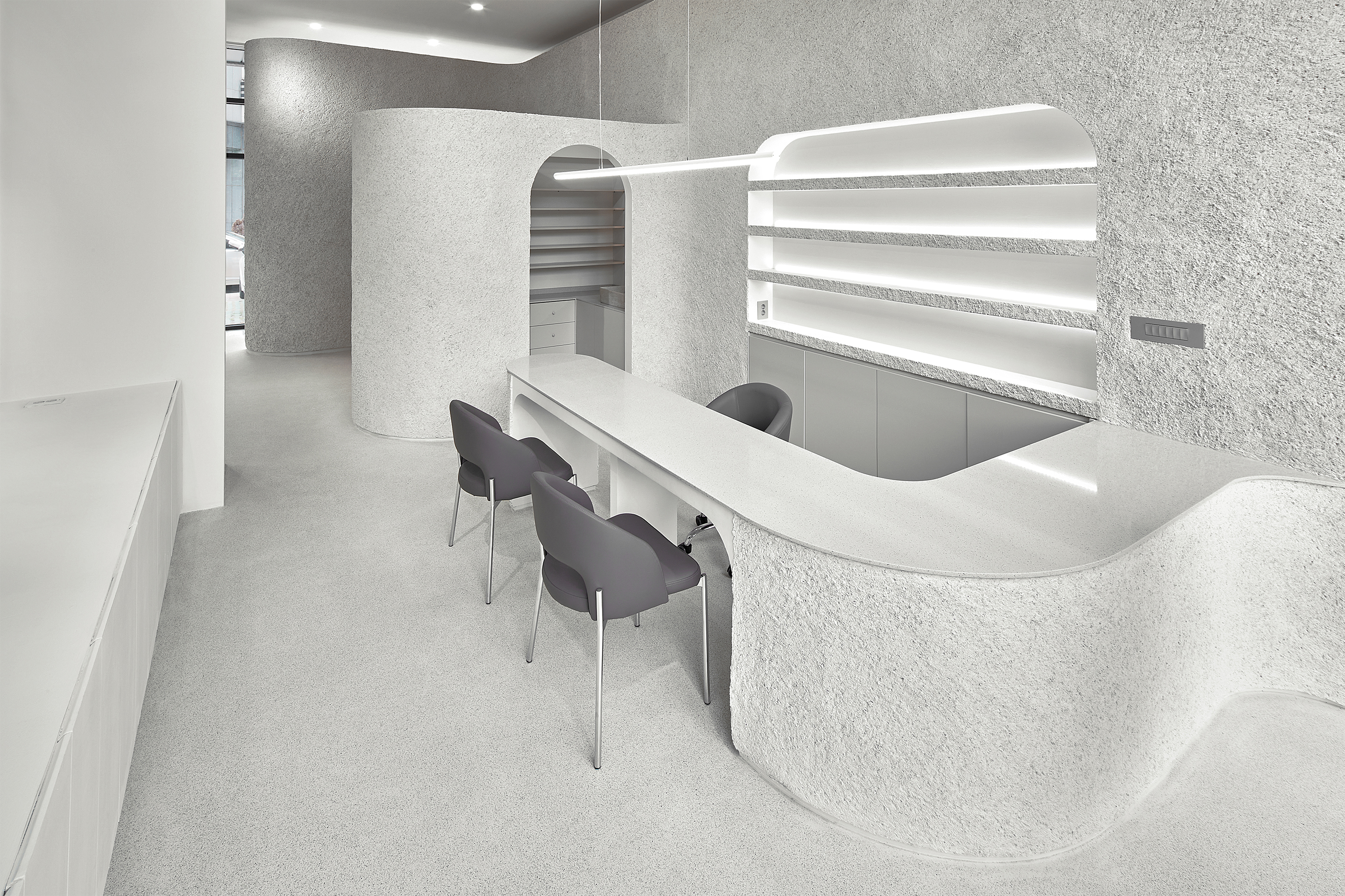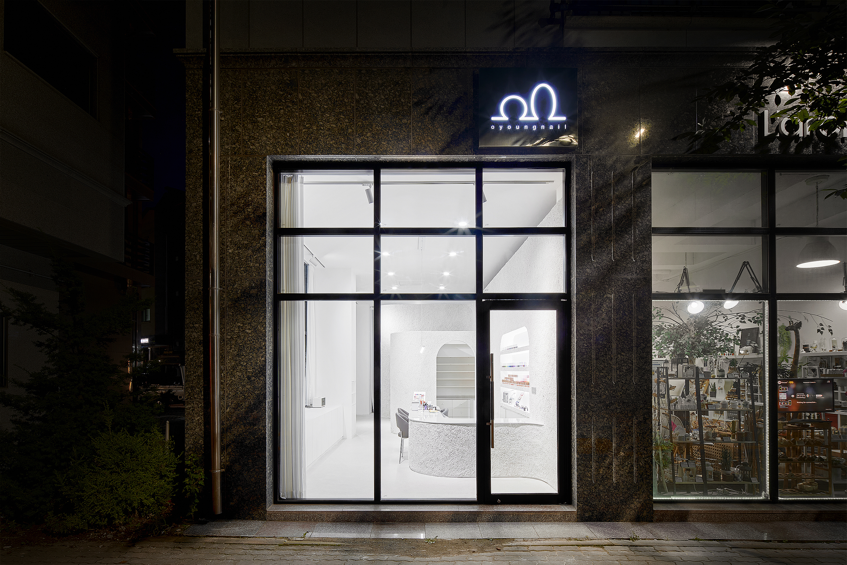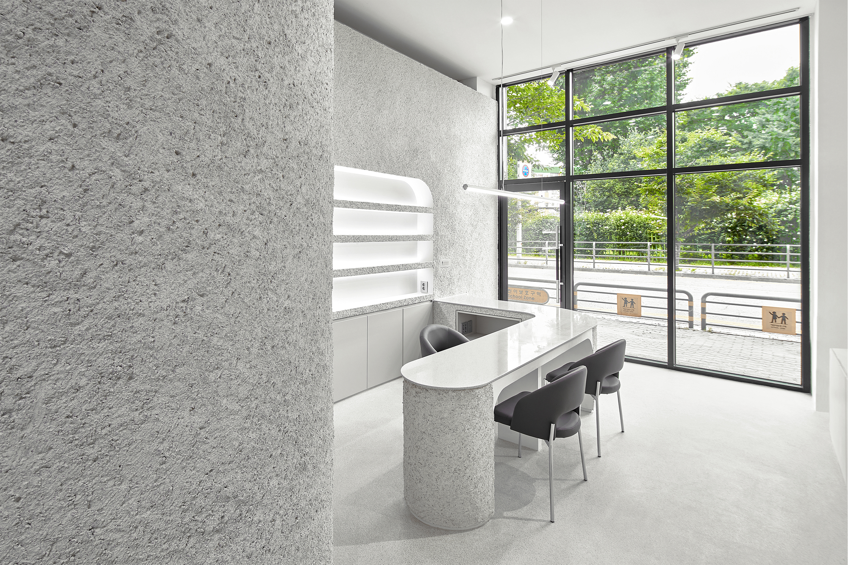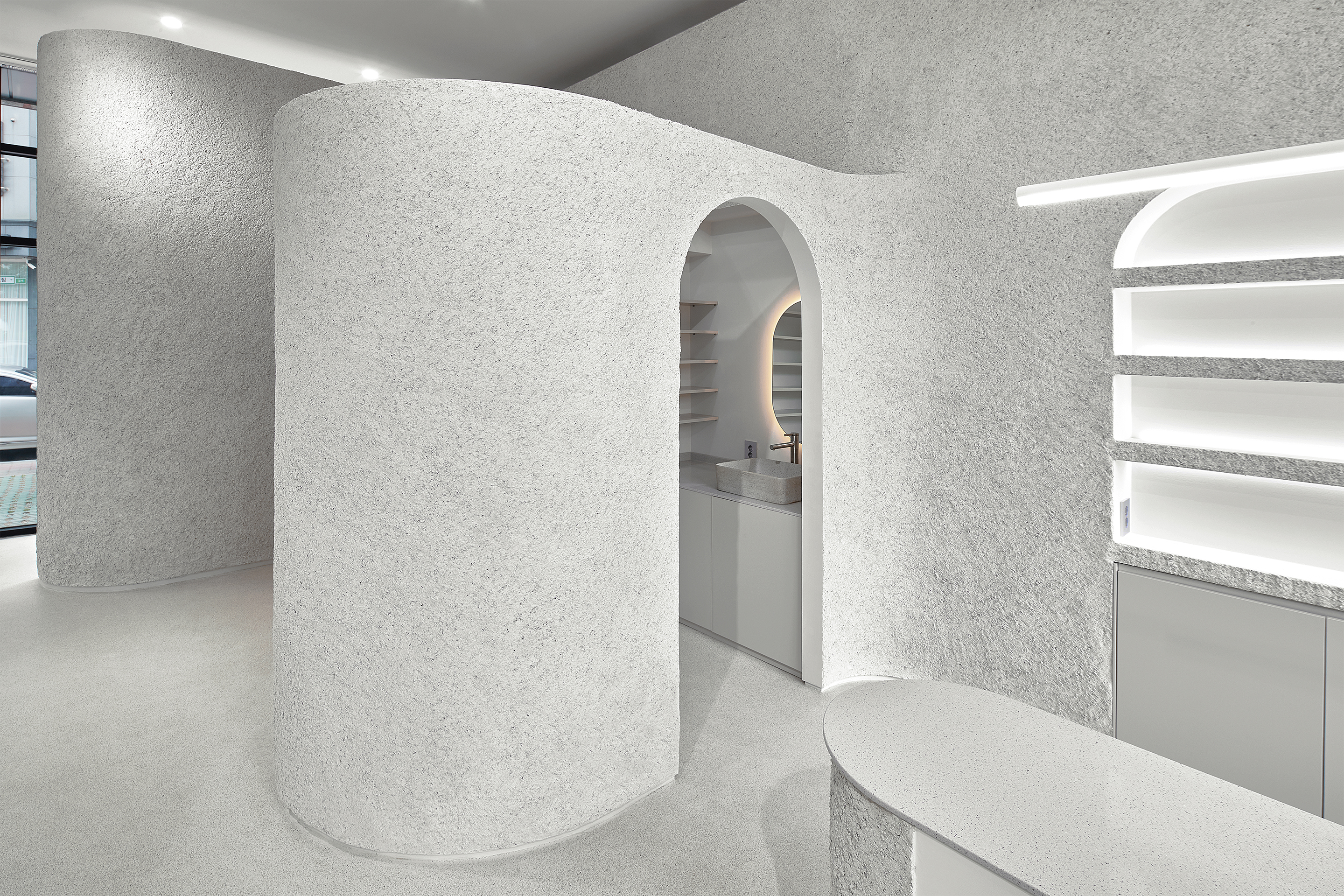 먼저, 유기적인 형태를 띠도록 곡면을 테이블과 가벽에 적용했습니다. 각 곡면마다 단의 차이를 줘 내부 공간이 하나의 조형처럼 보이도록 했습니다. 또한, 종석 미장 긁기를 입체적인 곡면에 입혀 시간 변화에 자연스럽게 반응하는 다채로운 양감을 부여했고, 무채색인 단일 톤에 대비되는 생기 있는 외부 조경을 내부로 끌어들였습니다. 오영네일살롱에서만큼은 일상에서 벗어나 잠시 환기 할 수 있는, 비일상적인 공간이 되길 바랐습니다.