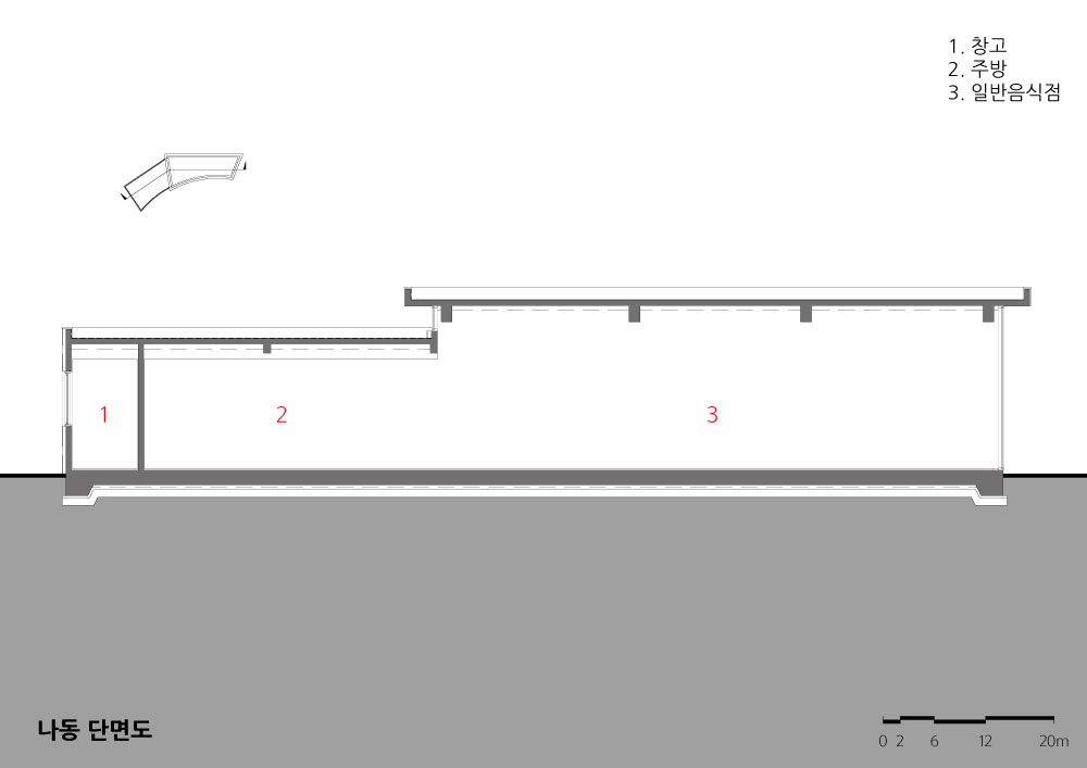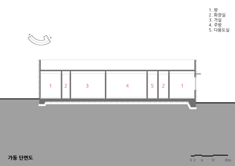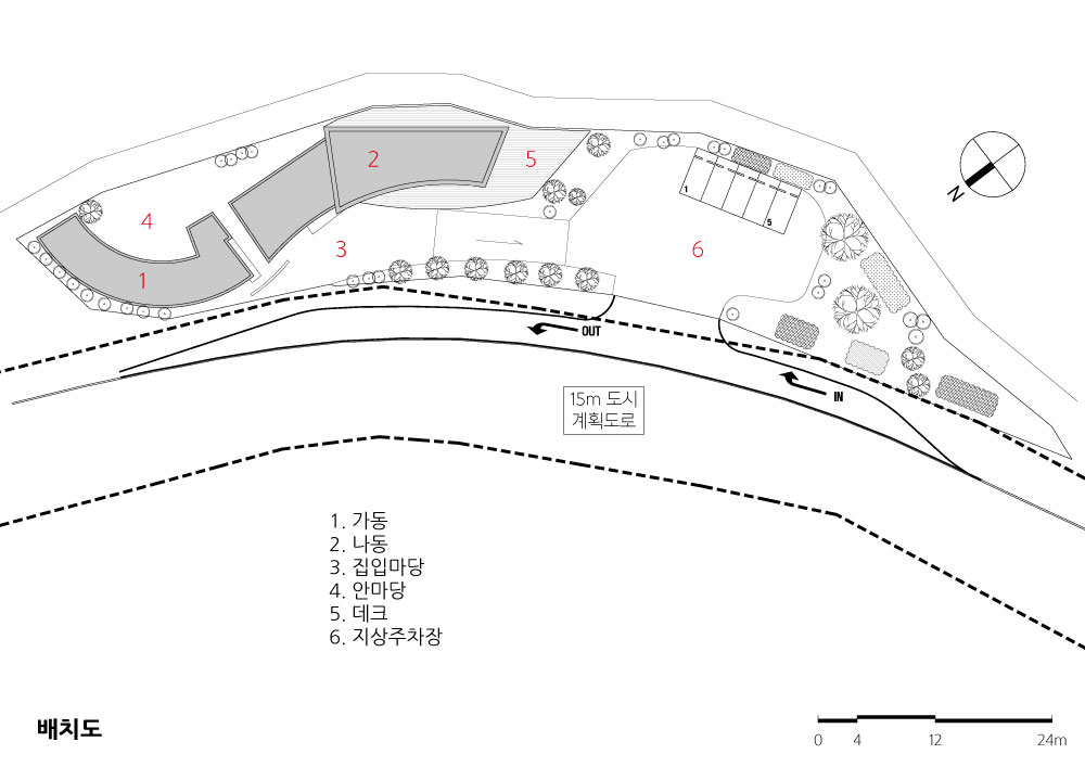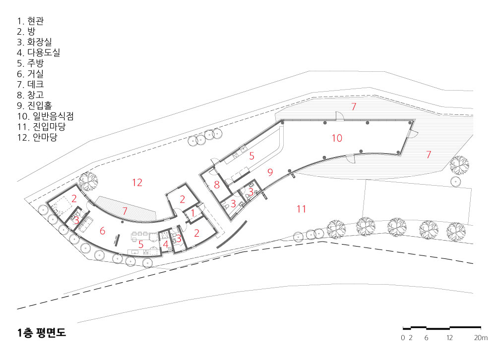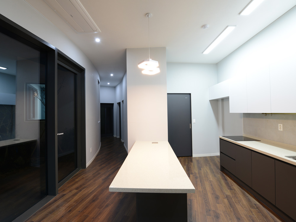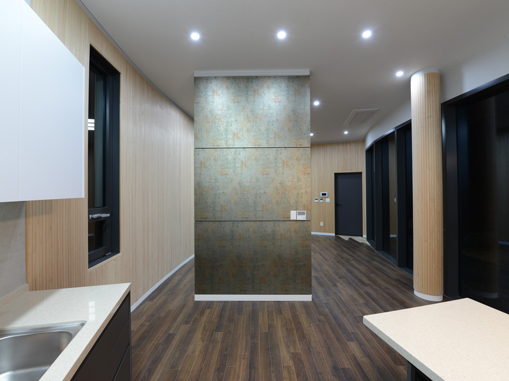 The mass is connected to the building so that the building can be unified from the outside, so that the house and neighbourhood living facilities are united. The outer walls of the building are shaped like a taegeuk pattern. While trying to express nature and beauty, he pursued a clean image through simplicity and modernity. By utilizing the characteristics of Jeju, the basement and trees are used to form sculptures and outdoor spaces, harmonizing with the surrounding environment. Pedestrians and vehicles are separated to improve the usability, traffic flow and safety. In the single family house, Considering the incense and the view, the courtyard is located on the south side. This provides protection from the noise and visability from the road which are blocked by the outside wal. The living room, which is spread out in a curve inside the house, has an organic connection with the deck and the courtyard, securing the openness between the inner and outer spaces. The living room and kitchen, including the common part and the private parts, are planned to fulfill its role as a residential space. The cafe increases accessibility and openness to the road, which enhances its functionality for users. The building and the external space (deck, tree) are connected with each other to make the users comfortable. In the upper part of the north elevation, a window was installed to induce the gaze to the south, so that the inside of the building could breathe. There is a sign above the entrance saying ‘MASIL’. MASIL, refers to playing around in a village or neighbourhood. We hope to build a village in a Jeju rural village and provide a rest space for all of us with our neighbours.