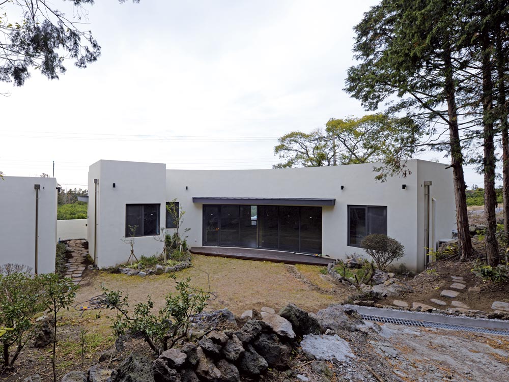 북쪽에서 남쪽으로 길게 펼쳐지고, 경사가 있는 대지에 건축주는 자연을 그대로 보존하면서 쉼의 공간을 만들 고자 했다. 자연과 함께 호흡하고, 제주의 주변마을과 어울리는 건물을 만들고자 성·절토를 최소화하고, 남향 을 고려해 최대한 일조량을 높일 수 있게 건물을 배치했다. 2개 동의 건물이 조형적으로 하나가 될 수 있도록 가벽을 설치하여 두개의 동(건물)을 연결하고, 주택과 근린생활시설이 조화를 이루도록 했다.