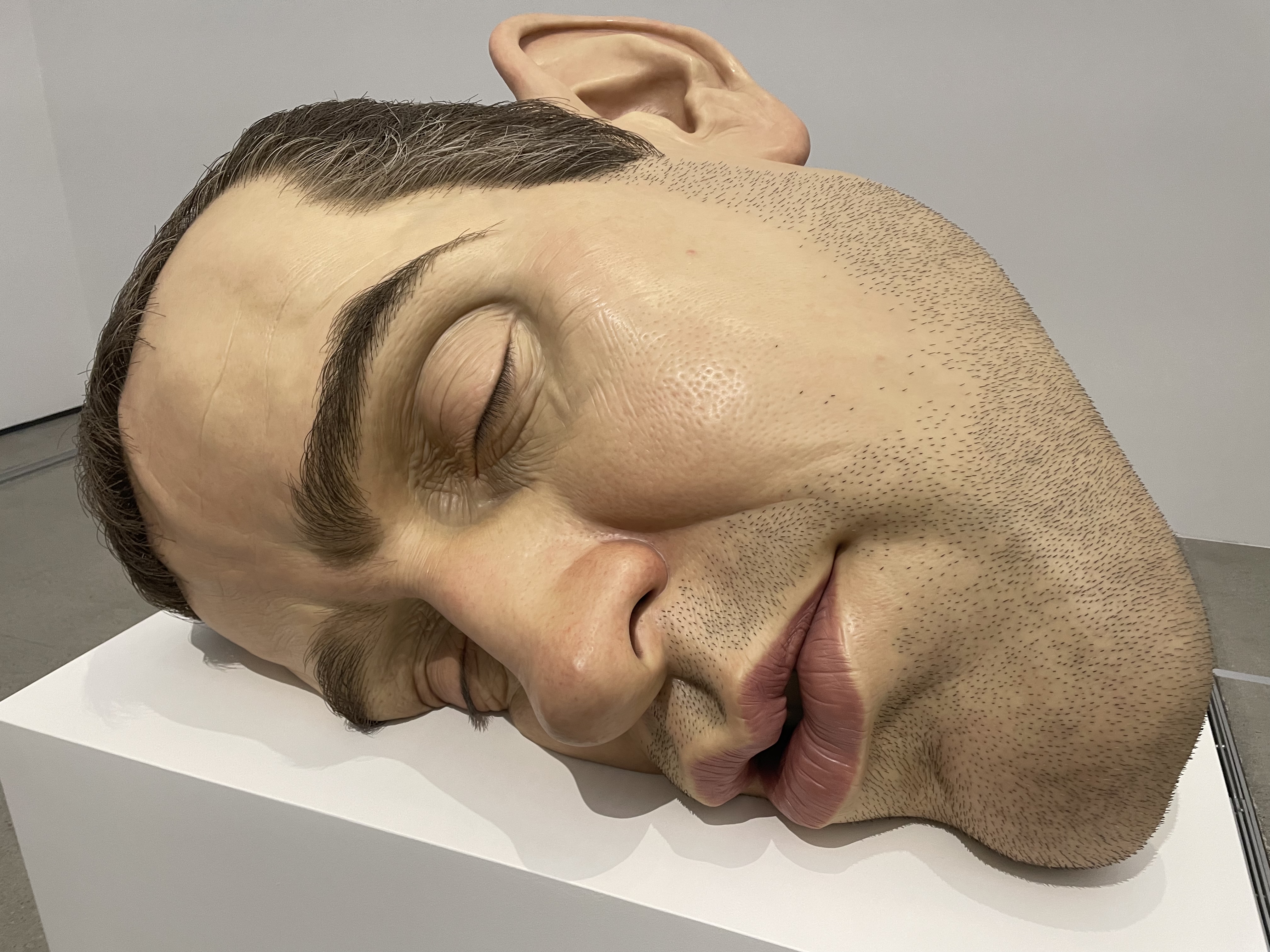 그는 1대1 스케일로 조각을 제작했다. 론 뮤익이 다른 점은 극사실주의적으로 재현한 대상을 2배 이상으로 키웠다는 점이다. 그리하여 얼굴의 주름이라든지 머리카락, 몸에 난 털이 갑자기 낯설어진다. 그뿐 아니라 얼굴의 형태, 눈, 코, 입도 평소 보지 못했던 것 같은 착각이 들 정도다. 그러니까 익숙했던 대상이 반가운데, 그 반가운 대상이 다시 낯설게 느껴지는 감상, 그것이 론 뮤익 조각이 관객에게 선사하는 즐거움이다.