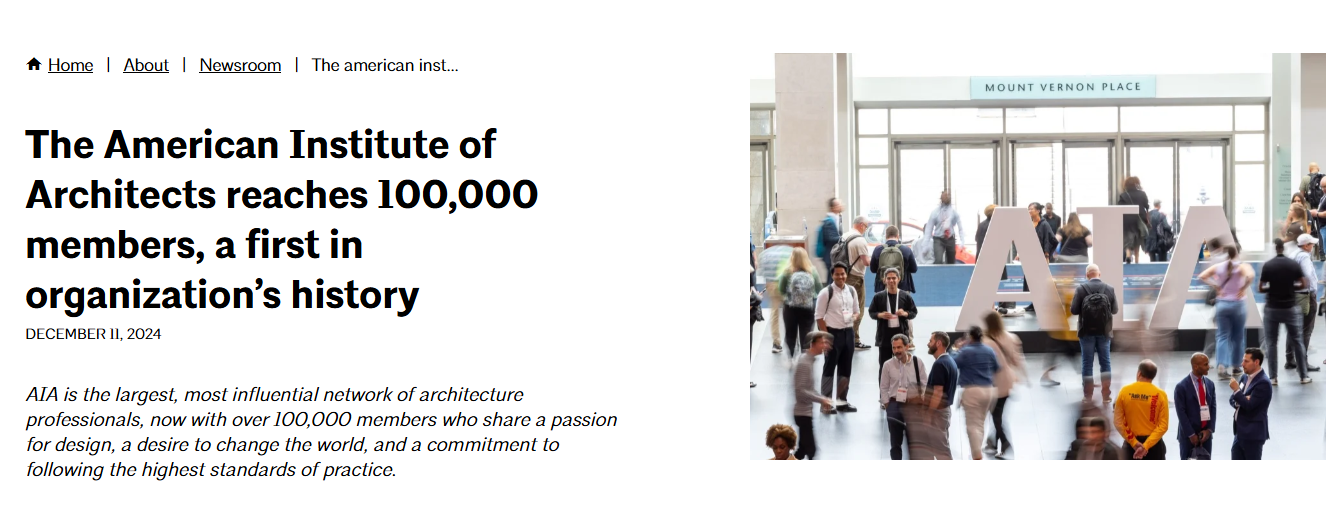 전 세계에서 가장 큰 건축사 단체인 미국건축사협회 American Institute of Architects는 작년 12월 기준 회원 수 10만 명을 돌파했다. 처음 창립된 1857년 단 13명의 회원으로 시작한 이 단체가 이처럼 성장한 것은 미국 경제와 사회가 그만큼 성장했다는 것과 더불어 건축이 가지는 중요성이 미국에서 그만큼 중요한 화두가 된다는 것을 의미할 것이다.
