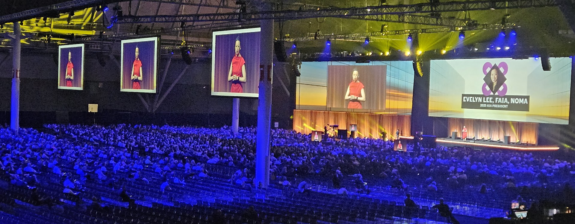 올해 2025 보스턴 대회 개막식에서 인상적인 부분은 올해 AIA 회장을 맡은 에벌린 리 Everly Lee 회장이다. 작년 회장인 Kimberly Dowdell과 그전 회장 Emily Grandstaff-Rice 회장 뒤를 이어 다시 여성 회장이 미국 건축계를 이끌고 있다. 그녀는 AIA의 101대 회장이다. 여성회원 비율은 이제 AIA 전체 회원의 25%를 넘으면서 여성 건축사들이 더욱 활발하게 활동하고 있다.