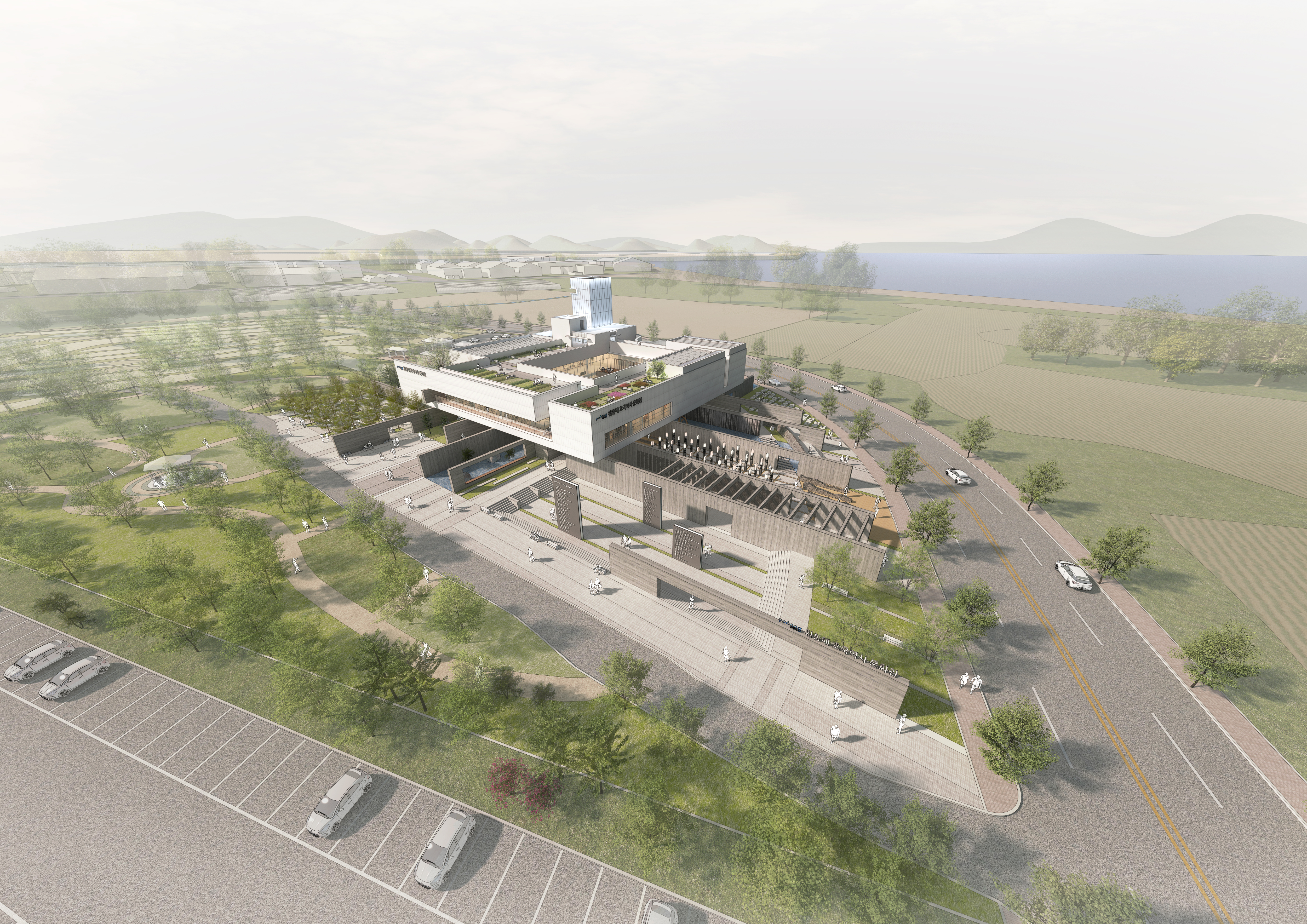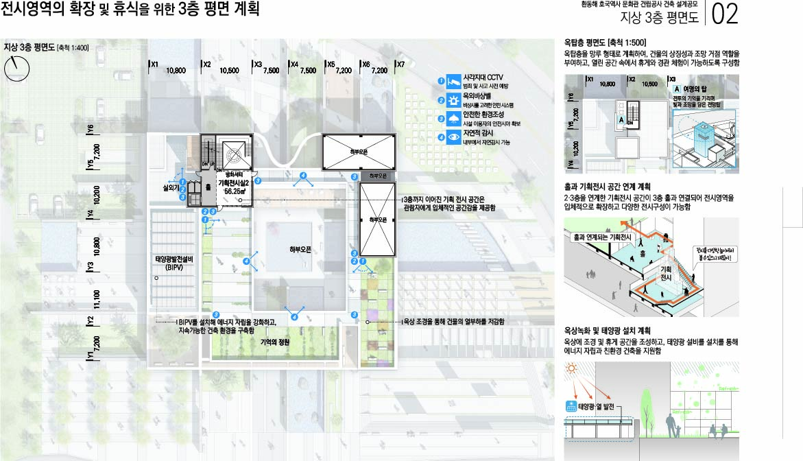 대지 앞 개설 예정인 20m 도로와 대지 옆 파크골프장 예정지의 주차계획을 고려해 보행 및 차량의 접근을 분리시켰고 도로와 주변 프로그램에 따른 소음 및 진동을 최소화하기 위해 대지의 중간에 매스를 배치했다. 그로 인해 생긴 대지 내 실외공간에 전쟁 당시 발생했던 전투들을 테마로 하는 다양한 외부 전시공간들을 계획하여 사업대상지 전체를 하나의 전시공간으로 구성하고 이들을 통해 방문객을 건물 내부로 진입할 수 있도록 했다. 중정 형태를 통해 자연채광을 들이면서, 중정을 중심으로 하는 순환 동선을 계획하여 각 프로그램들 간 연계가 가능하도록 했다. 입면은 호국의 성격을 고려한 상징적이며 인지성이 높은 이미지를 제공하고자 했으며 높은 매스 부분은 망루공간을 계획하여 환동해의 조망을 확보하도록 계획했다.