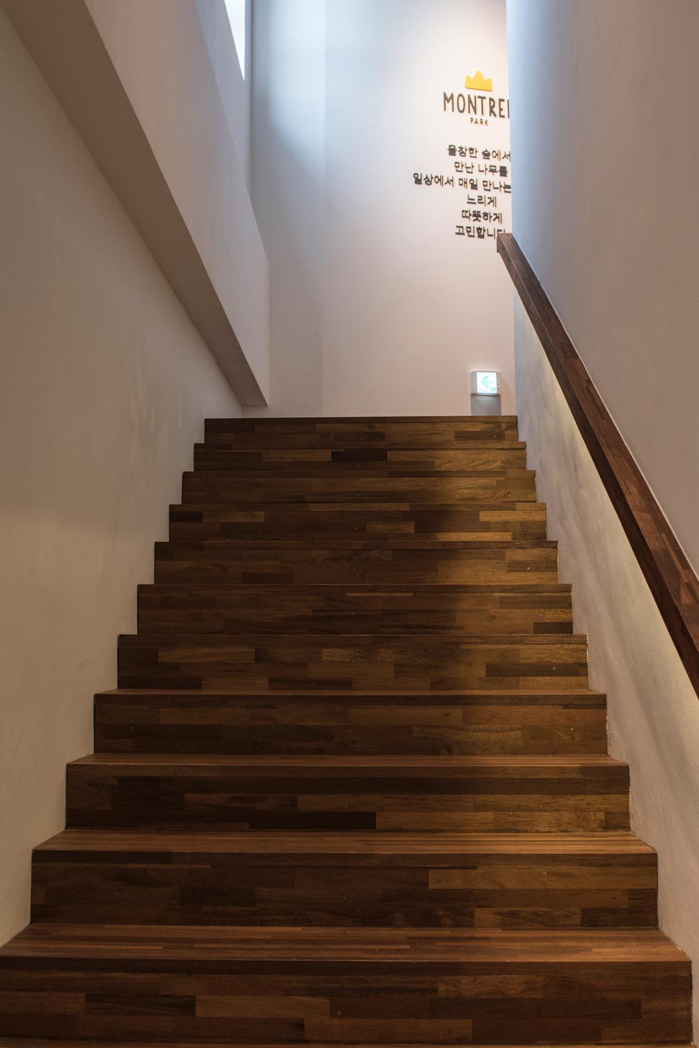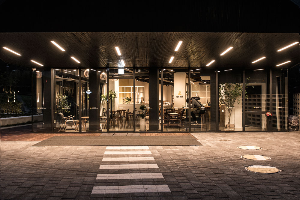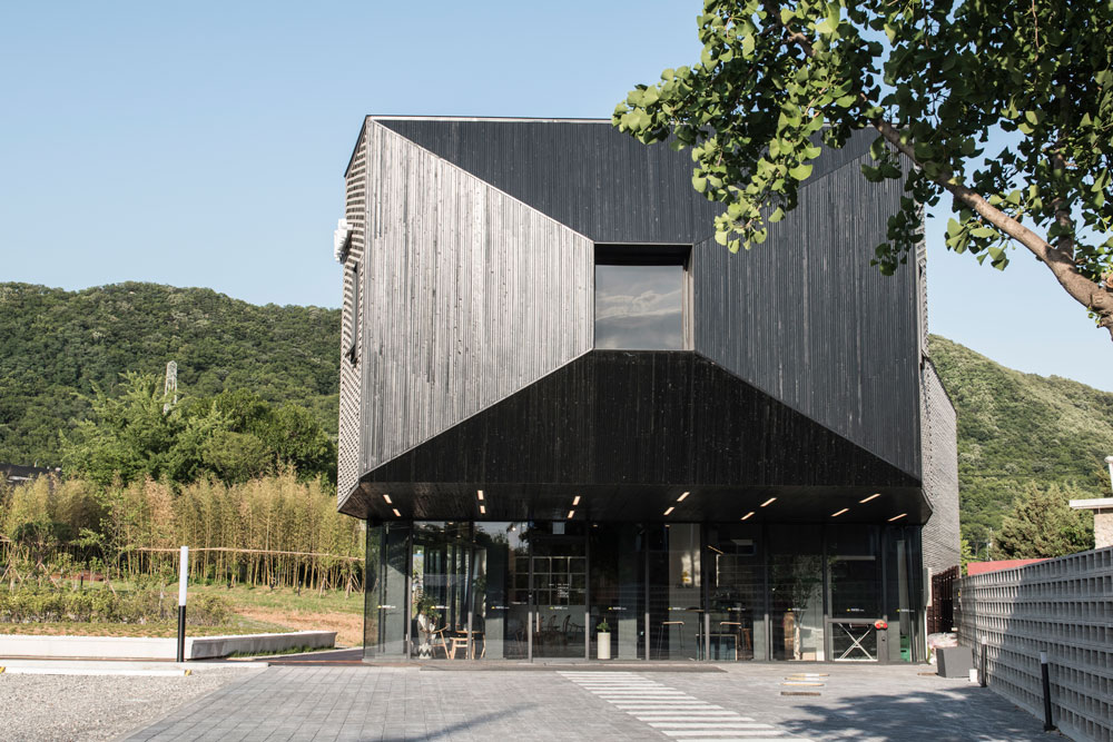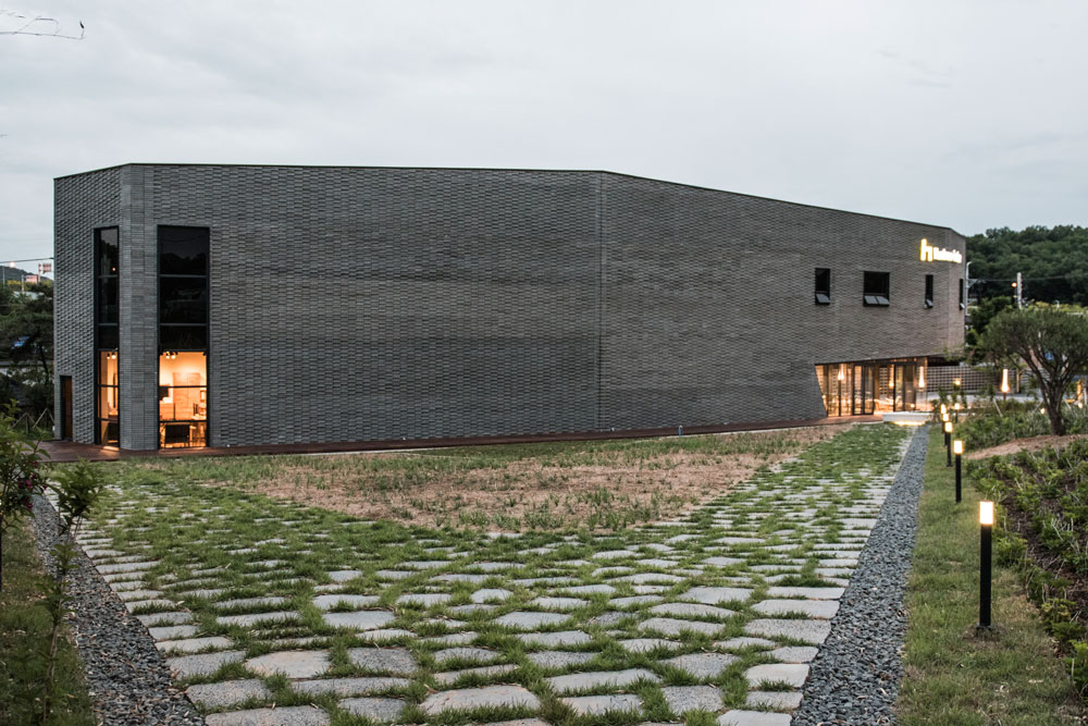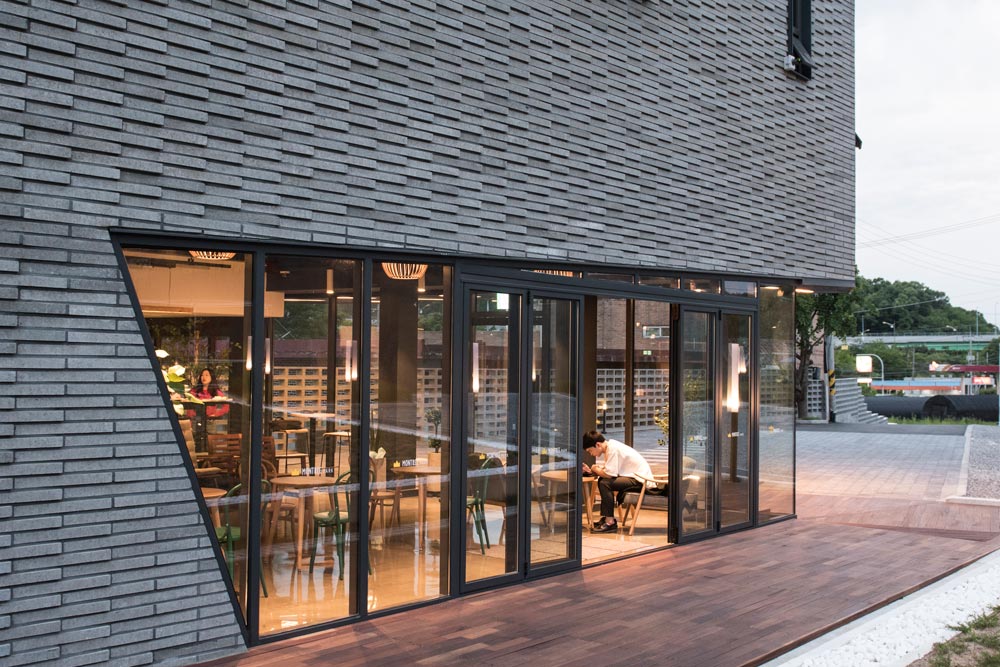 외부마감에는 무채색 계열의 큐블럭(회색계열벽돌)과 블랙 스테인 적삼목을 사용해서 건물이 주변환경과 조화를 이루고 차분하고 세련된 이미지로 대지에 앉아 있길 원했다. 가로로 긴 벽면이 다소 부담스러울 수 있기 때문에 큐블럭 재료를 비틀어 쌓기 방식으로 마감을 해서 보는 위치와 태양의 이동에 따라 입면이 다채롭게 보일 수 있게 계획했다. 전면은 얼굴과 같은 모습이기 때문에 블랙스테인 적삼목을 조형적으로 계획하여 들어오 는 사람들을 맞이 할 수 있게 하였다.